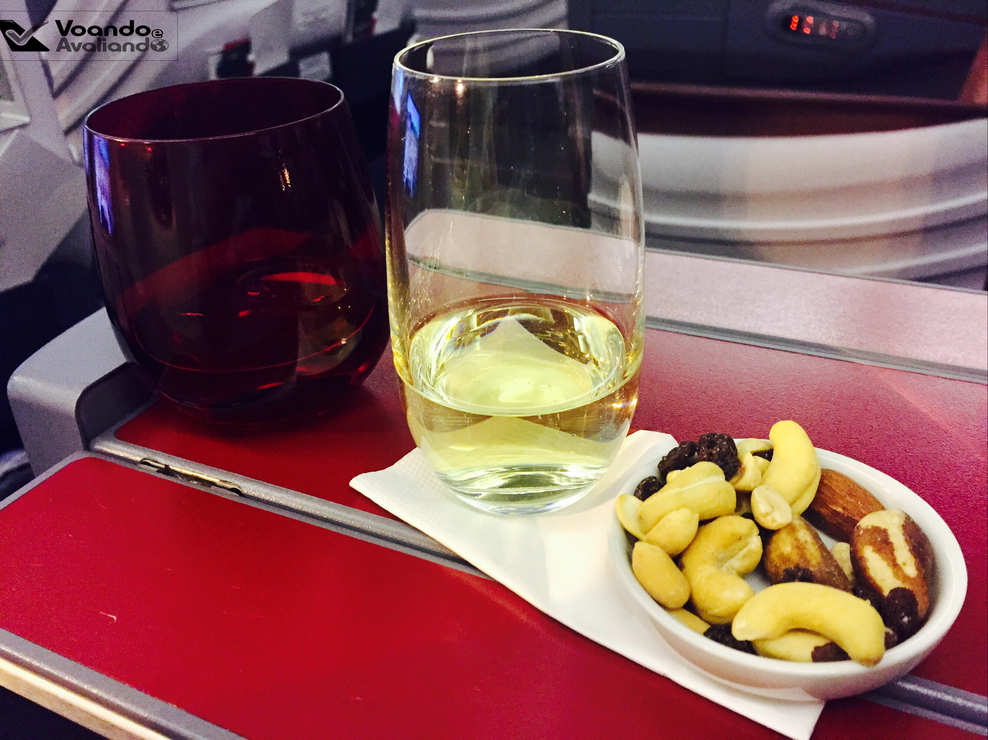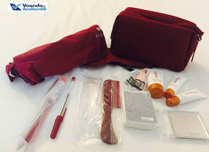 – logo depois, o tradicional welcome drink foi oferecido pela Comissária e eu considero um pecado recusar: champagne e água com gás, acompanhados de um potinho de castanhas e passas; em seguida, ela veio com um carrinho onde tinha uma variedade de jornais e revistas e também distribuiu a necessaire com produtos da grife italiana Salvatore Ferragamo (este kit amenities da LATAM é completo, tem tudo que um passageiro precisa para um voo)