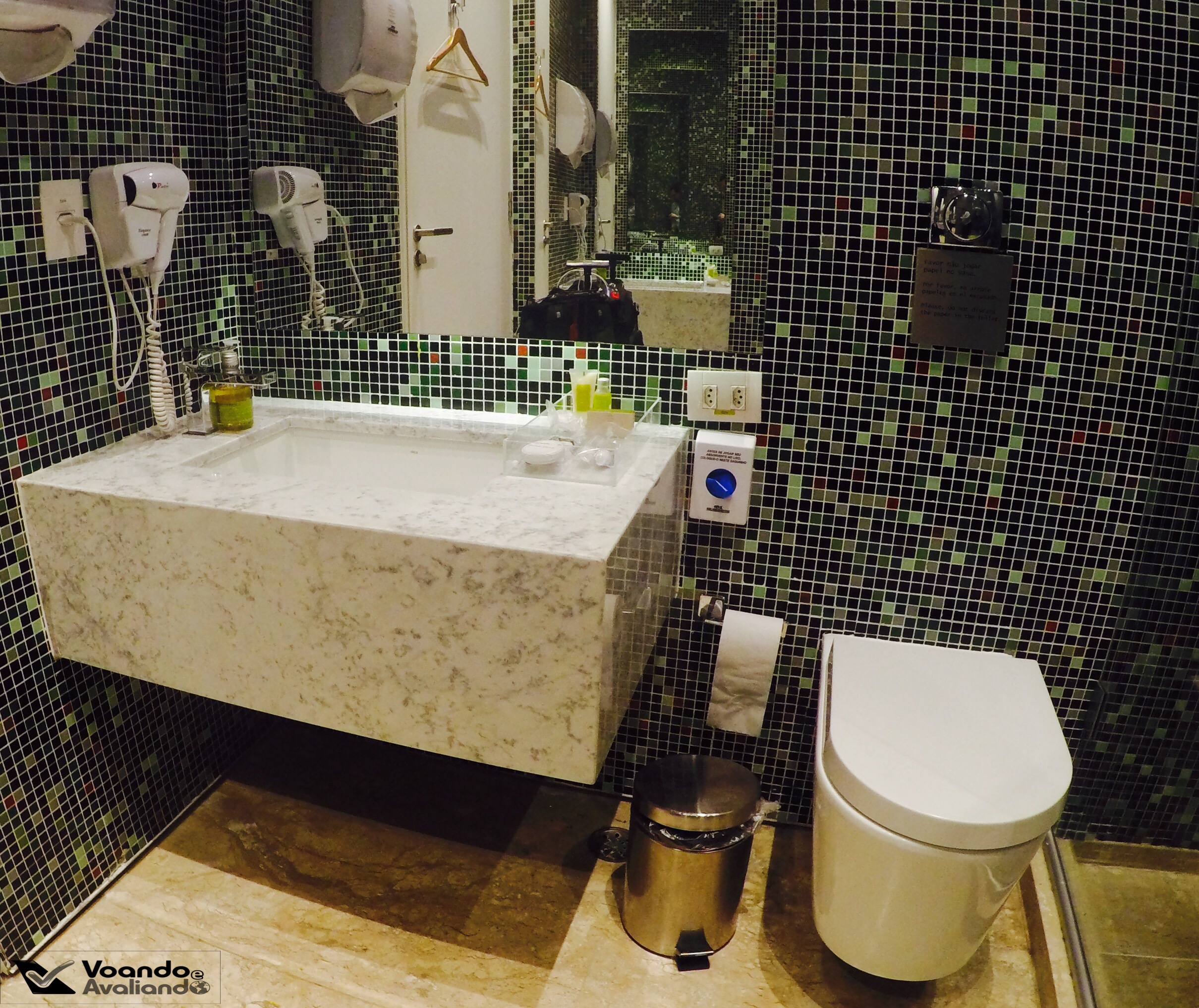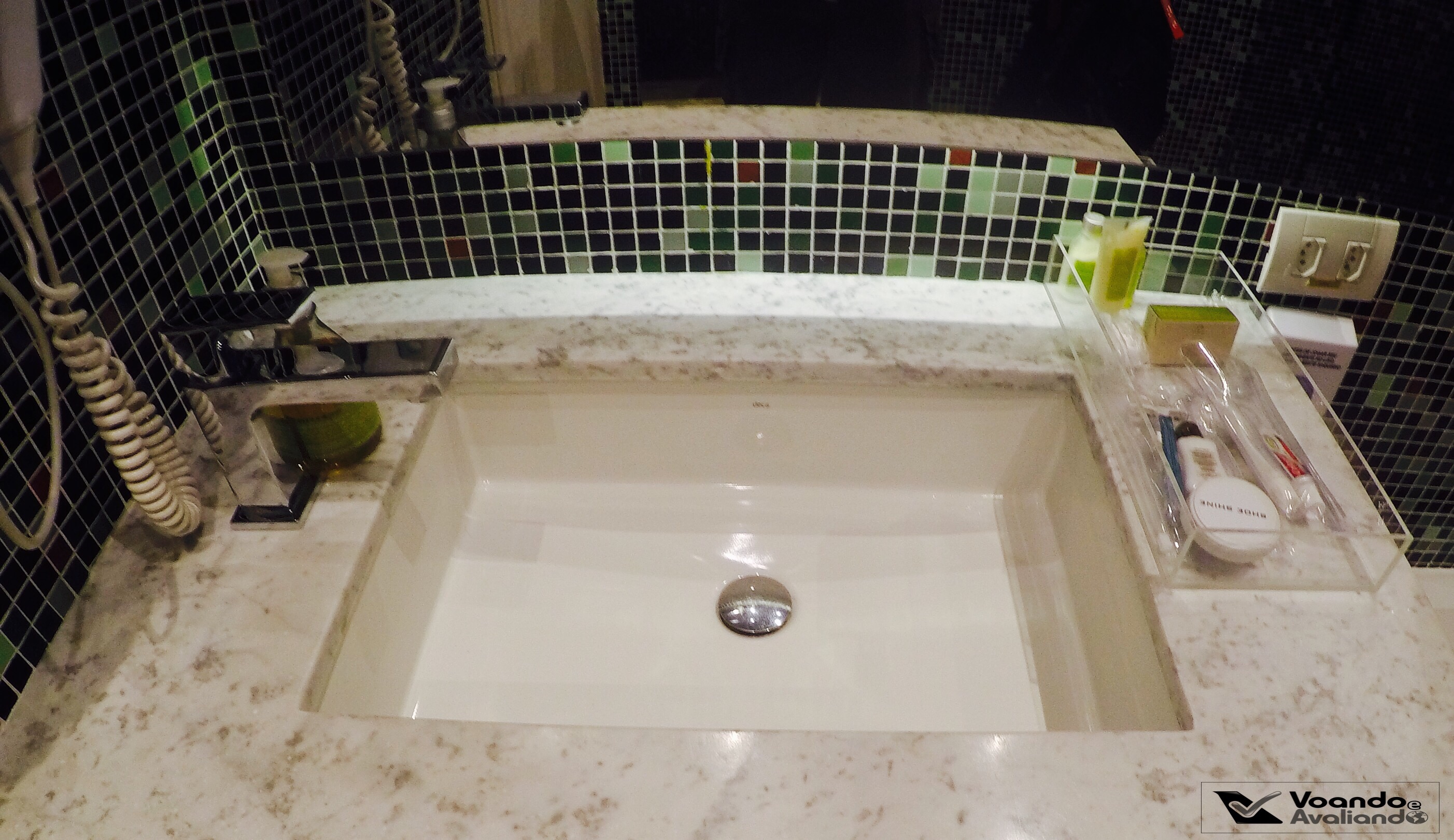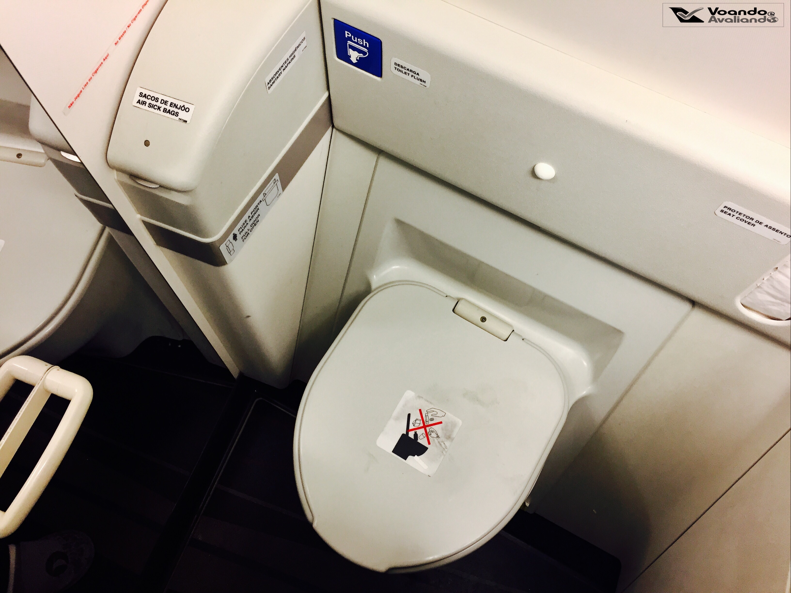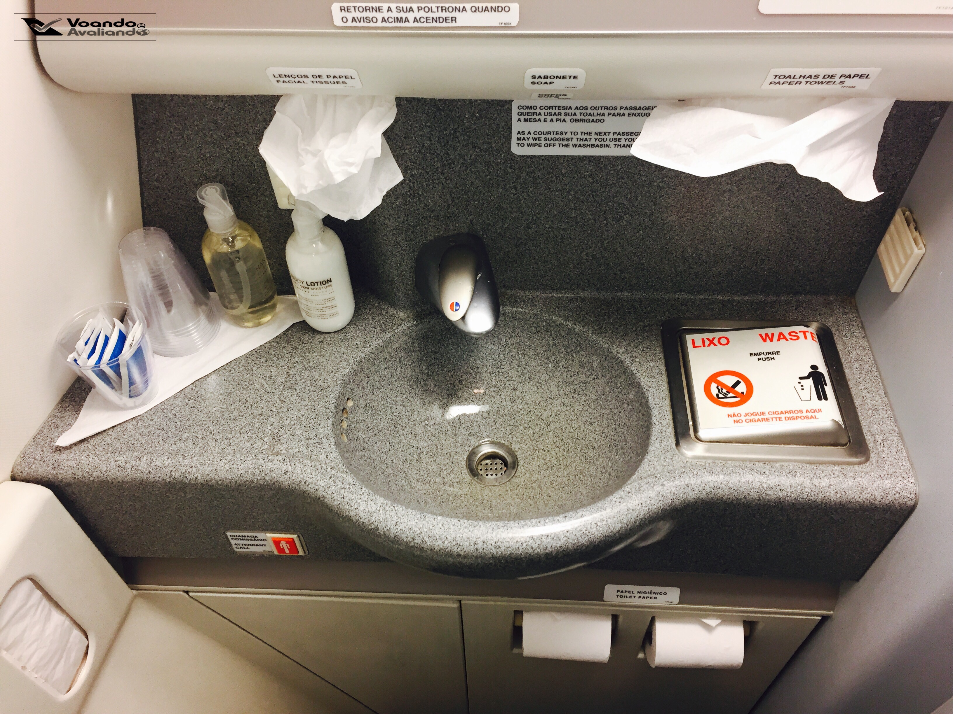 – quando acordei, fui ao banheiro (são 02 banheiros dedicados aos passageiros da classe Executiva, localizados na parte da frente da aeronave); o tamanho é apenas razoável; lencinhos umedecidos “genéricos” (sem a logomarca da LATAM) estão disponíveis em um copo de plástico na pia