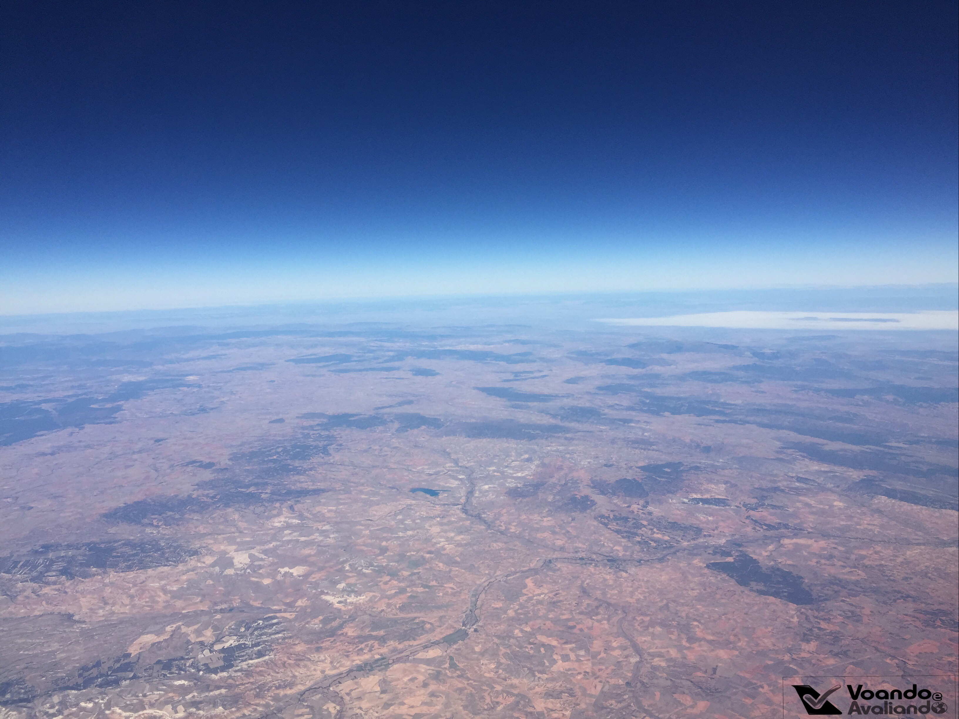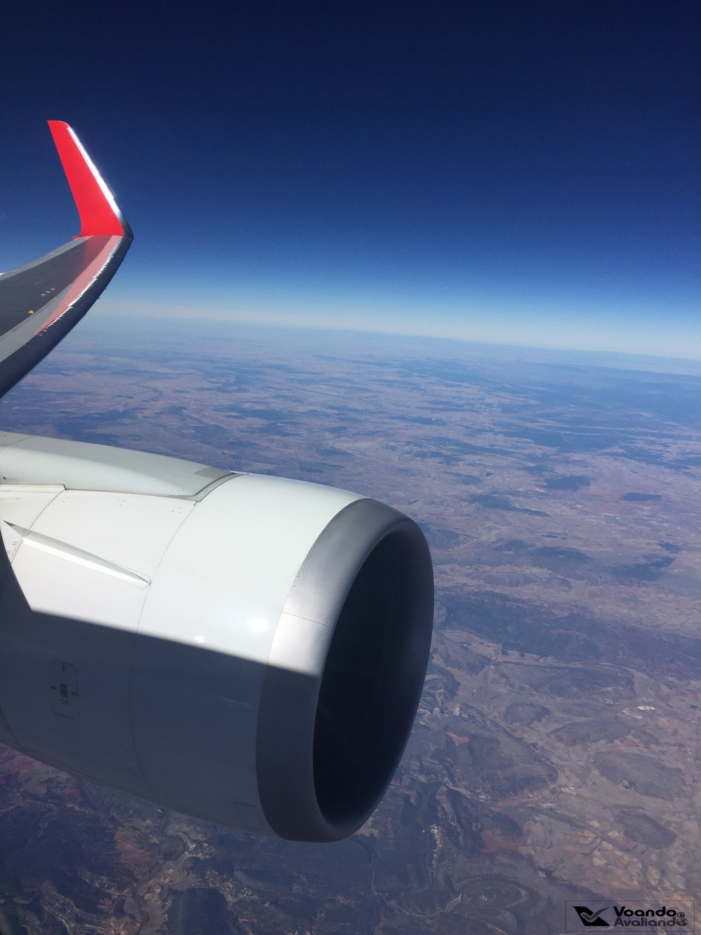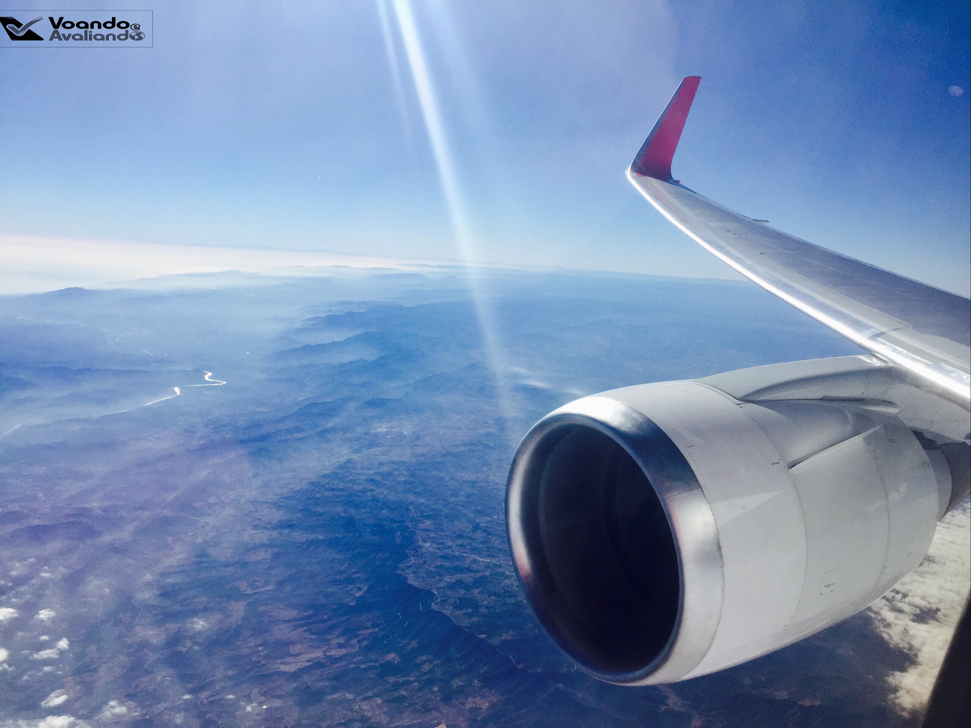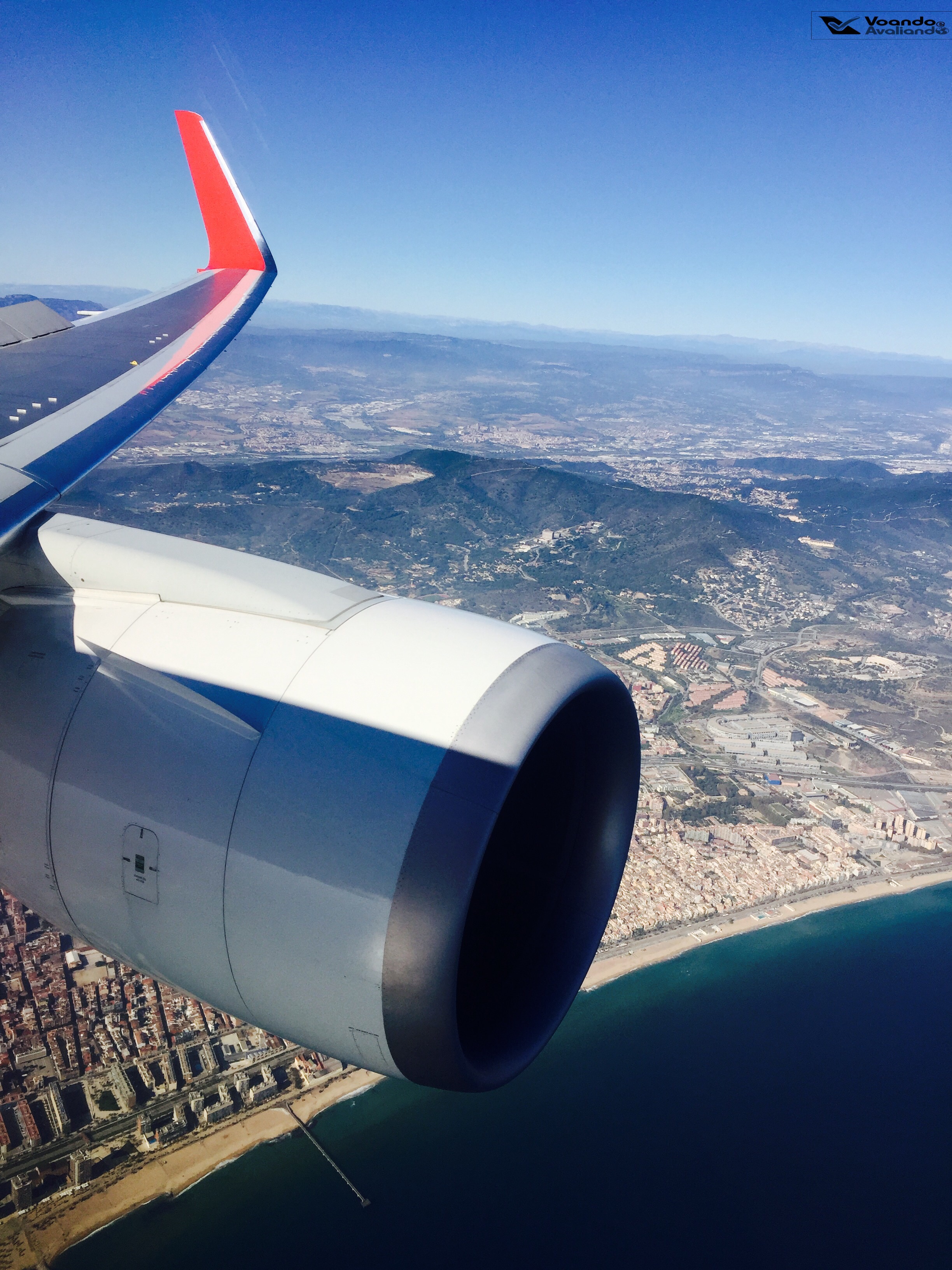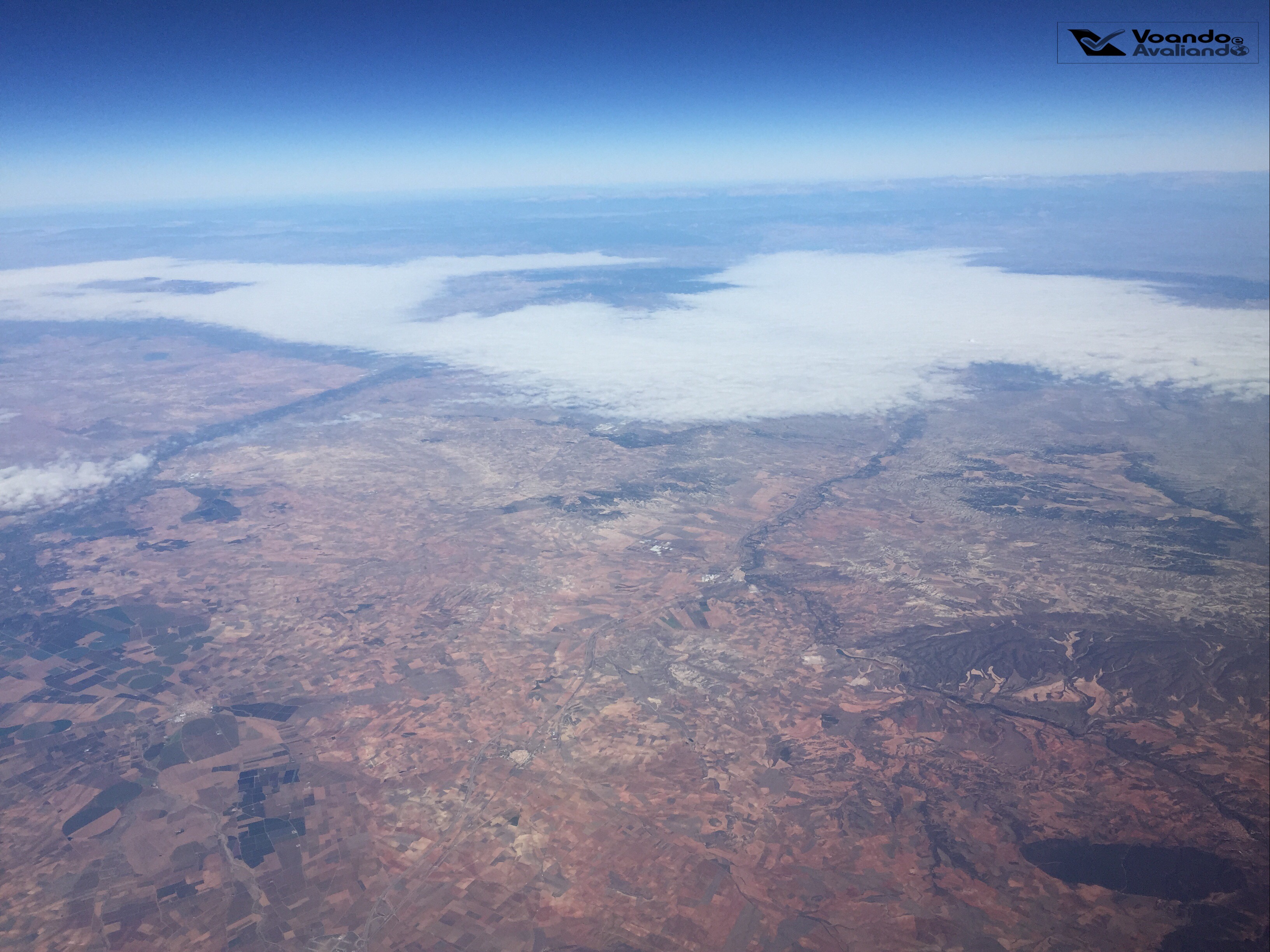 – eram 10:18h (hora do Brasil) quando o Comandante se dirigiu a todos informando que restavam apenas 30 minutos para o pouso em Barcelona; era hora de aproveitar o tempo claro lá fora e tirar muitas fotos, com foco nas turbinas e nos winglets do B767 da LATAM: do lado esquerdo um pouco de sombra, do lado direito, muito sol; a paisagem da terra espanhola, em constraste com o azul escuro do céu, era um show a parte