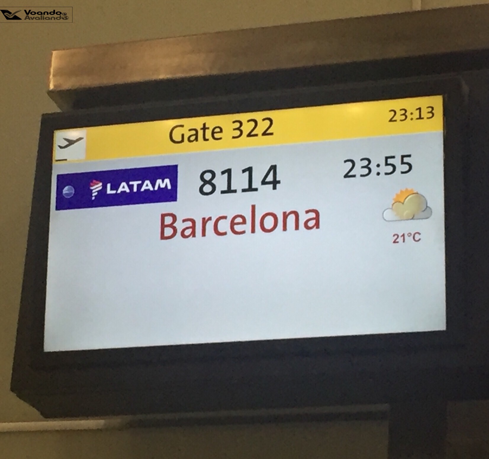 – eram 22:55h (exatamente 01 hora antes do horário previsto de partida) quando foi feito o anúncio pelo sistema de áudio da VIP Lounge de que o embarque do voo JJ8104 com destino a Barcelona estava sendo iniciado pelo Portão 322