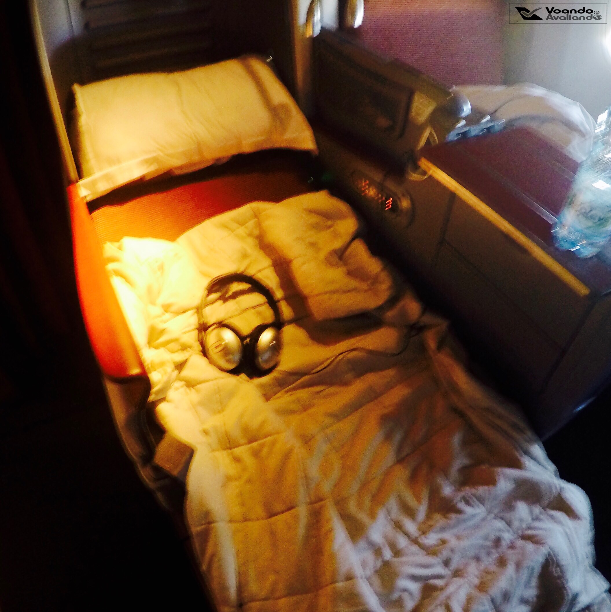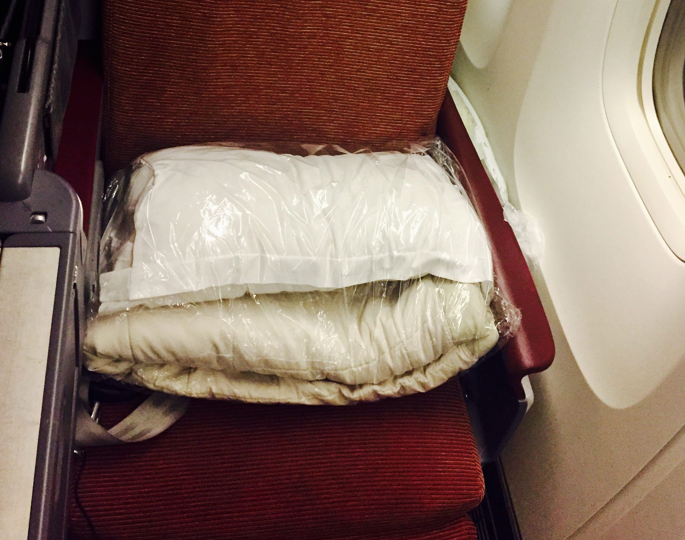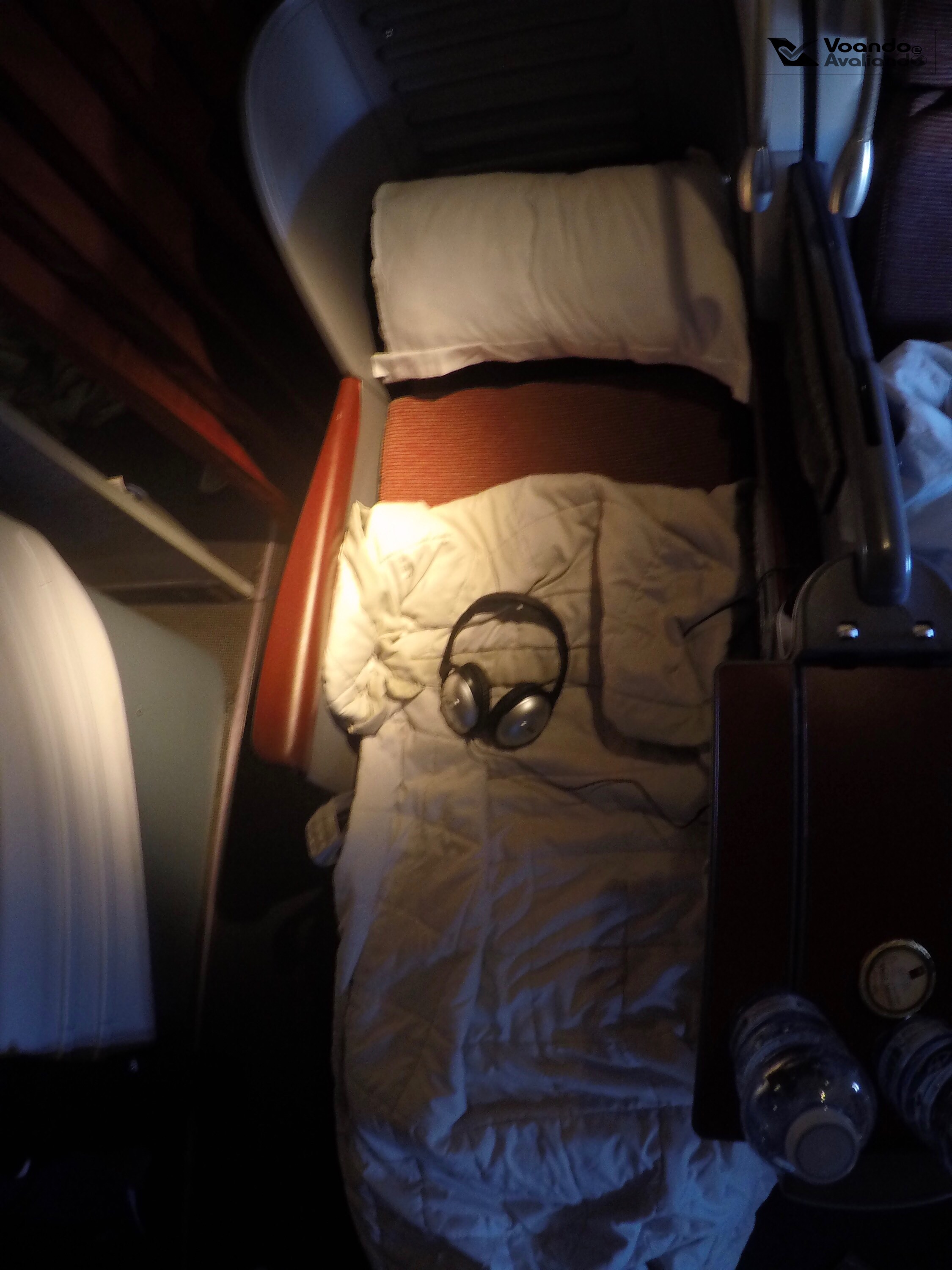 – por volta de 01:40h, a bandeja do jantar já tinha sido recolhida e o sono bateu forte, hora de pedir o conjunto de cobertor (“fofinho” e confortável) e travesseiro (de bom tamanho), colocar o assento na posição full flat (no pequeno painel de controle, há um botão especifico para que a poltrona se torne uma cama) e descansar; neste momento, faltavam 09:15h para chegarmos em Barcelona