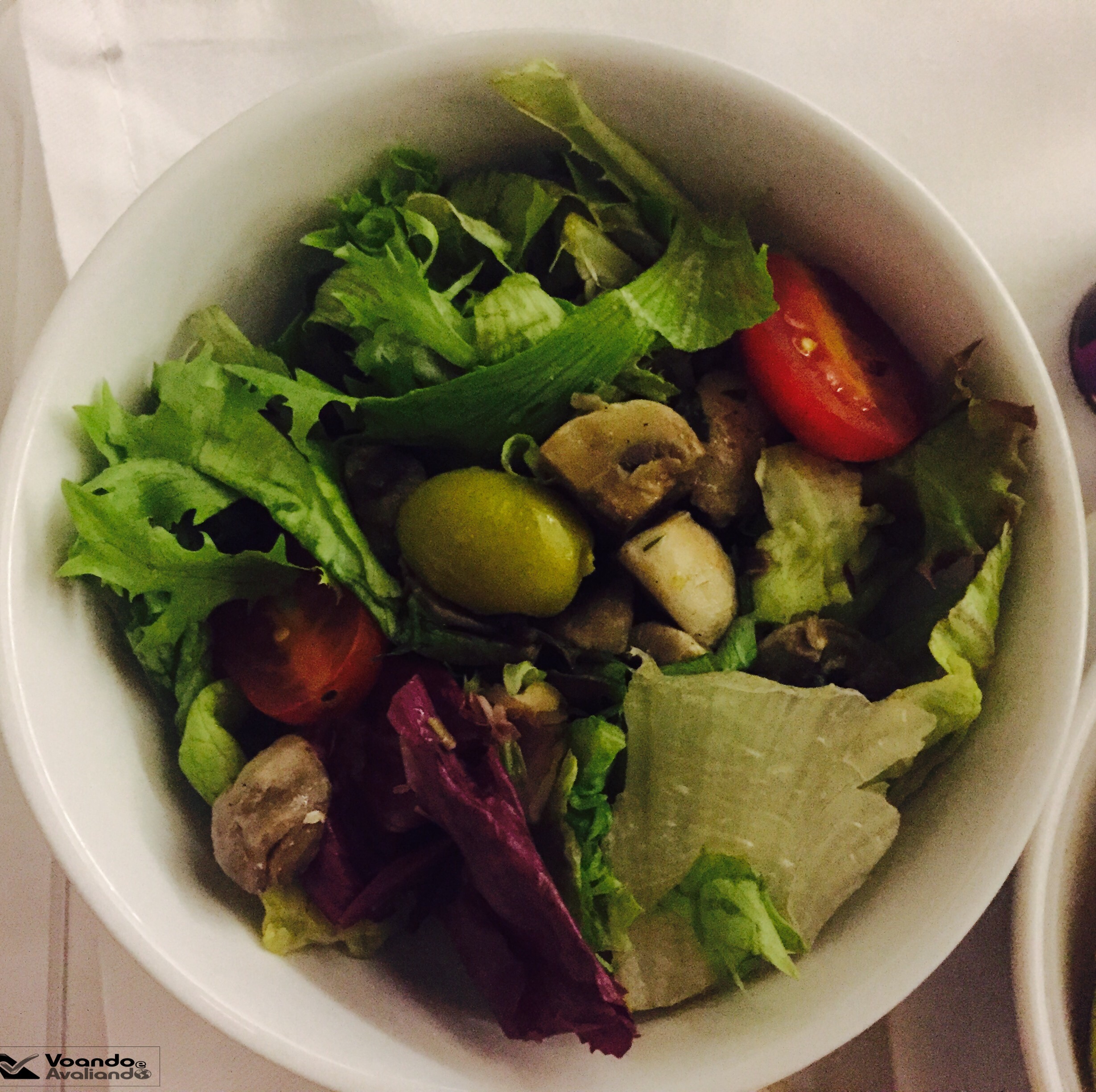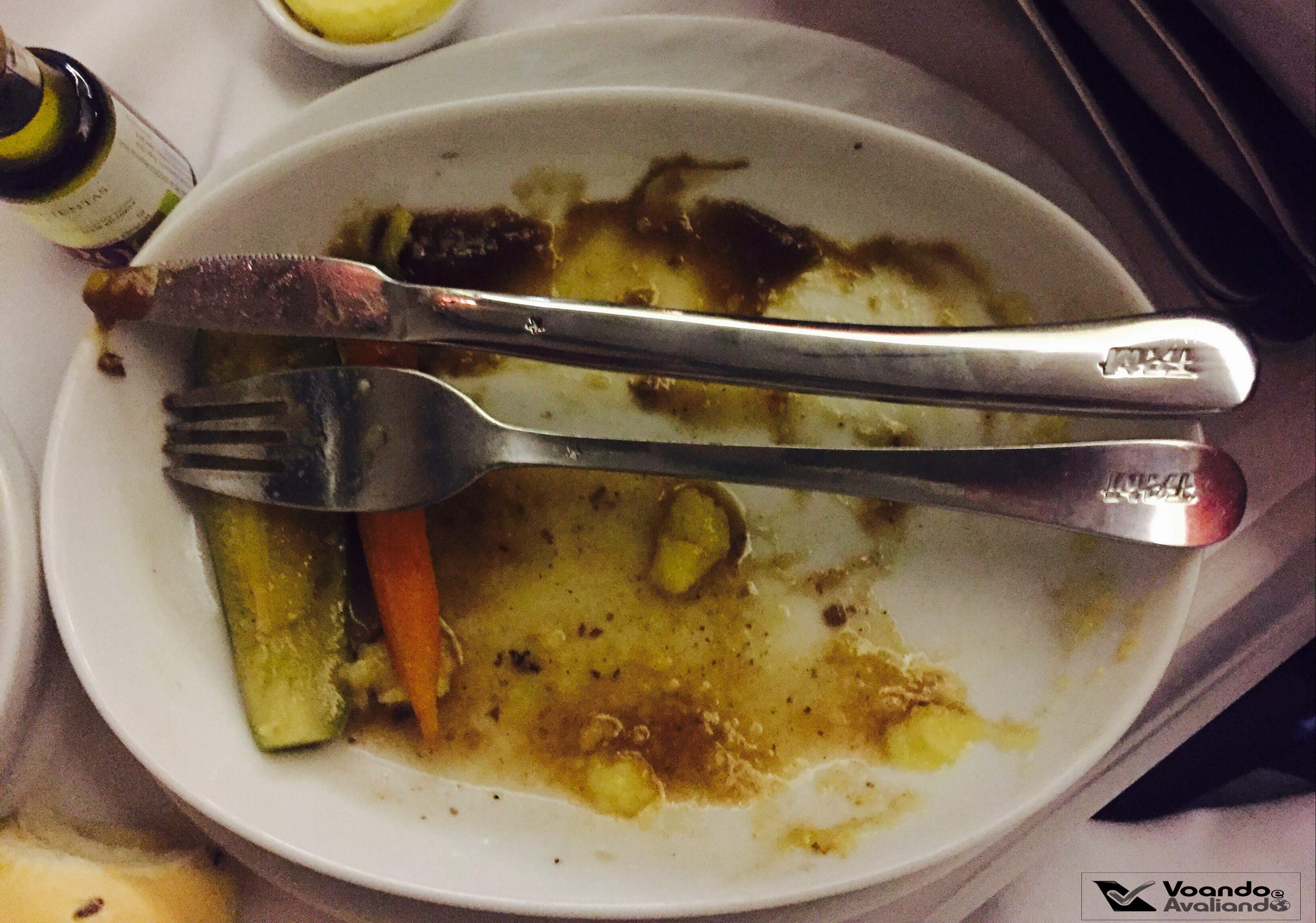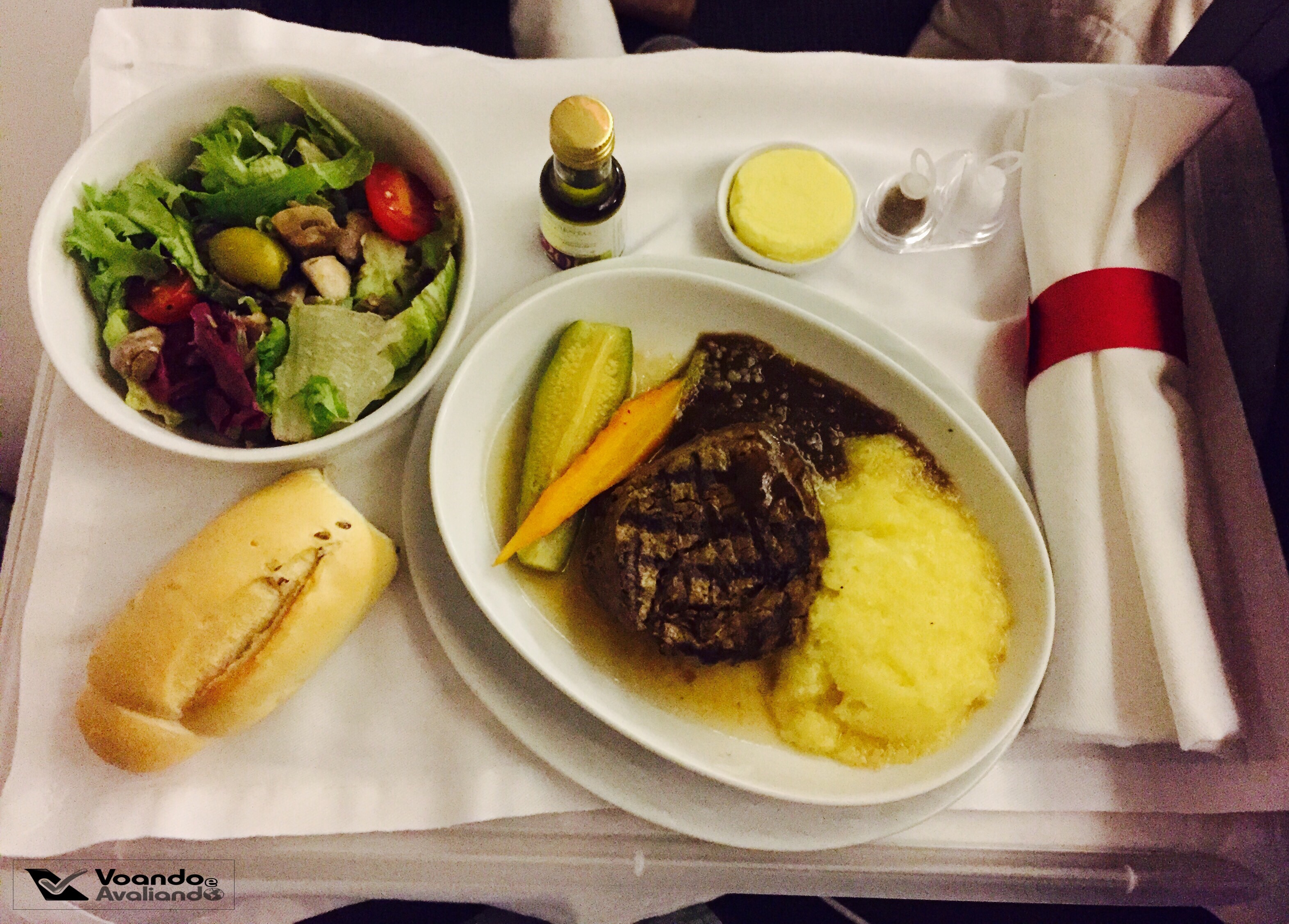 – o jantar foi servido às 01:00h: os talheres eram de aço inox com logomarca da TAM; a carne estava em ótimo ponto e apetitosa, os legumes bem cozidos, mas a polenta cremosa estava um pouco sem gosto; a salada que acompanhou o prato principal estava fresca e saborosa