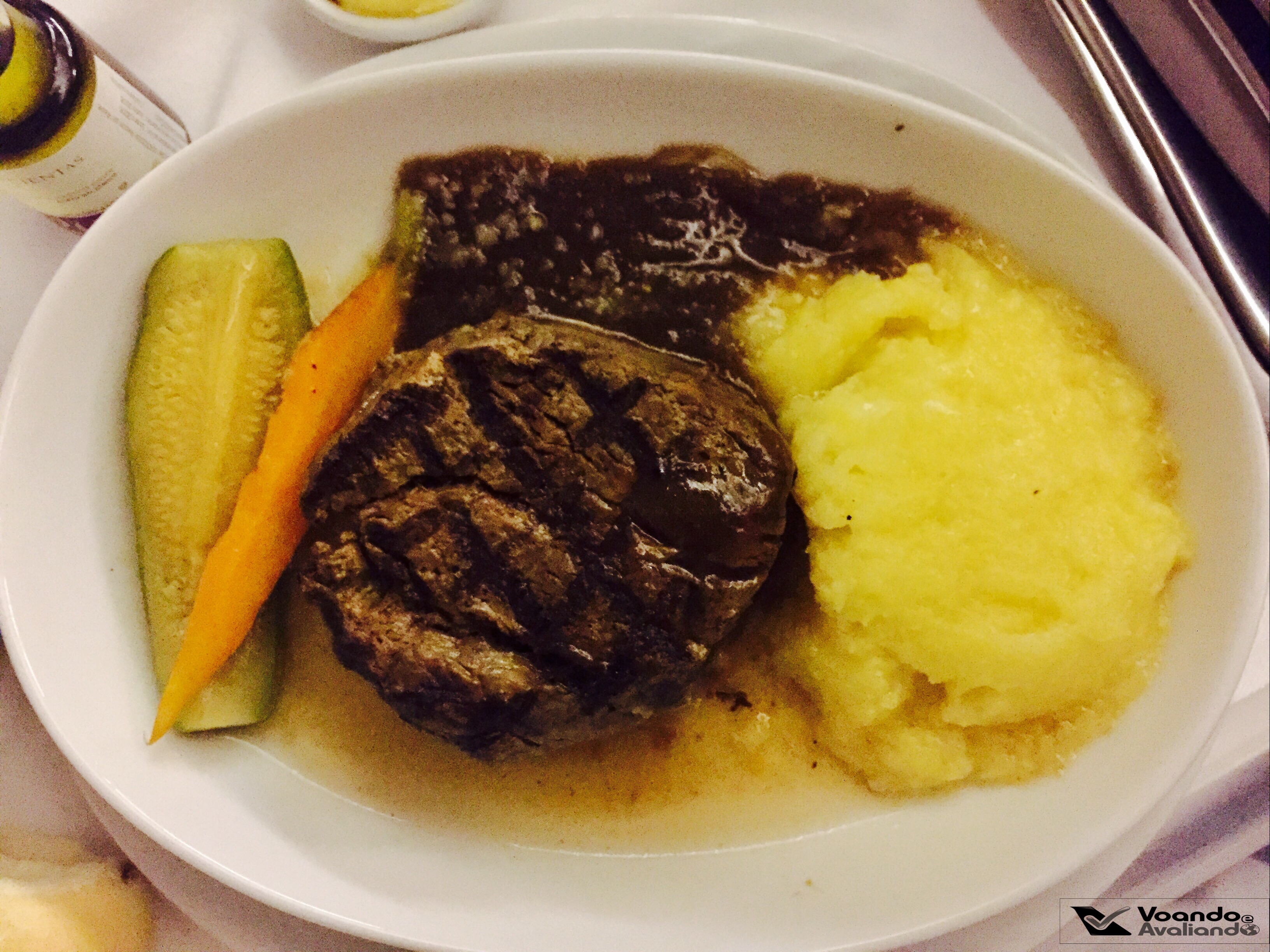 – eram 00:35h quando a atenciosa Comissária Aldrey anotou nossos pedidos de jantar e, desta vez, a “maldição da última fileira” não me prejudicou e consegui escolher a única opção do cardápio que eu gostava: filé grelhado com molho demi glacê e polenta cremosa (ainda bem, pois odeio beringela e não aprecio peixe, as outras opções neste voo)