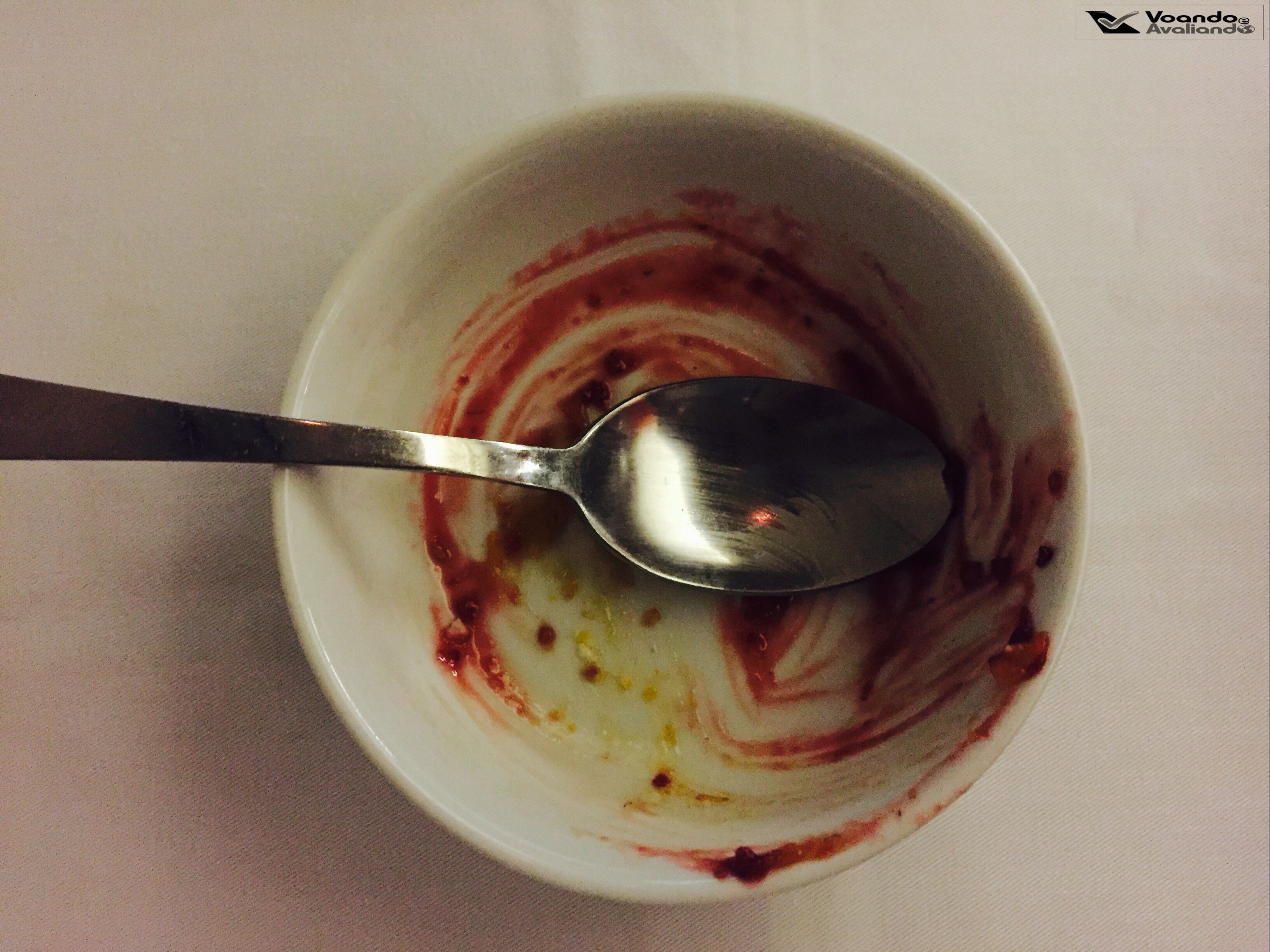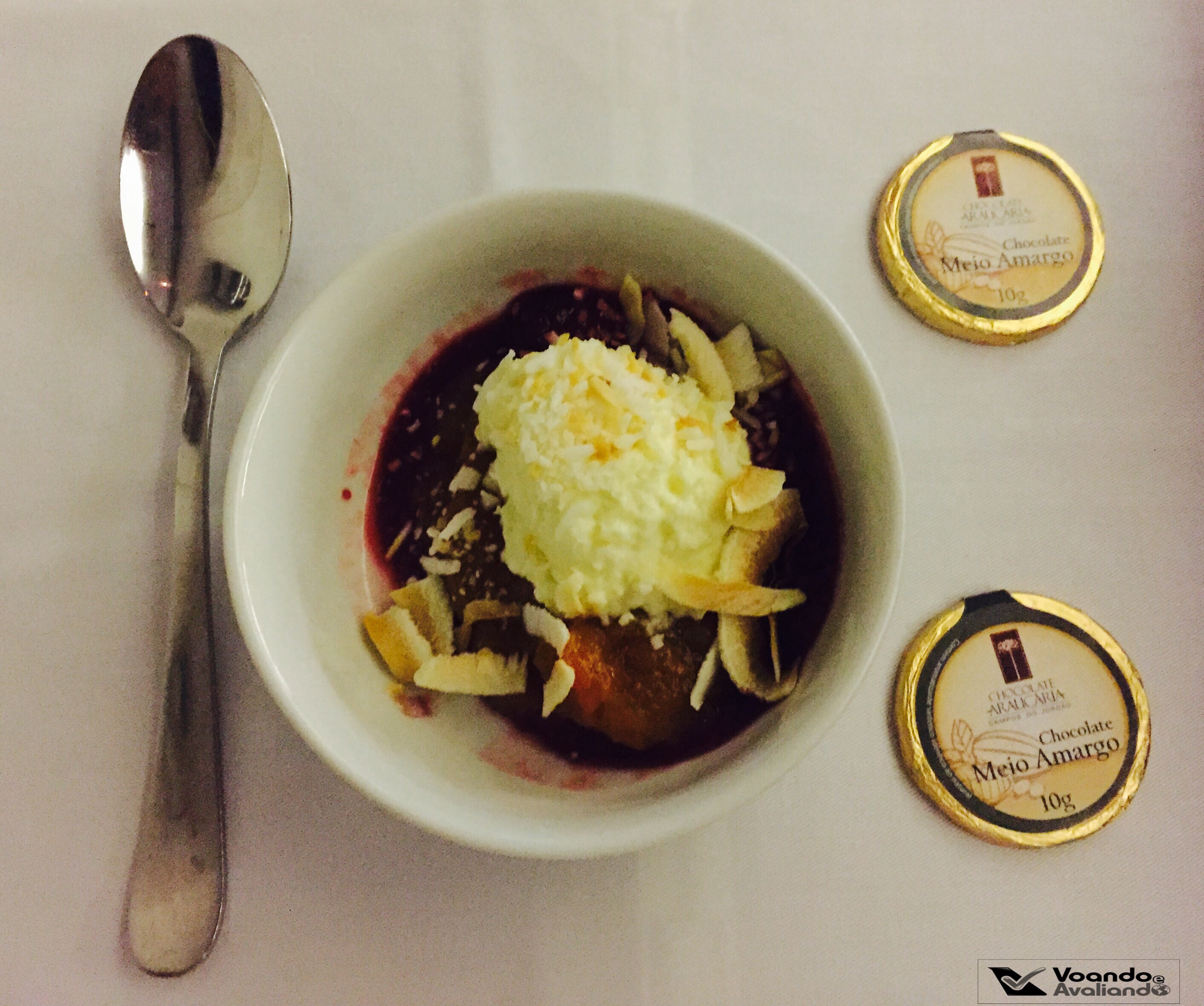– na hora da sobremesa, resolvi variar, pois geralmente escolho o sorvete Haagen-Dasz quando estou voando na Executiva da LATAM; pedi a mousse de leite de coco com calda de frutas vermelhas e foi uma ótima escolha, estava deliciosa; “moedas” de chocolate também foram distribuídas junto com a mousse