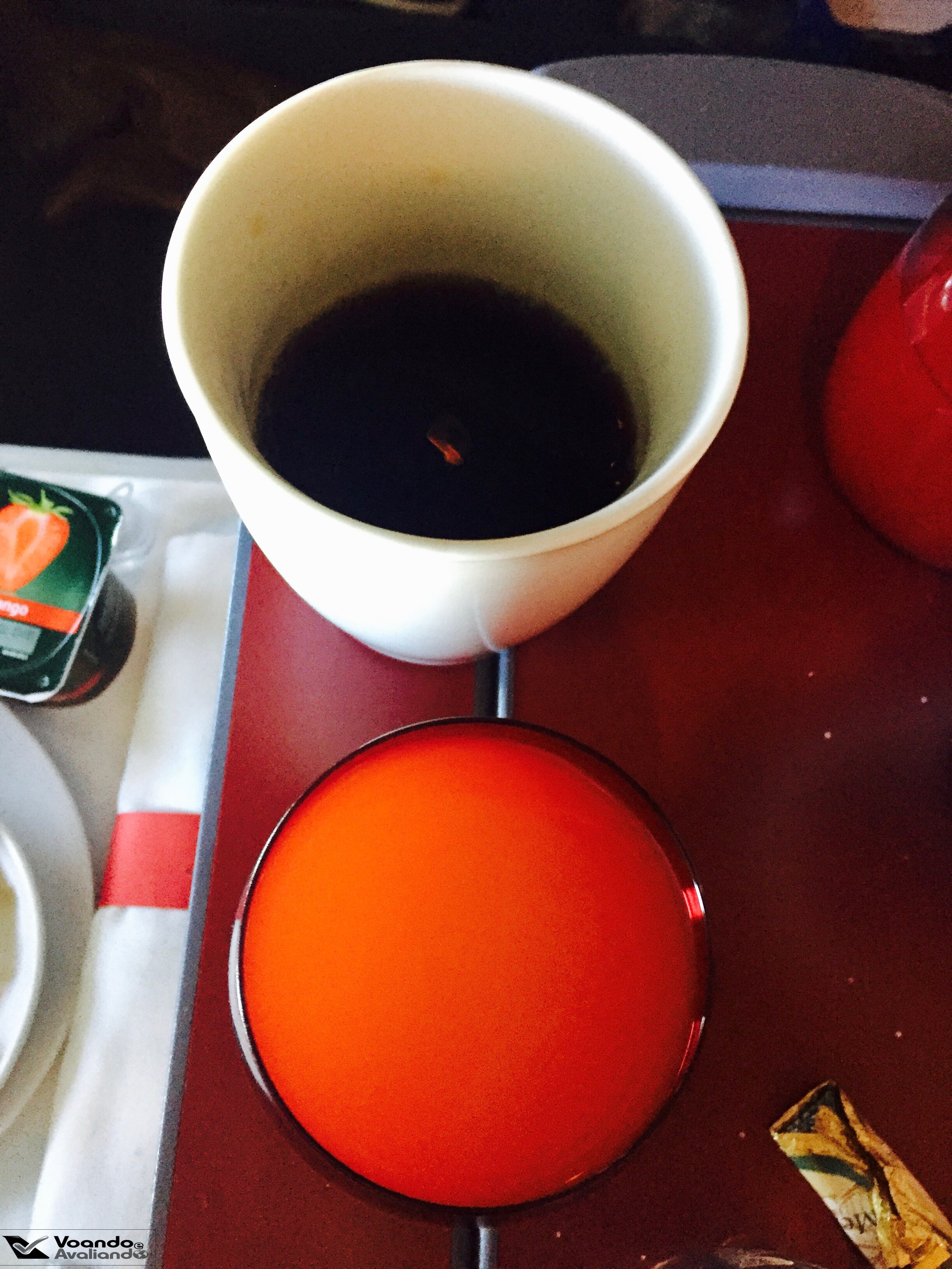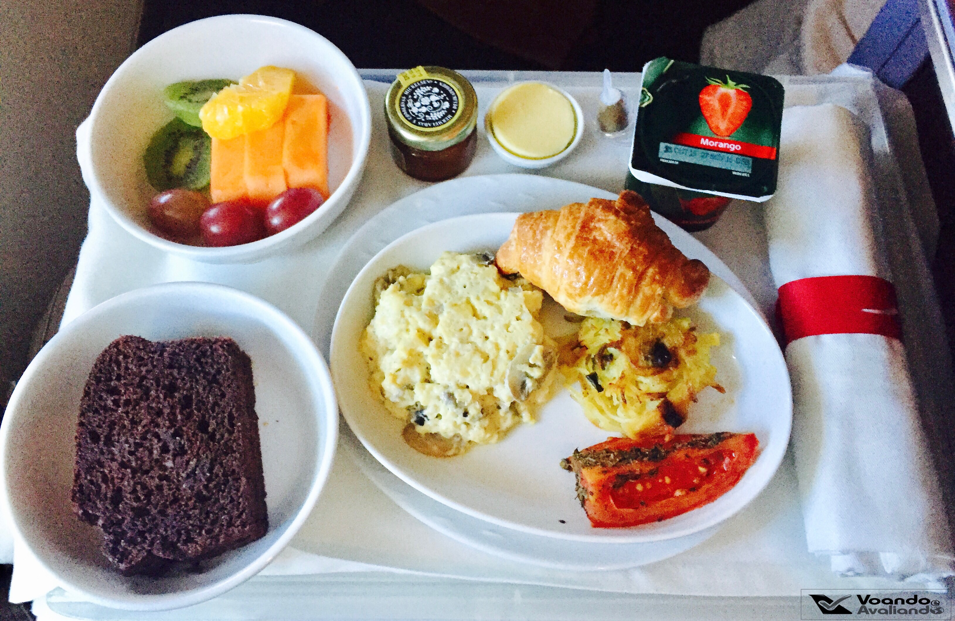 – logo em seguida, iniciou-se o serviço de café da manhã; a bandeja servida trazia as minhas escolhas que foram marcadas em um formulário entregue pela tripulação no início do voo: frutas, bolo de chocolate, croissant, iougurte, geléia, manteiga e, como prato principal, ovos mexidos com batata e tomate; para beber, café preto e suco de laranja; foi um ótima refeição matinal