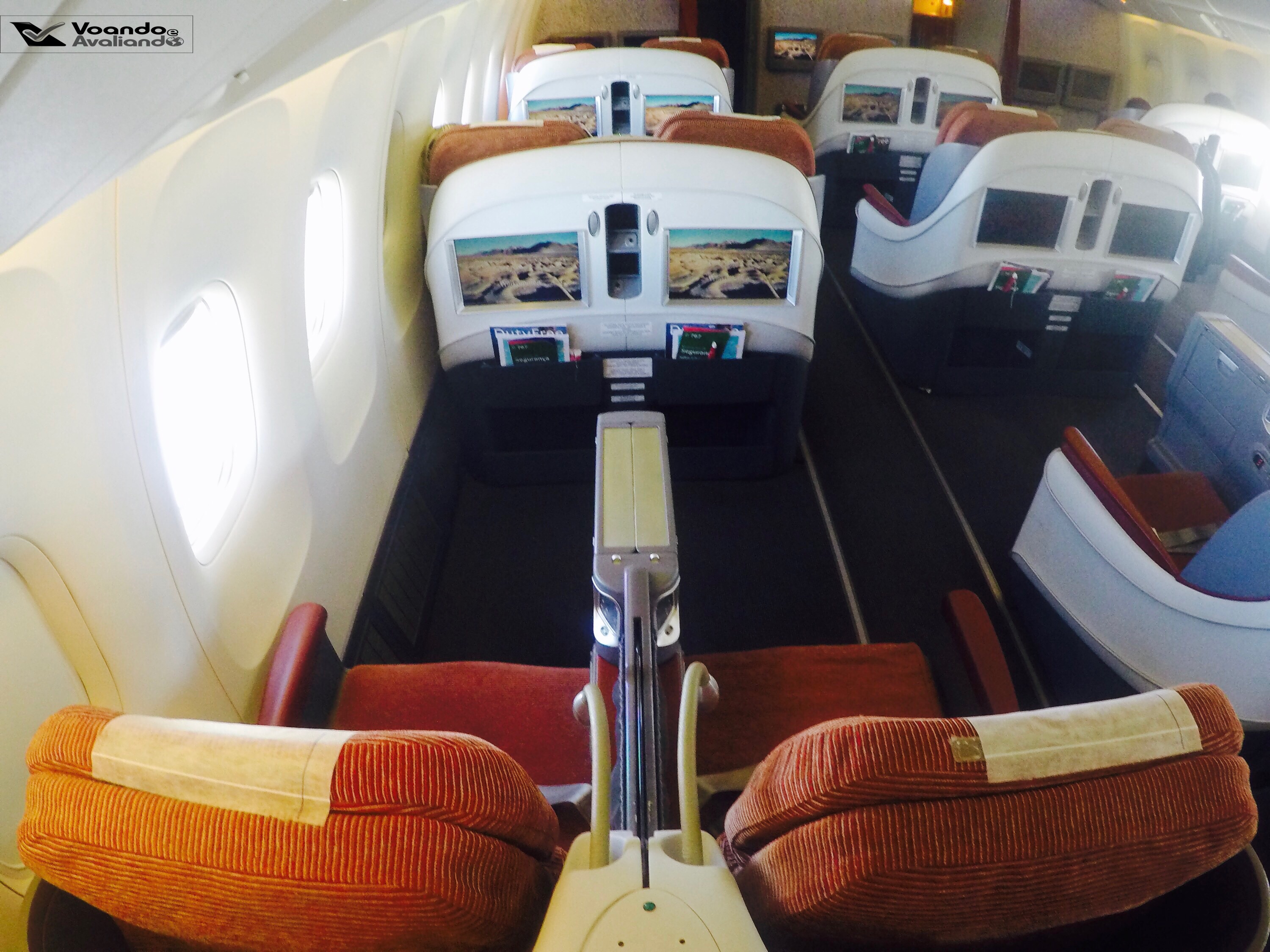– na classe Executiva deste modelo de aeronave estão instaladas 30 poltronas, são 05 fileiras de 06 lugares, na configuração 2 x 2 x 2 (ou seja, os passageiros sentados na janela não têm acesso direto ao corredor), mas 02 lugares (5L e 5J) são dedicados para o descanso da tripulação (o B767 não tem um “quartinho secreto” para a tripulação descansar, ao contrário do B777 e do A350, os outros modelos wide-body da frota da LATAM); neste voo, apenas 04 lugares estavam vazios