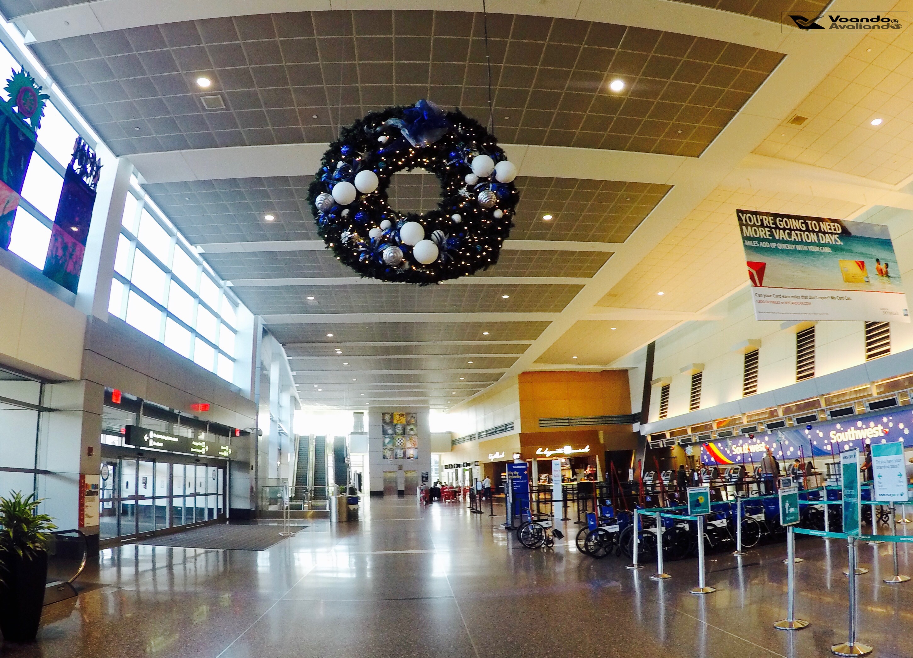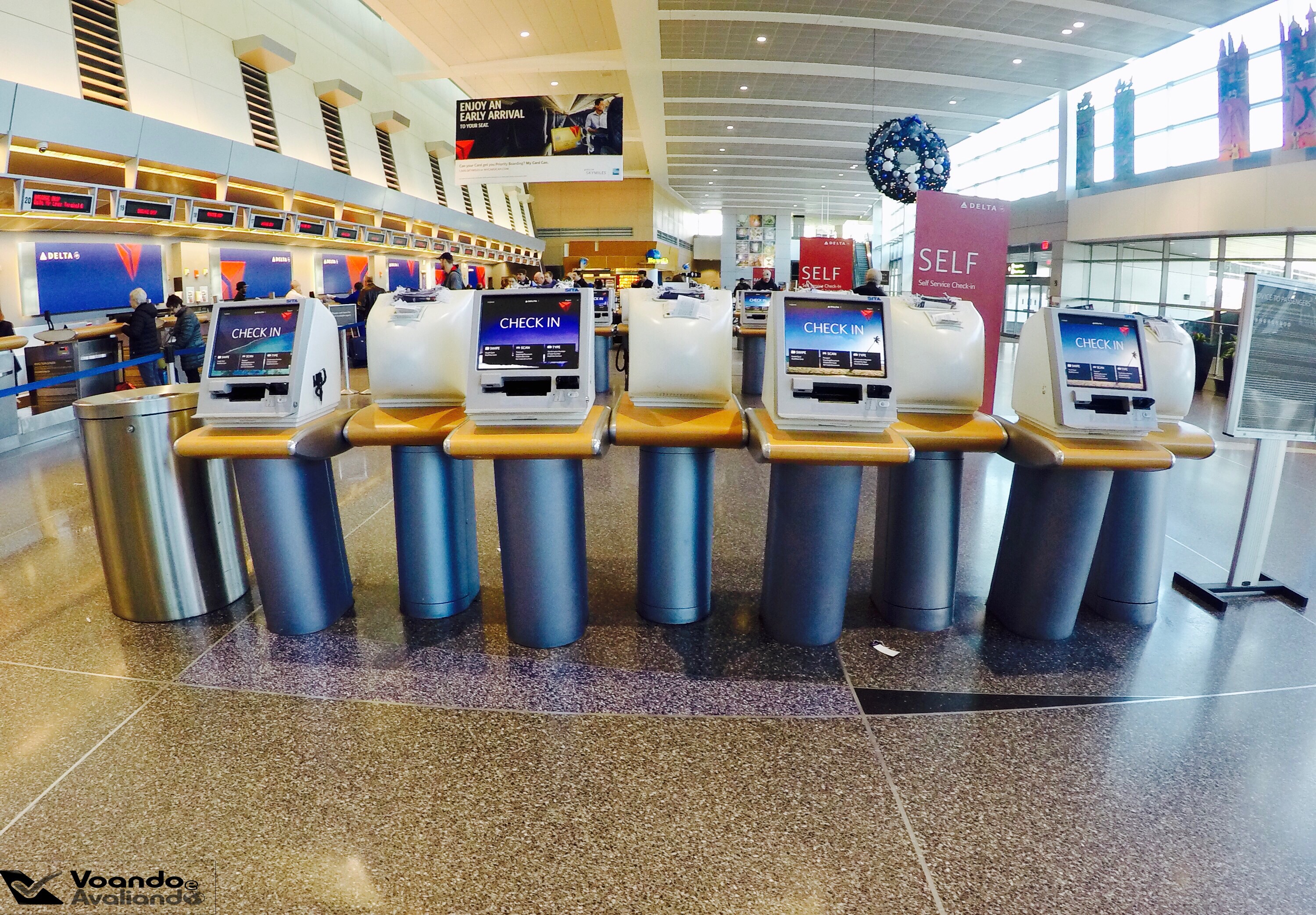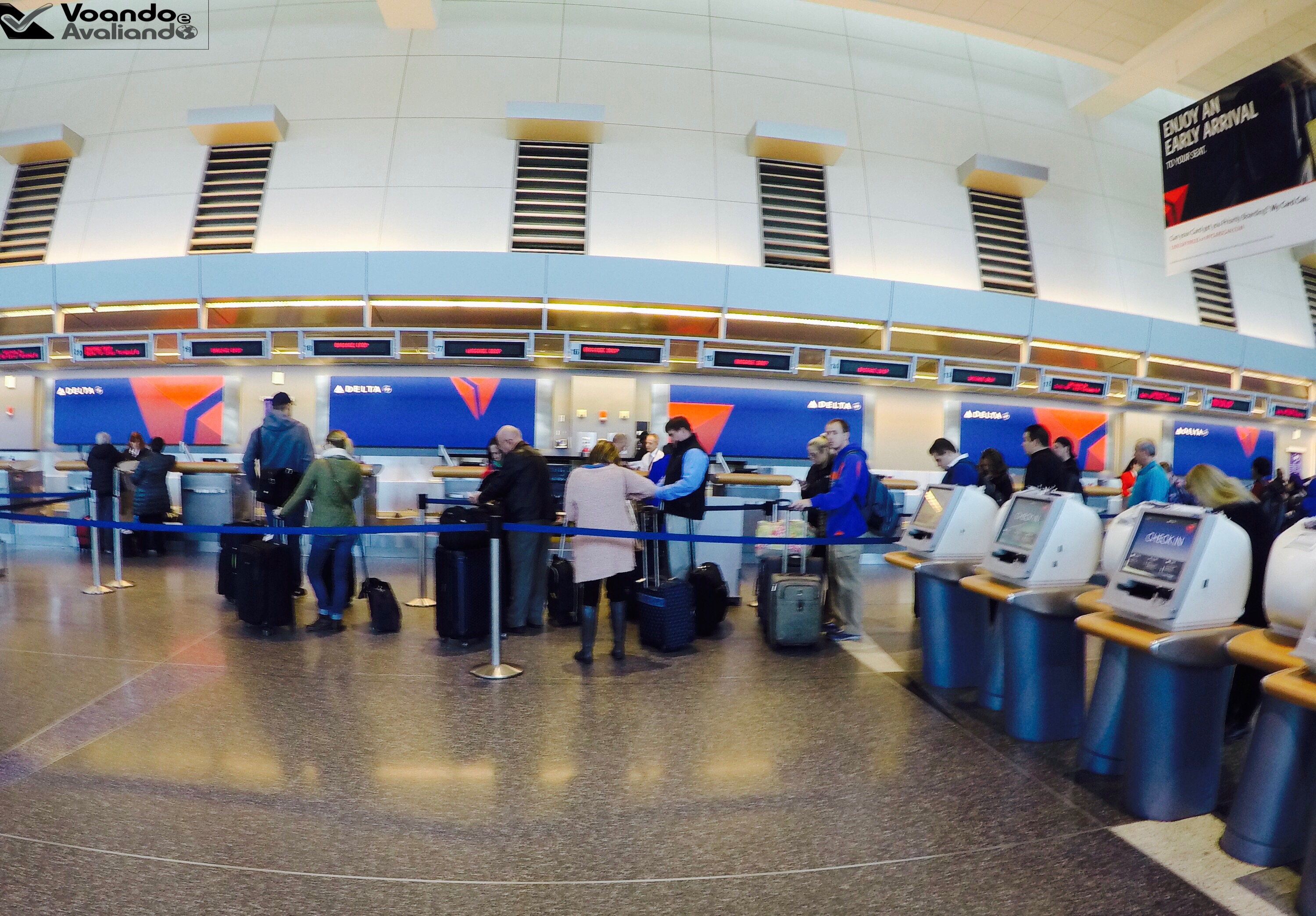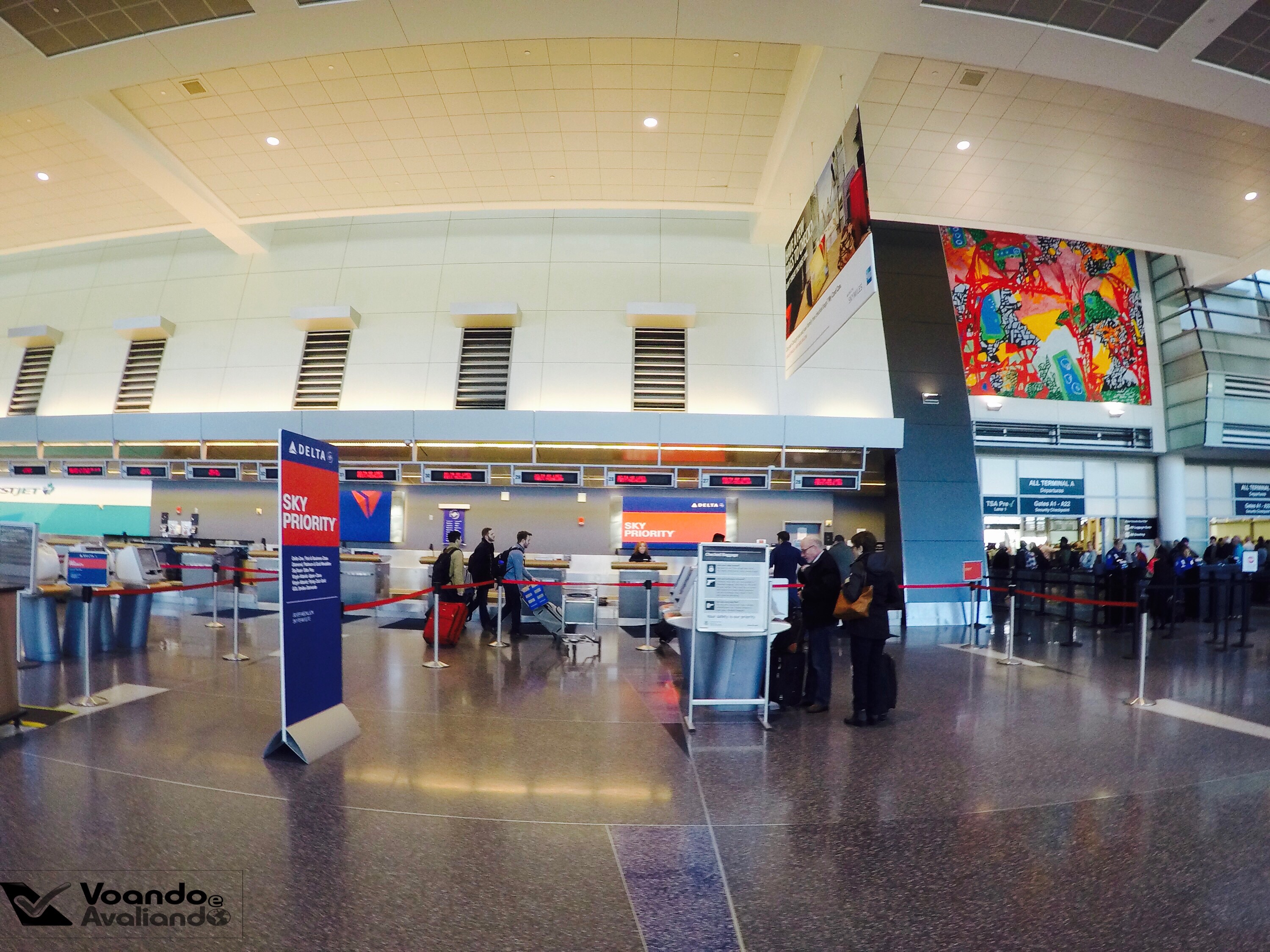 – cheguei por volta de 09:00h no Terminal A, que é utilizado pela DELTA, SOUTHWEST e pela canadense WESTJET; na área de check-in, o espaço tem estrutura moderna, amplo e muito bem iluminado; muitos quiosques de auto-atendimento estão espalhados e são dezenas de guichês para despachar malas; fui para a área específica de prioridades da companhia americana – Sky Priority – já que, em função do estreito relacionamento e parceria com a nossa GOL LINHAS AÉREAS, o meu status Smiles Diamante funciona por aqui; não peguei filas, fui direto no balcão onde fui atendido de forma seca e protocolar, sem nenhum glamour