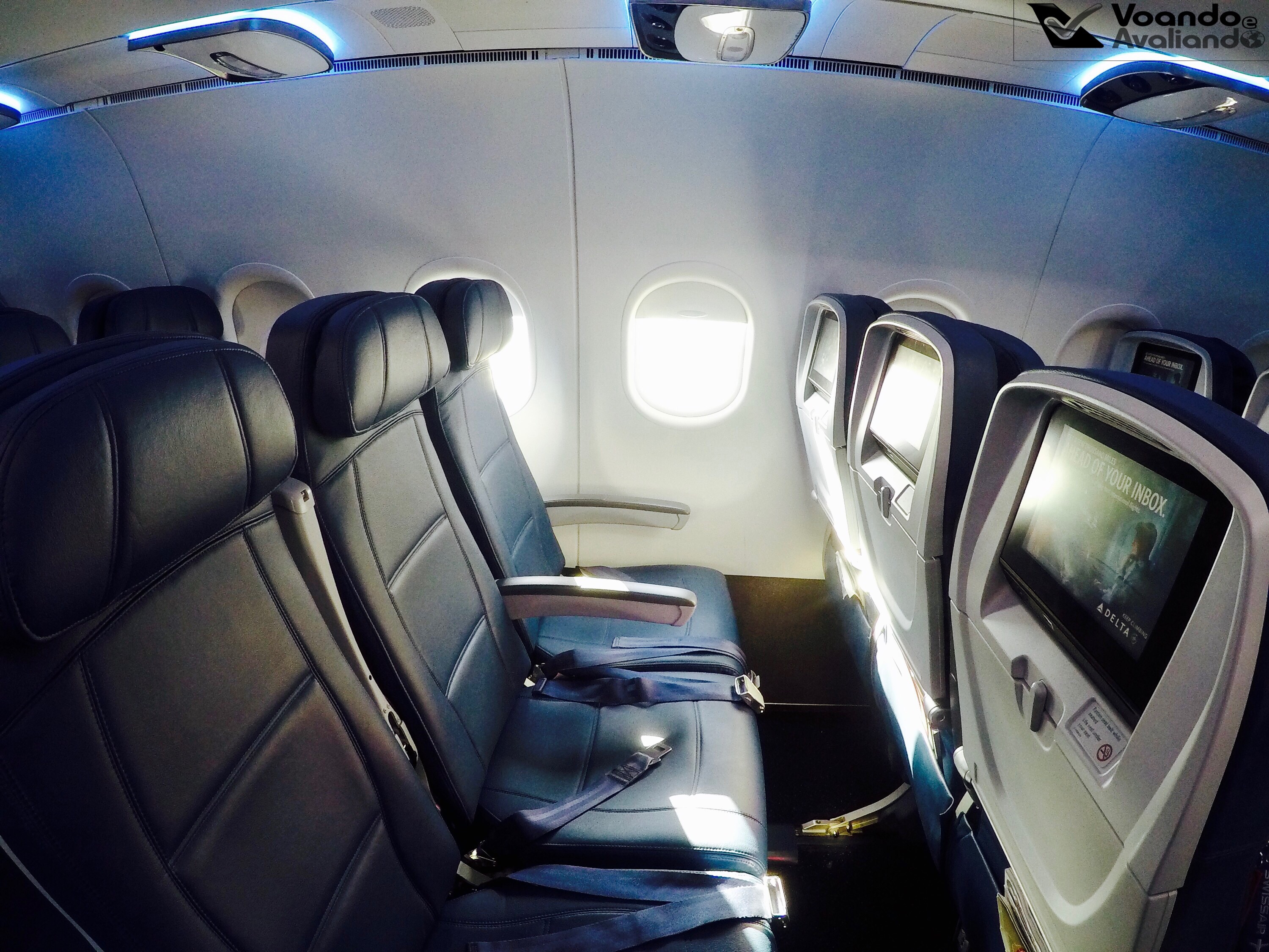 – a configuração das poltronas era a tradicional deste modelo de aeronave: três de cada lado – 3x 3 (na Delta First, são apenas duas de cada lado); os assentos eram revestidos de couro azul escuro e tivemos casa cheia neste voo, completamento lotado