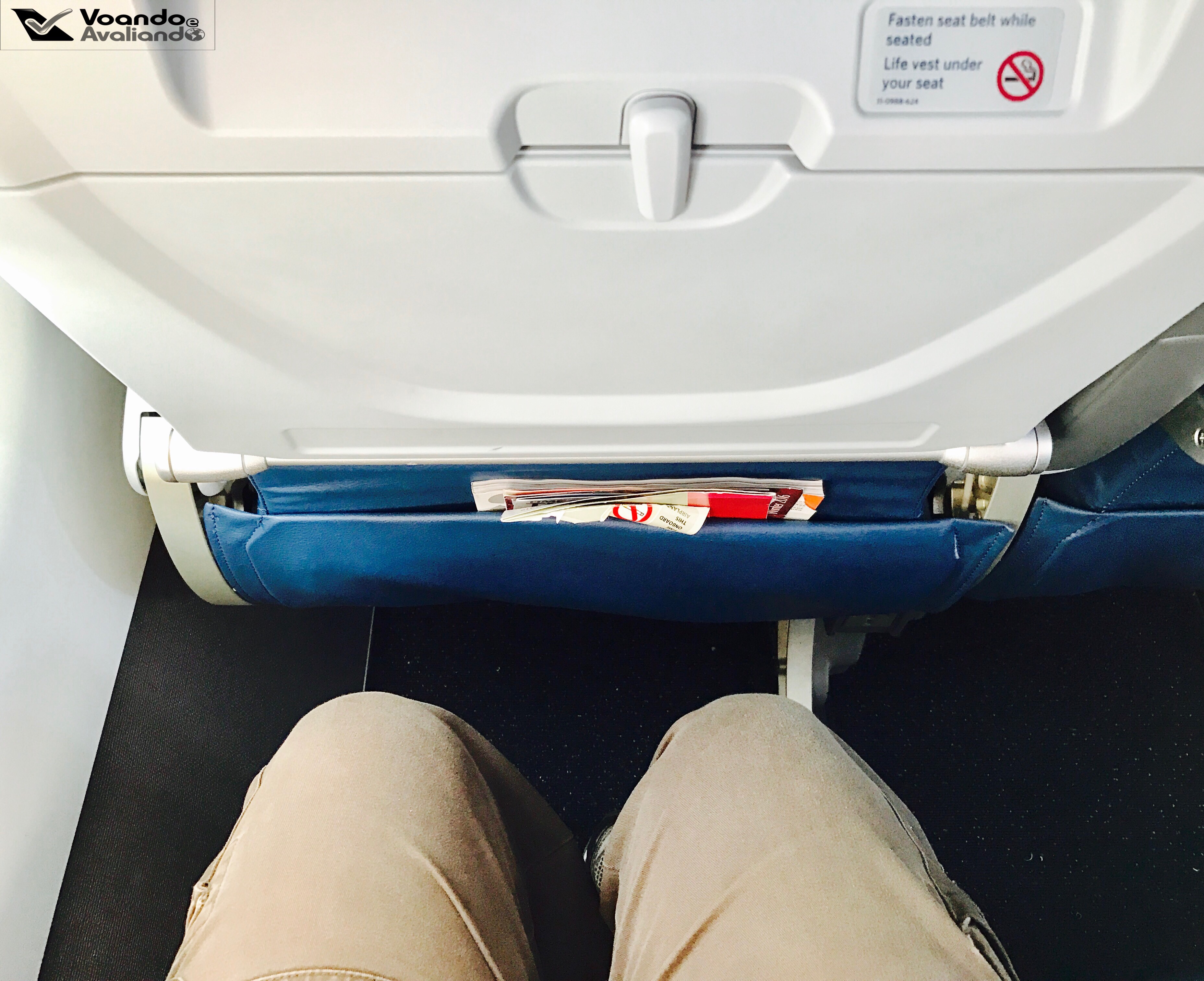 – meu assento era o 18A, uma janela na parte esquerda do A319, um pouco atrás da asa; o espaço para pernas entre poltronas era razoável e o poltrona tinha encosto de cabeça com alças laterais reguláveis, o que ajuda bastante para uma soneca durante o voo