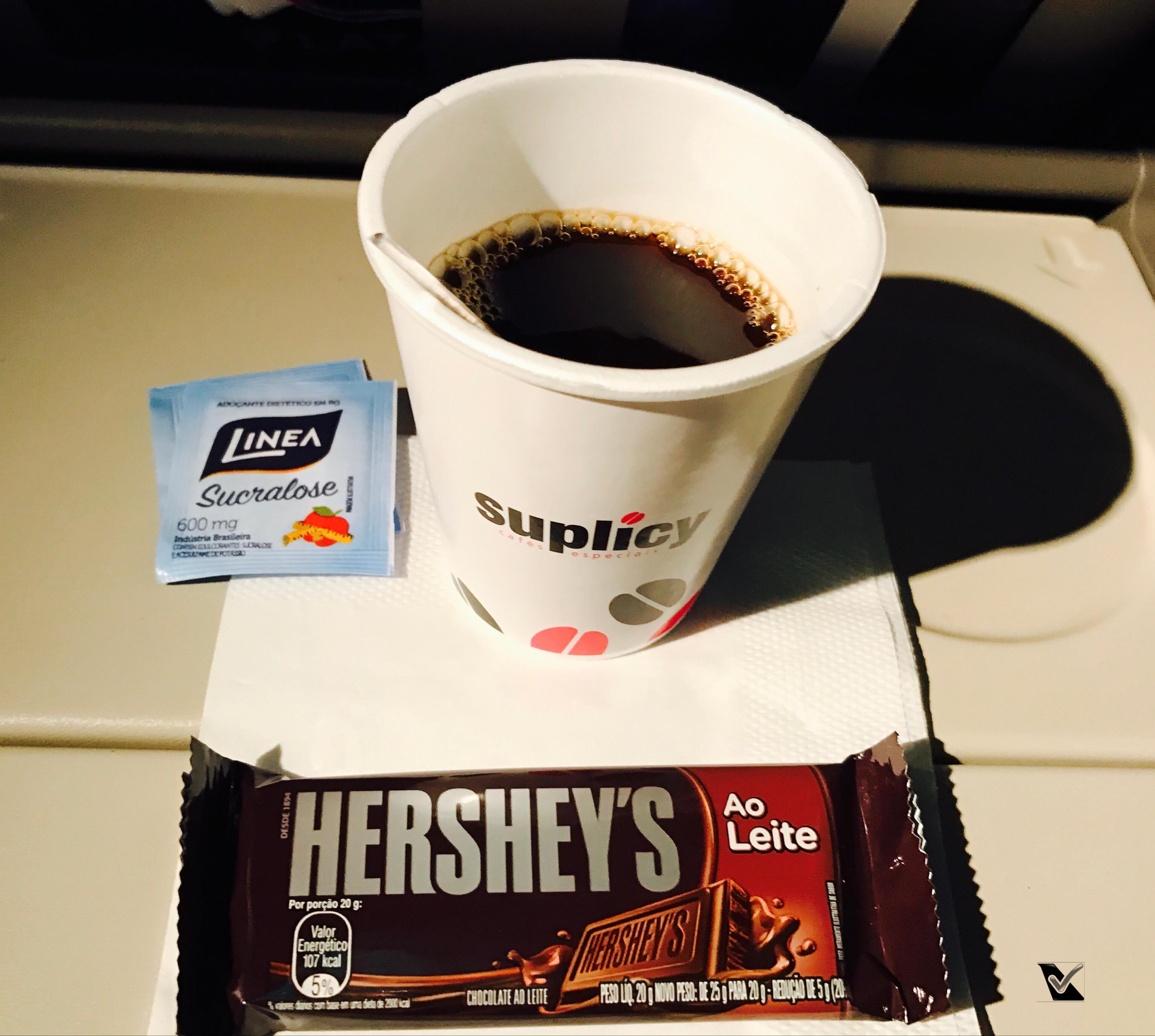 – eram 01:25h quando foram recolhidas as bandejas e oferecidos whiskie Ballantines (não bebi) e café (bebi), acompanhados de um chocolate Hershey`s, um bom final de refeição
