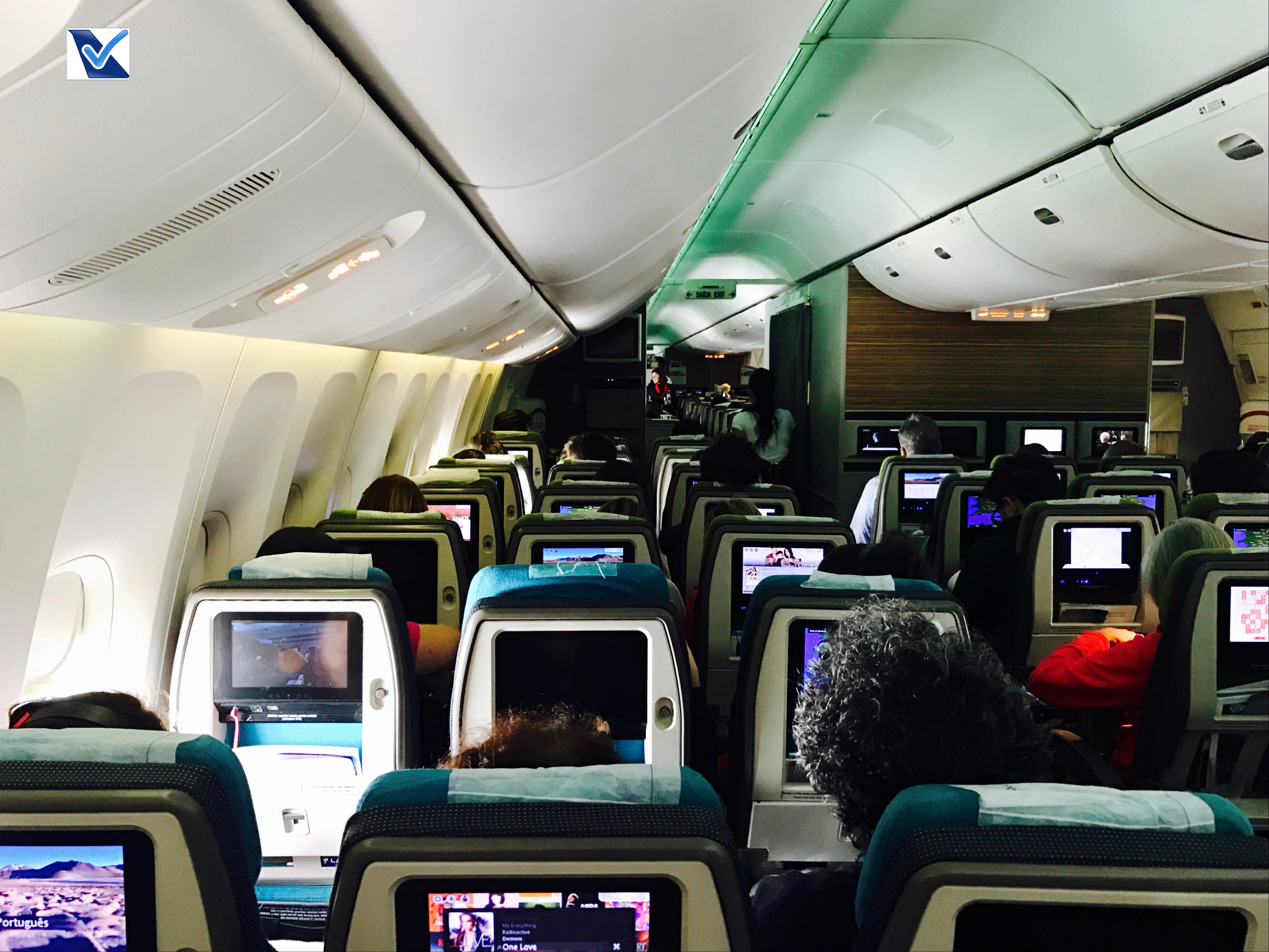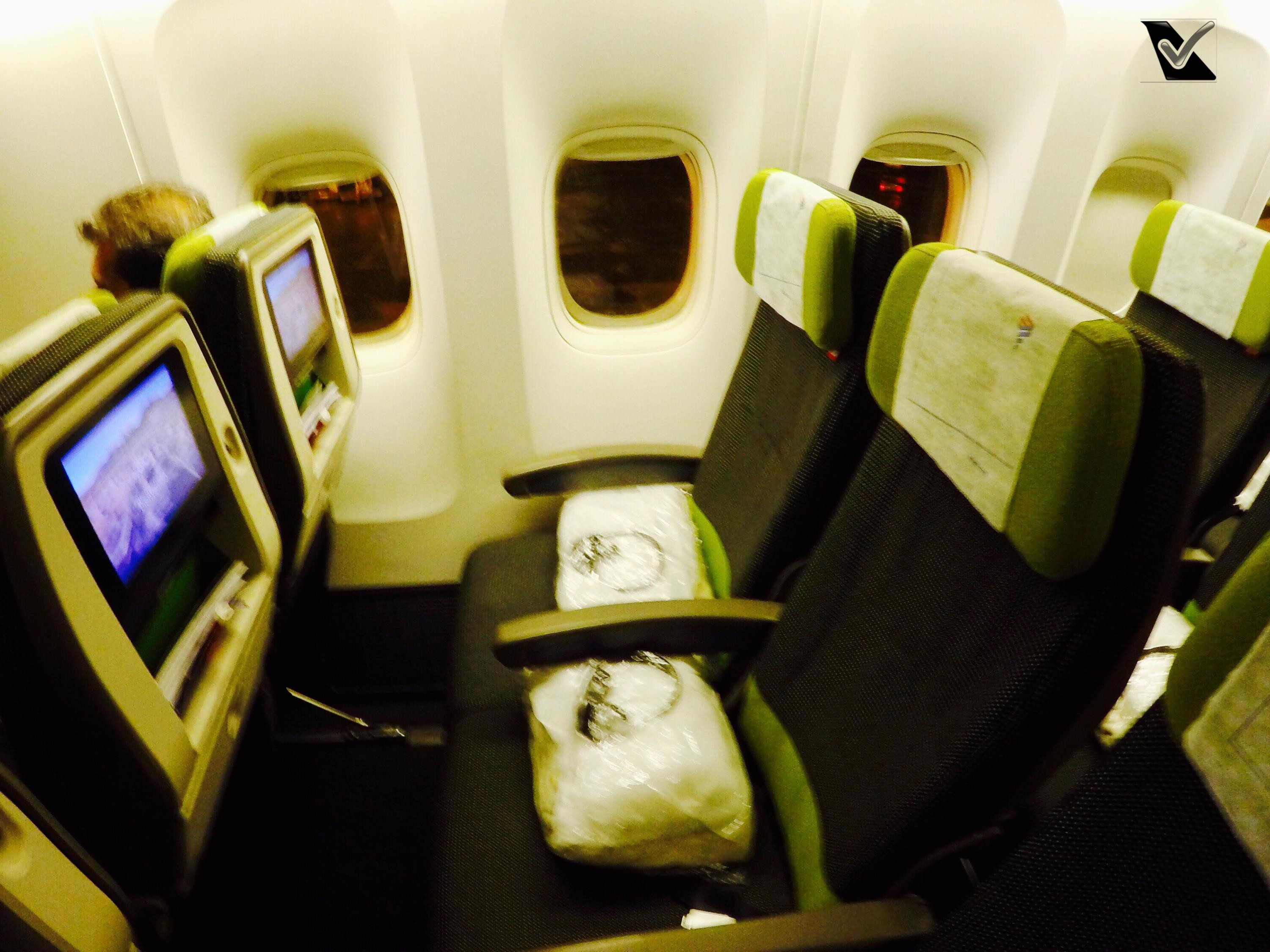 – o voo estava simplesmente lotado, nenhum lugar disponível na classe Econômica ou Executiva, portanto, nada de upgrade (eu era o 3º na lista de candidatos); a configuração dos “Triplo Sete” da LATAM não é das melhores 3x4x3 (03 assentos nas janelas, com 04 assentos na parte central do avião); o revestimento das poltronas não tem um padrão único, ha fileiras com verde, azul, bege e vermelho