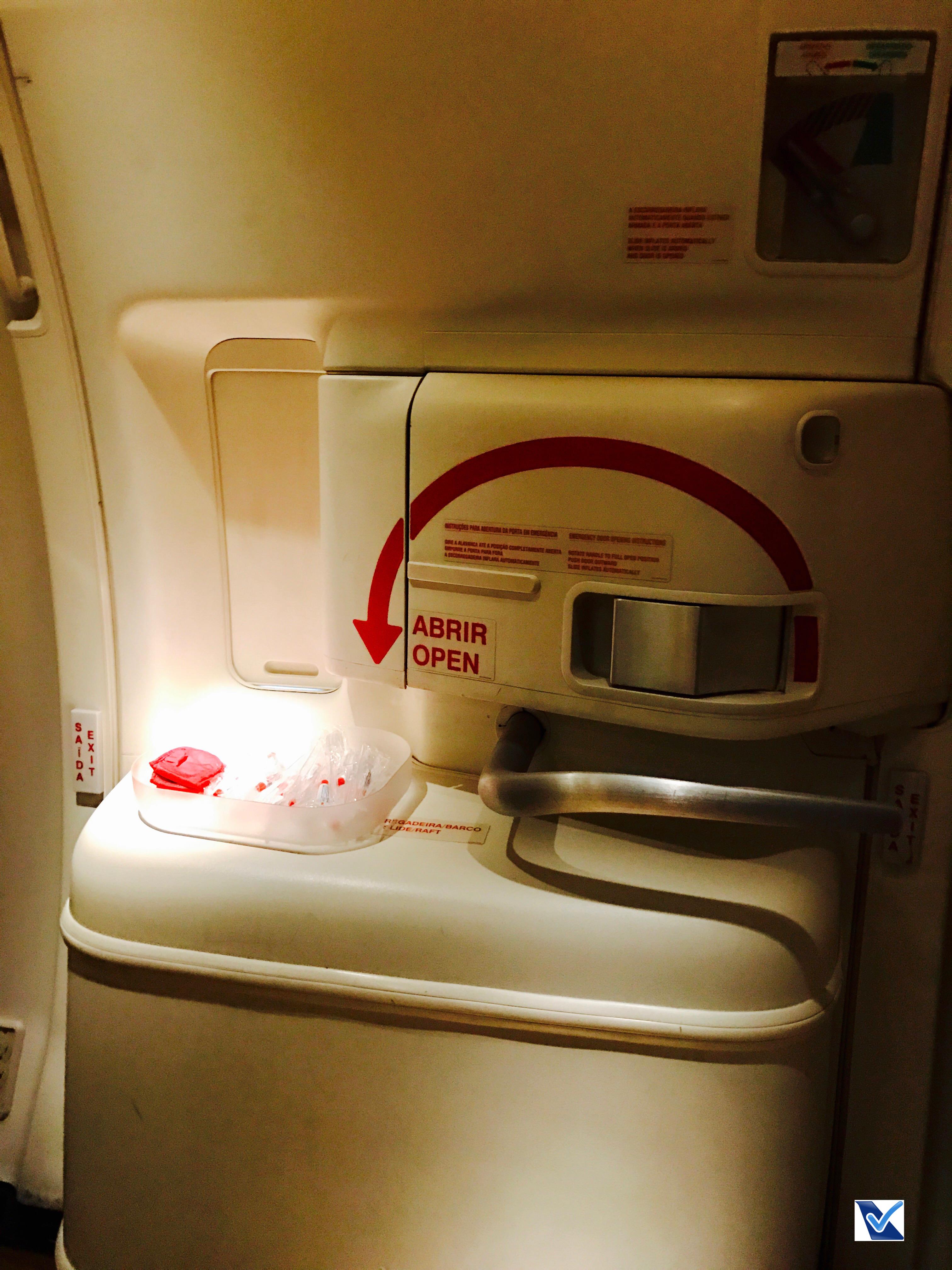 – na saída, reparei que já estava disponível em uma cesta colocada na grande porta traseira as amenities que a LATAM oferece aos passageiros da classe Econômica: tapa-olho, par de meias, protetor auricular e kit de pasta/escova de dente, sempre providencial