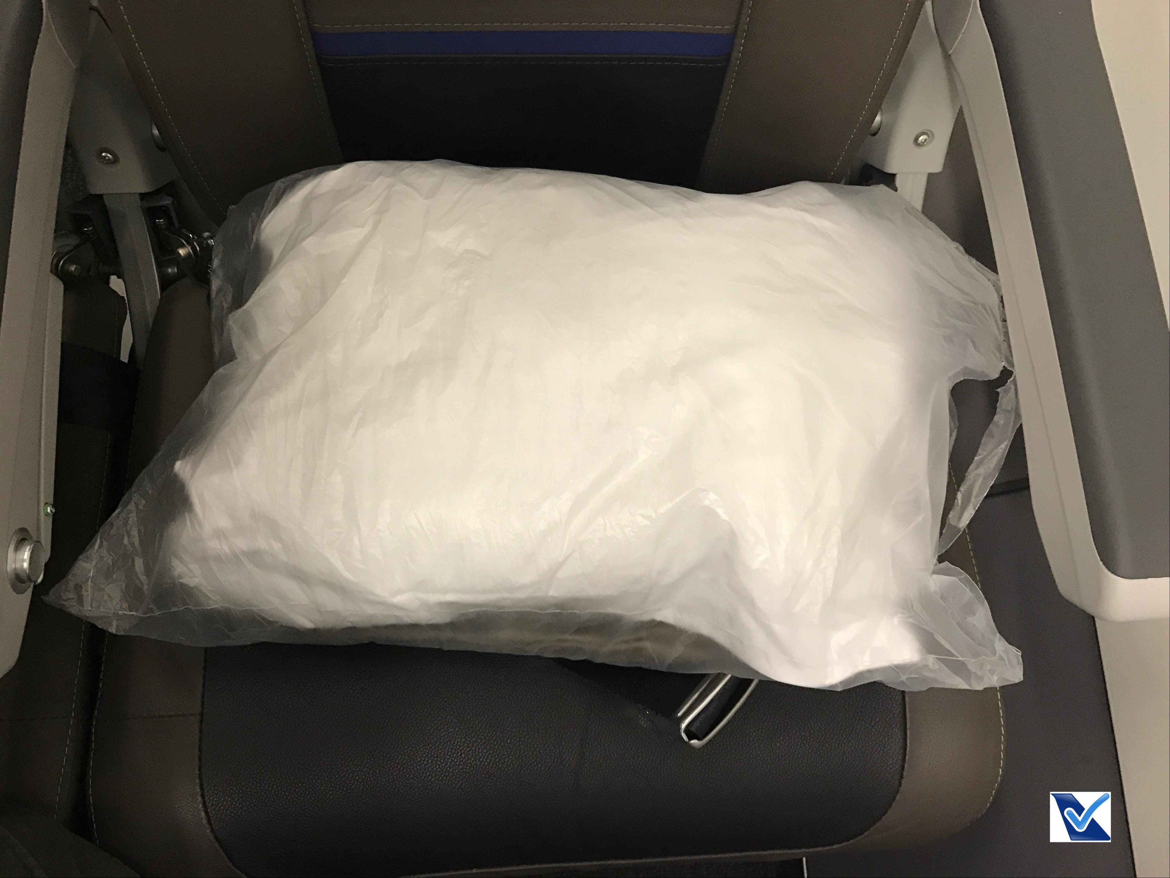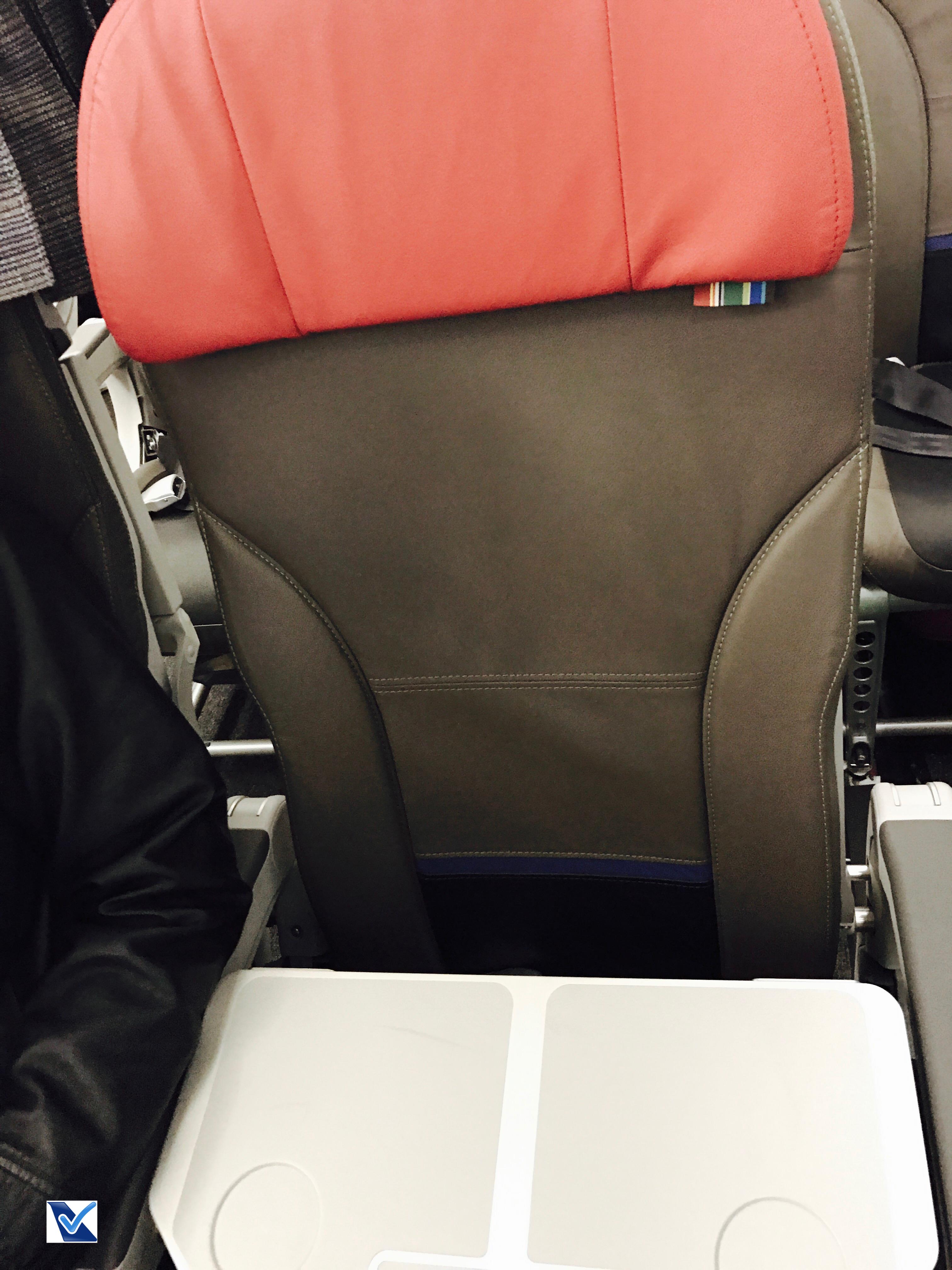 – quando entrei nele, a surpresa: nada daquelas 12 poltronas grandes e antigas de classe (semi)Executiva, esta aeronave já trazia o novo interior que a LATAM chama de classe Premium Economy, anunciada em julho de 2015 para ser adotada nas rotas dentro da América do Sul, como parte do programa de padronização da fusão entre LAN e TAM; a configuração é a tradicional 3 x 3 (três de cada lado), mas a poltrona do meio das 03 primeiras fileiras não é destinada a passageiros, uma pequena mesa fica instalada nela; uma cortina de pano separa esta área da classe Econômica; esta nova classe da LATAM me lembrou muito o esquema que as companhias europeias “tradicionais” adotam nos voos dentro da Comunidade Européia e vendem como Business (já voei com a British, Alitalia e Vueling); o espaço para pernas é um pouco maior do que o normal, é possível cruzar as pernas com tranquilidade e a poltrona, que tem revestimento de couro, reclina mais do que o normal; um travesseiro (muito pequeno) e uma manta fina estavam embalados por um plástico e disponíveis em cima da poltrona de cada passageiro