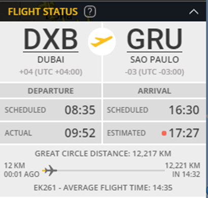 …viajou por 14 horas e 24 minutos e chegou em Guarulhos às 17:16h.