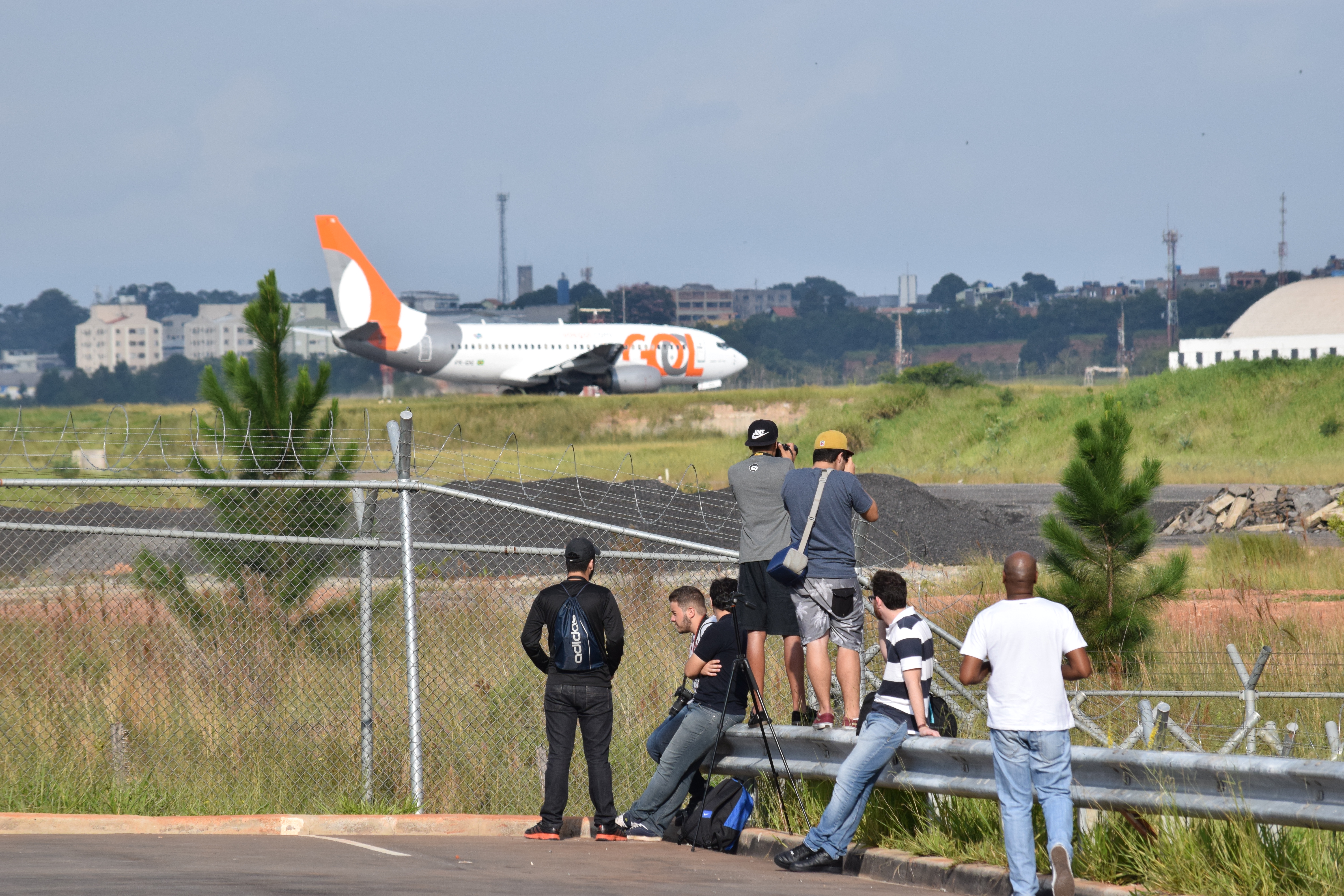 O “morrinho” estava lotado! É preciso passar por um buraco de uma grade e acessar uma parte com grama e pequenos arbustos para ter uma ampla visão do aeroporto: pistas e terminais ao alcance dos nossos olhos. Acho que a escolha de acompanhar o pouso neste lugar foi acertada. A cabeceira realmente fica longe, mesmo com um bom zoom de máquina, fazer um bom registro do momento do toque seria um desafio.