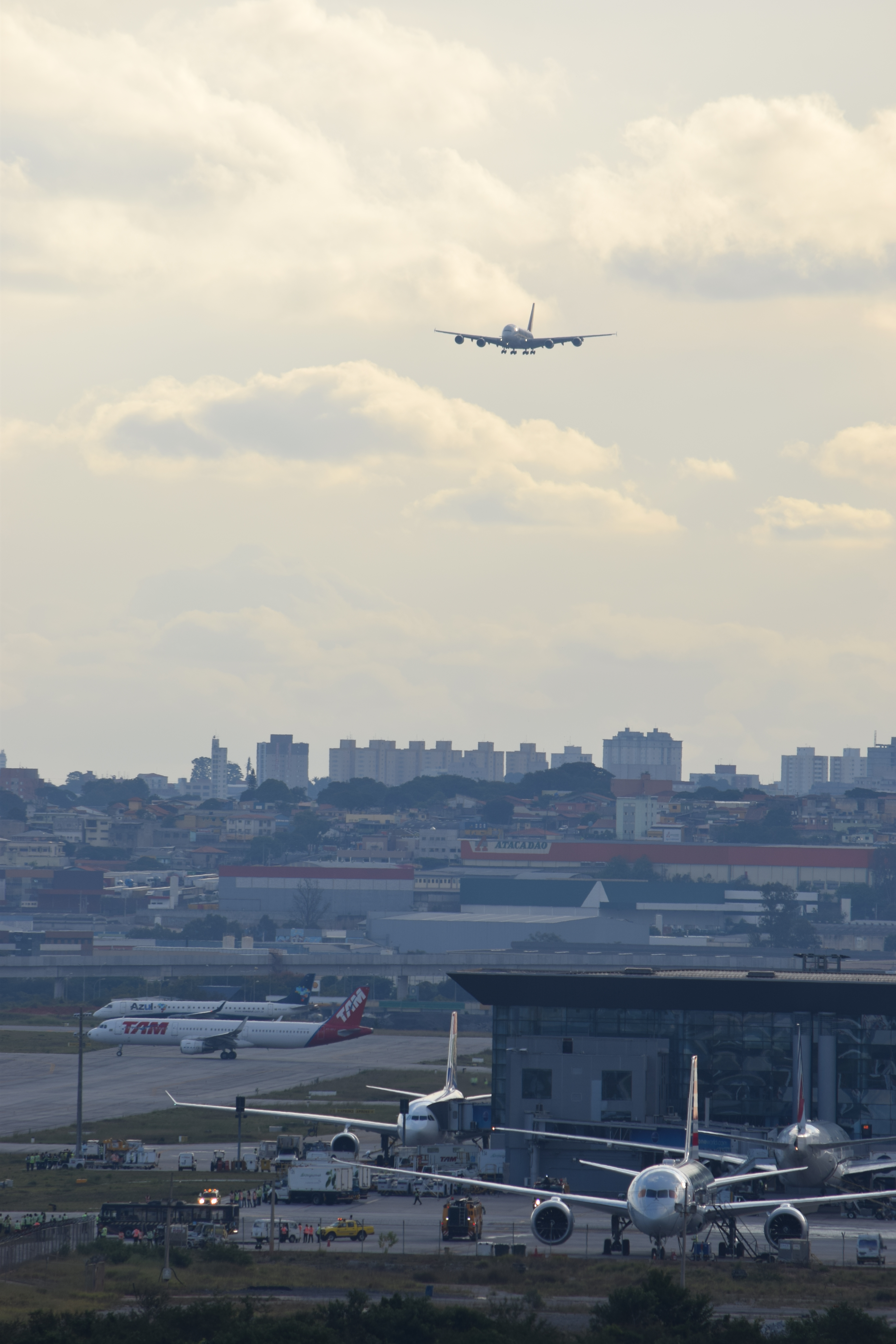 Resolvemos dar uma conferida na 1ª opção, tínhamos tempo para isso. Pegamos o ônibus de novo e voltamos para o T1, para a área de um estacionamento, a cerca de 100 metros do edifício, perto dos galpões de cargas da LATAM e GOL. A visão era limitada, só seria possível registrar a chegada do A380 em 02 momentos e de forma expressa: na aproximação final e no momento do toque no solo. Não gostei desta opção, por mais que a ideia de registrar a imagem do avião segundos antes de tocar o solo, com o trem de pouso travado, fosse atrativa.