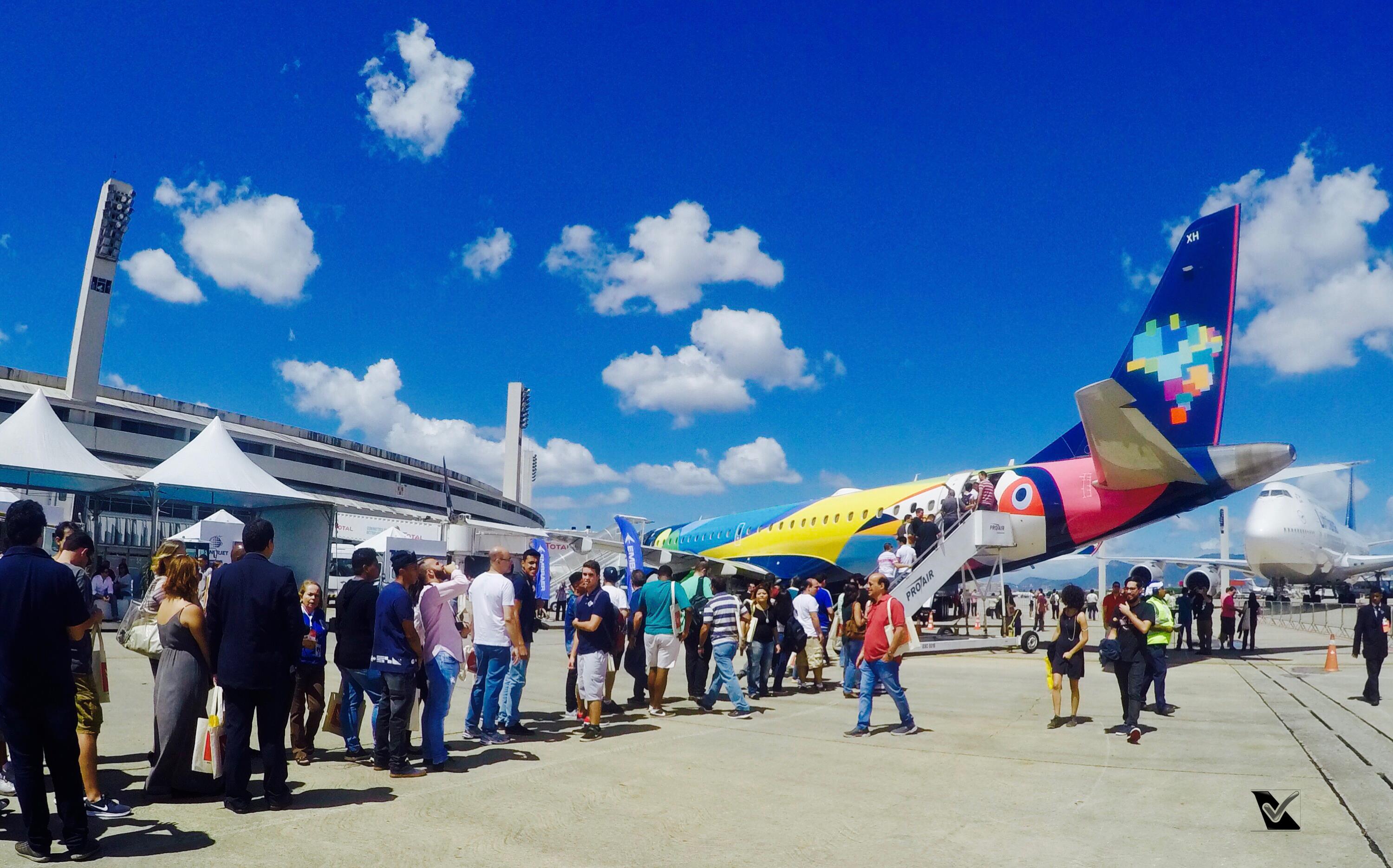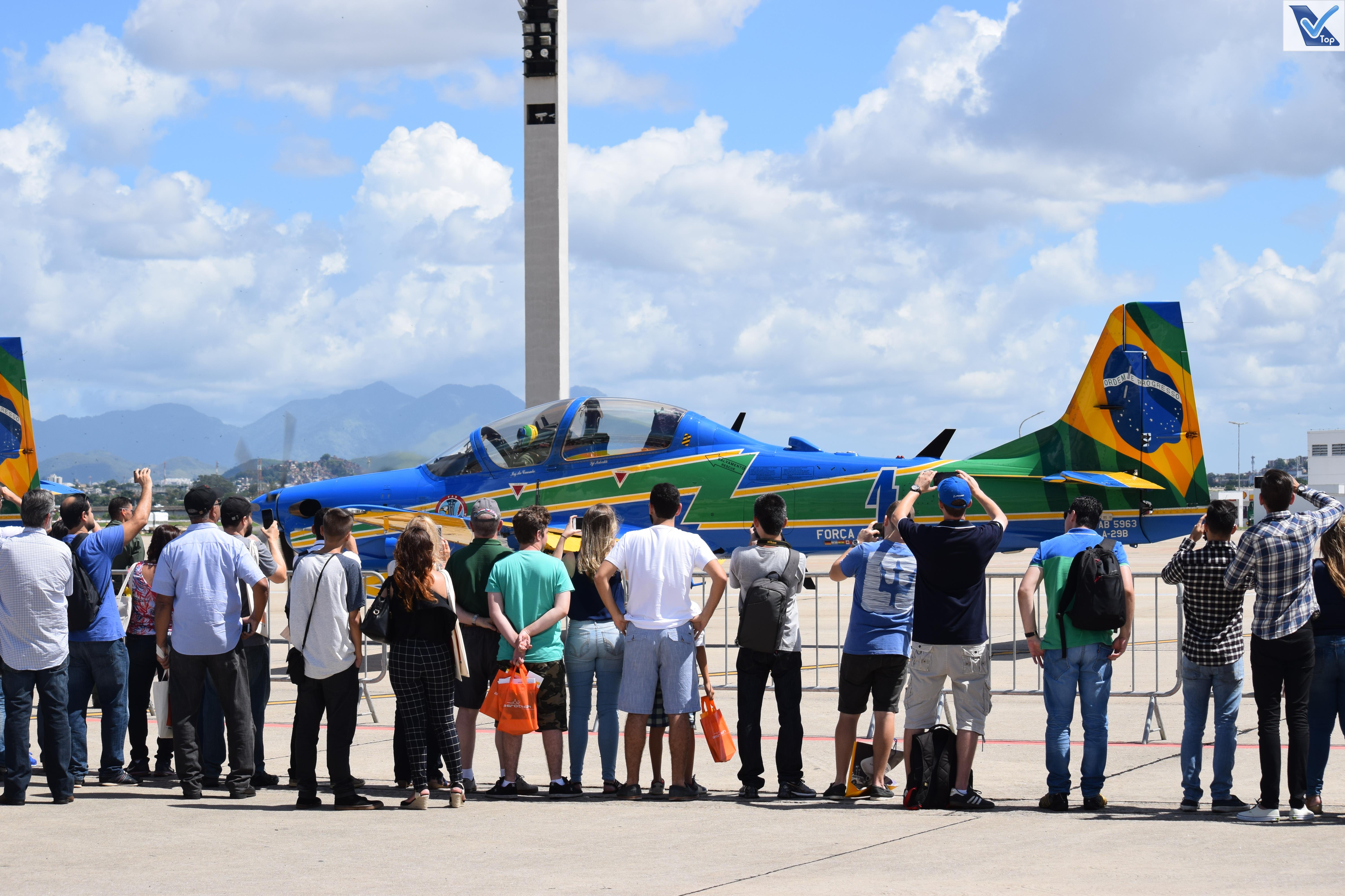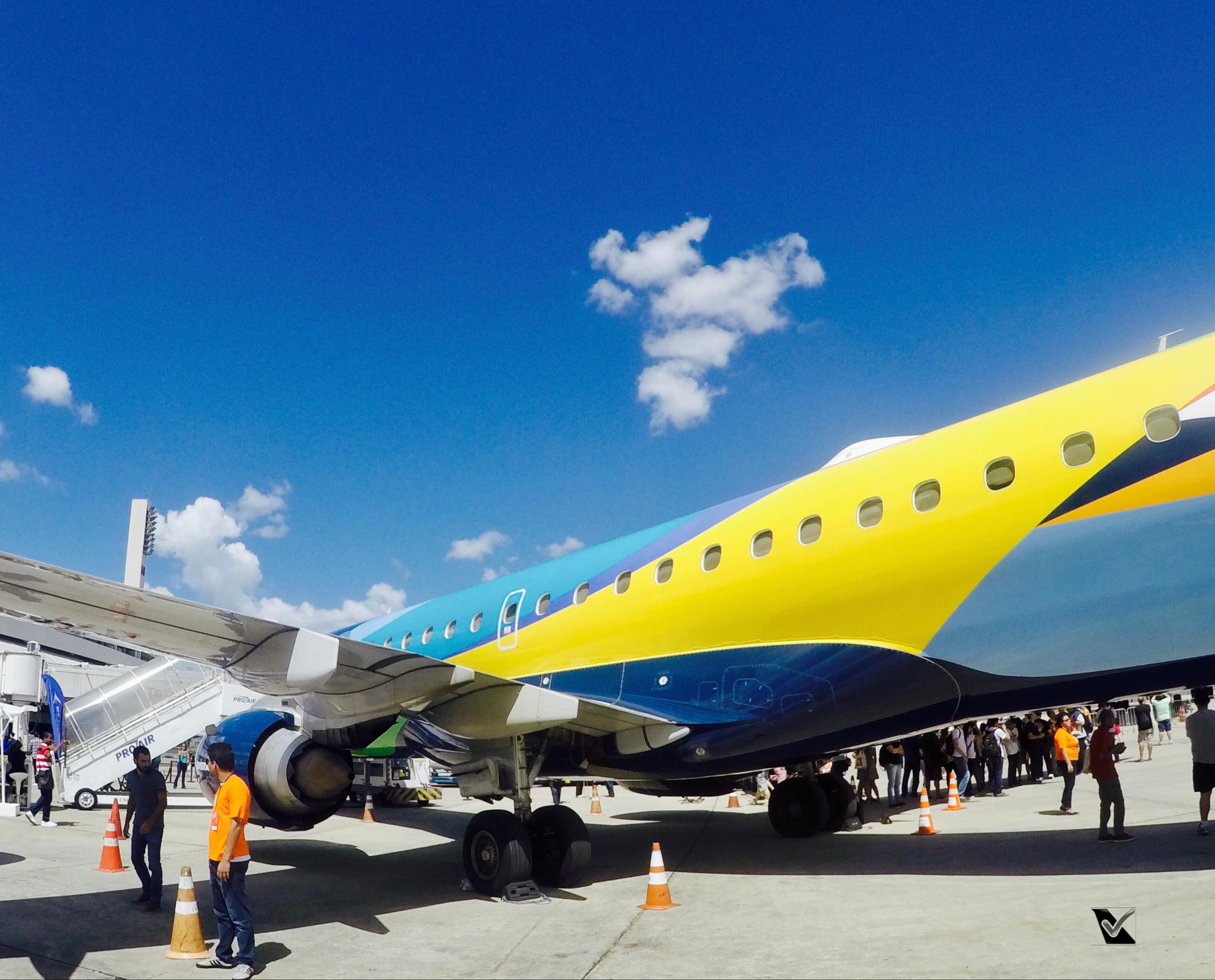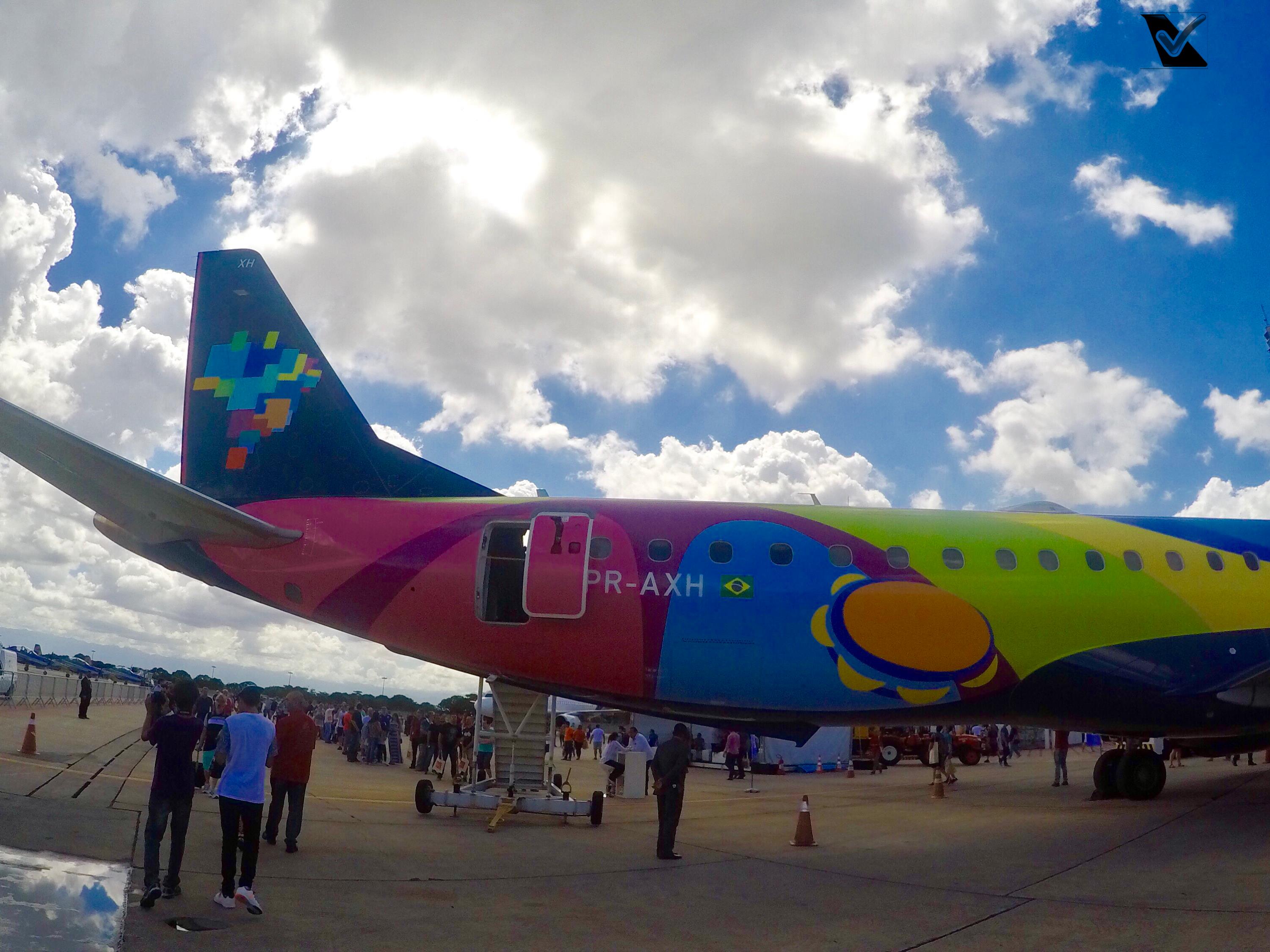 Quando finalmente foi possível entrar, somente o “nosso” E-195 da AZUL estava exposto dentro da exposição (rapidamente, uma enorme fila se formou para a visita ao interior da aeronave). O sempre magnífico B747-8 da LUFTHANSA estava estacionado a esquerda, depois das grades de proteção, sem acesso ao público. Por volta de meio-dia, um A319 da LATAM (com a nova identidade visual depois da fusão entre TAM e LAN) foi rebocado para uma área do lado direito, também sem acesso dos visitantes. Os A29s (Super Tucanos) da Esquadrilha da Fumaça estavam perfilados depois das grades, na parte frontal. Quando eu estava indo embora (por volta de 13:15h, um B737-8 da GOL (com as novas cores da companhia) estava sendo rebocado para ser estacionado na parte interna, ou seja, também seria possível fazer a visita ao interior do Boeing. Além disso, um helicóptero e alguns poucos veículos de operação aeroportuária estavam expostos.