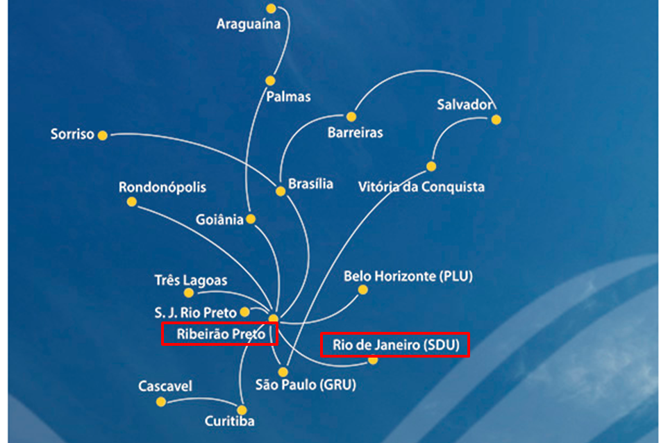 São 03 voos para Ribeirão Preto/RAO (único destino operado a partir da capital carioca) nos dias úteis (horários da saída do SDU: 08:10h / 14:00h / 19:55h) e 02 voos nos fins de semana e feriados (horários da saída do SDU: 08:10h / 14:00h):