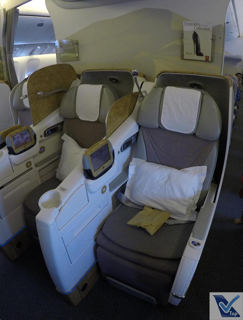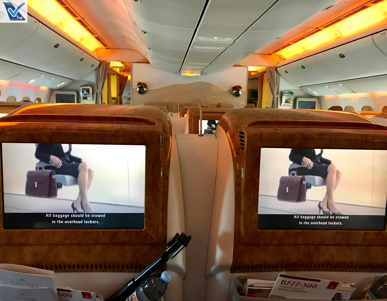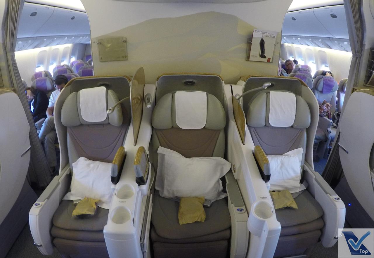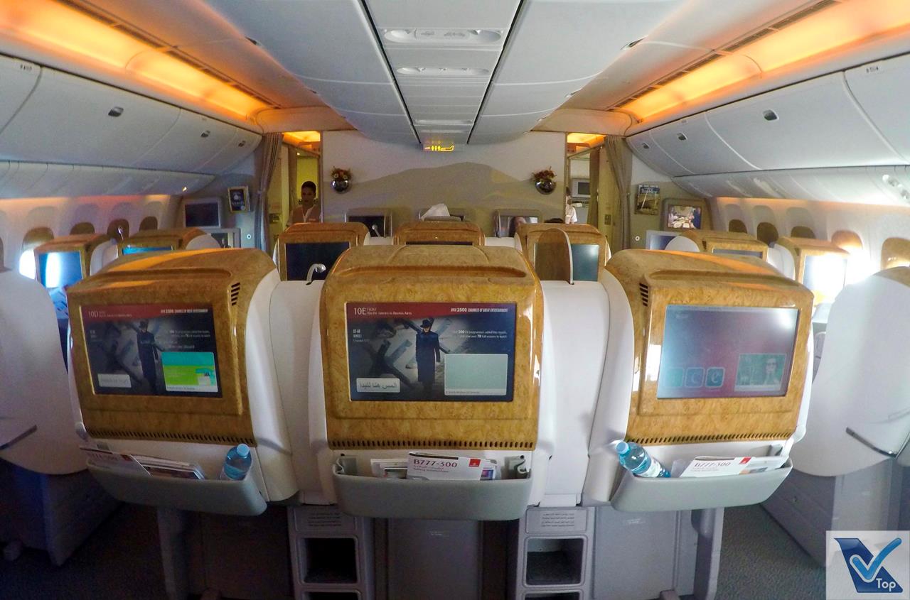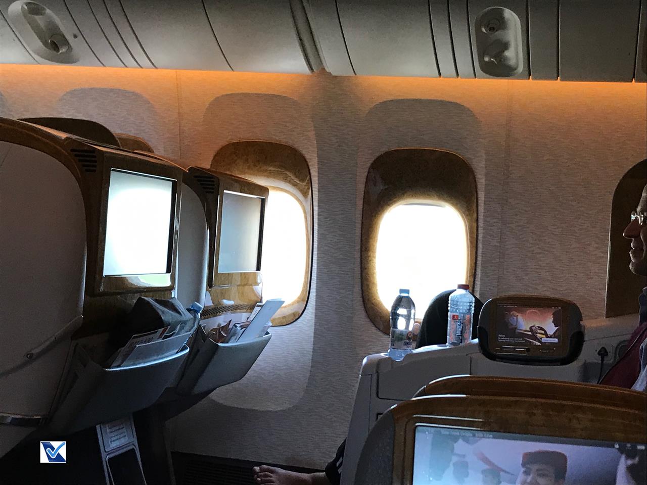 – com o código do bilhete fornecido pelo Smiles, foi possível fazer reserva de assento diretamente no site da EMIRATES, de forma gratuita; a configuração da Executiva do B777 da companhia do Golfo Pérsico é semelhante à utilizada pela LATAM em seus aviões de mesmo modelo: 2 x 3 x 2, ou seja, dos 42 assentos, somente 24 permitem que o passageiro tenha acesso direto ao corredor; além disso, há a tenebrosa poltrona do meio na parte central da aeronave; em resumo, não é uma boa estrutura; escolhi o assento 11D, um corredor, na última fileira da cabine