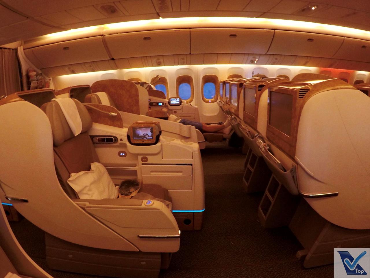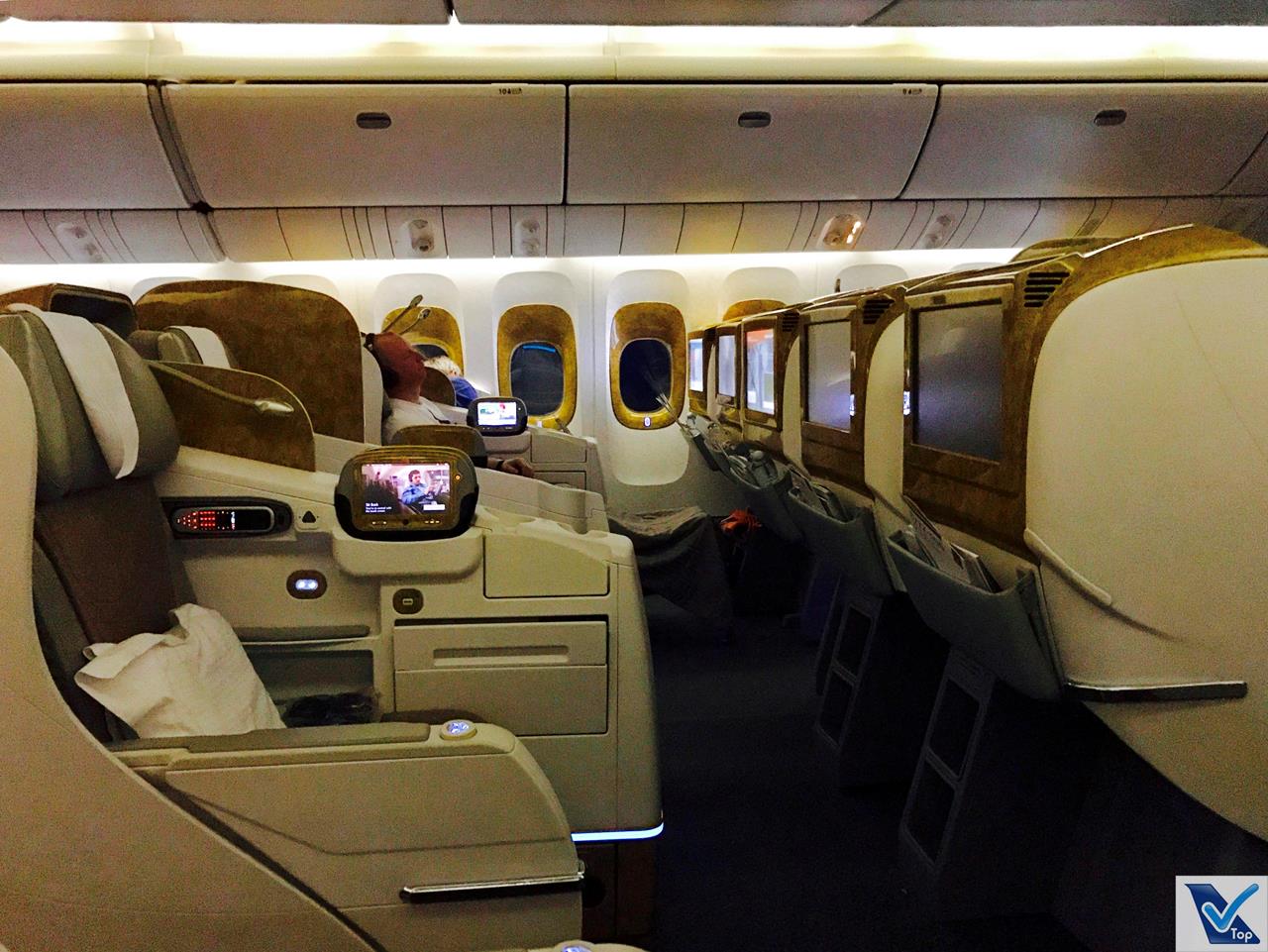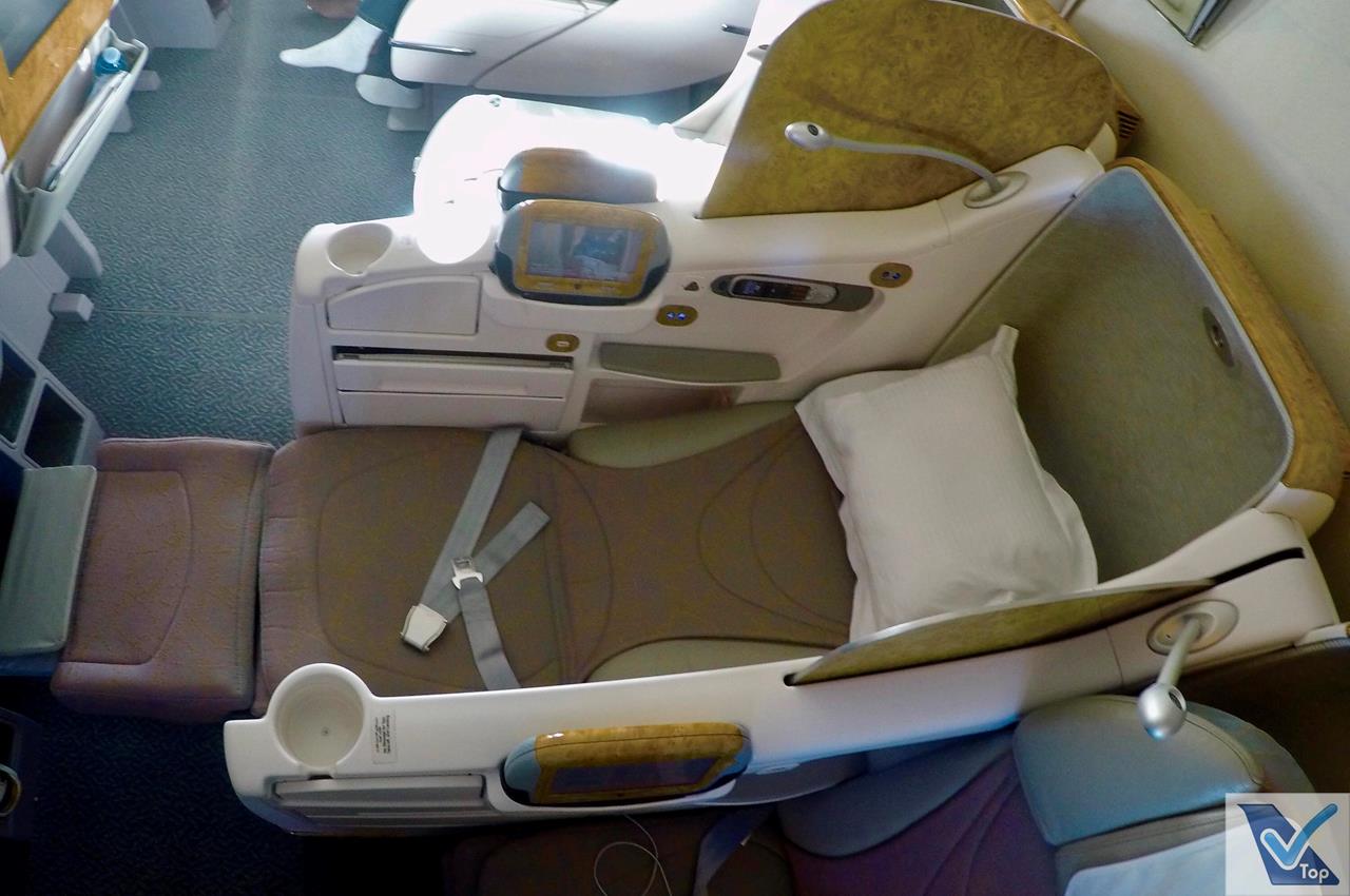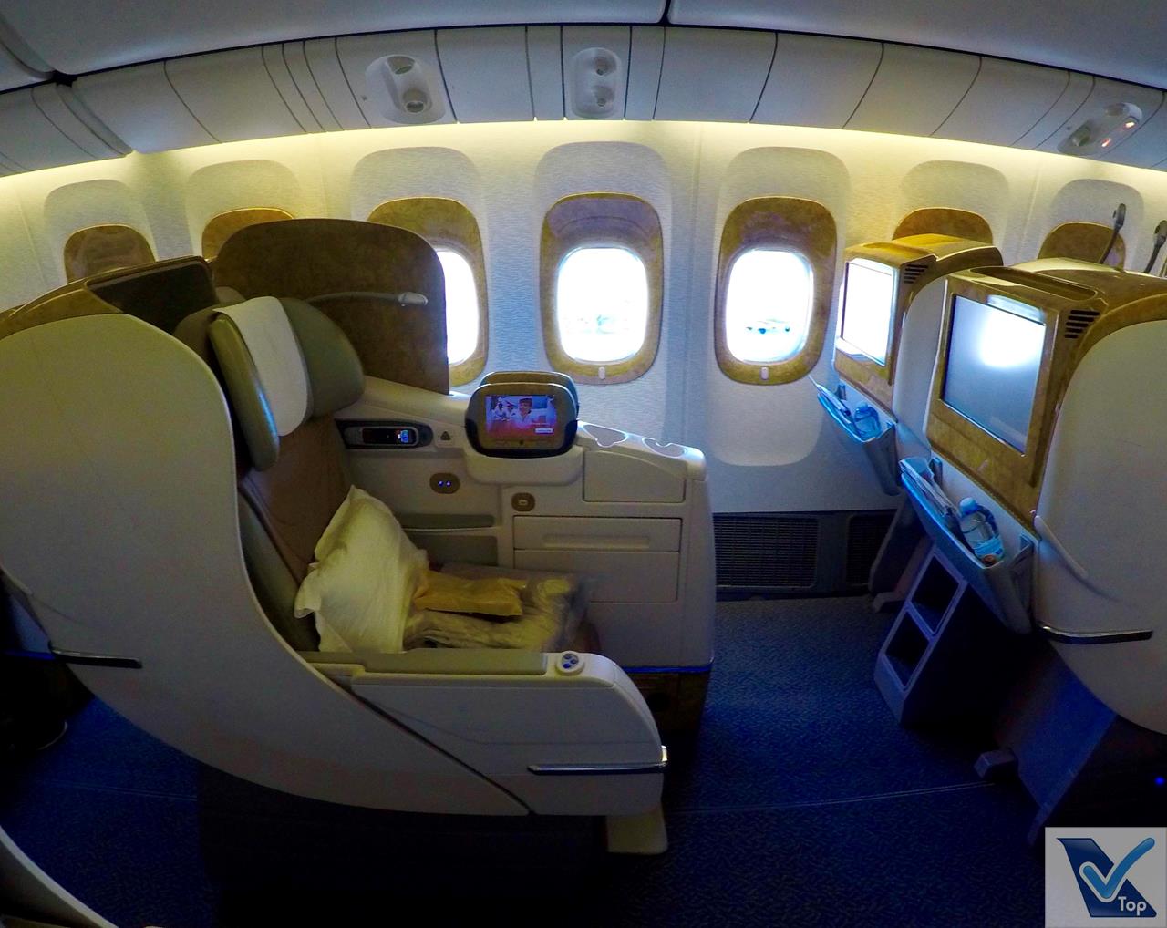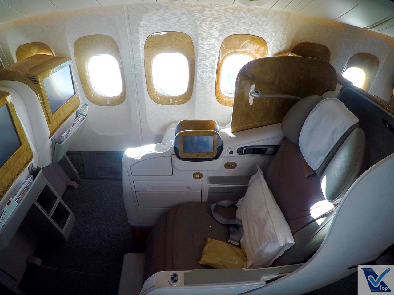– com o código do bilhete fornecido pelo Smiles, foi possível fazer reserva de assento diretamente no site da EMIRATES, de forma gratuita; a configuração da Executiva do B777 da companhia do Golfo Pérsico é semelhante à utilizada pela LATAM em seus aviões de mesmo modelo: 2 x 3 x 2, ou seja, dos 42 assentos, somente 24 permitem que o passageiro tenha acesso direto ao corredor; além disso, há a tenebrosa poltrona do meio na parte central da aeronave; em resumo, não é uma boa estrutura; escolhi o assento 11D, um corredor, na última fileira da cabine