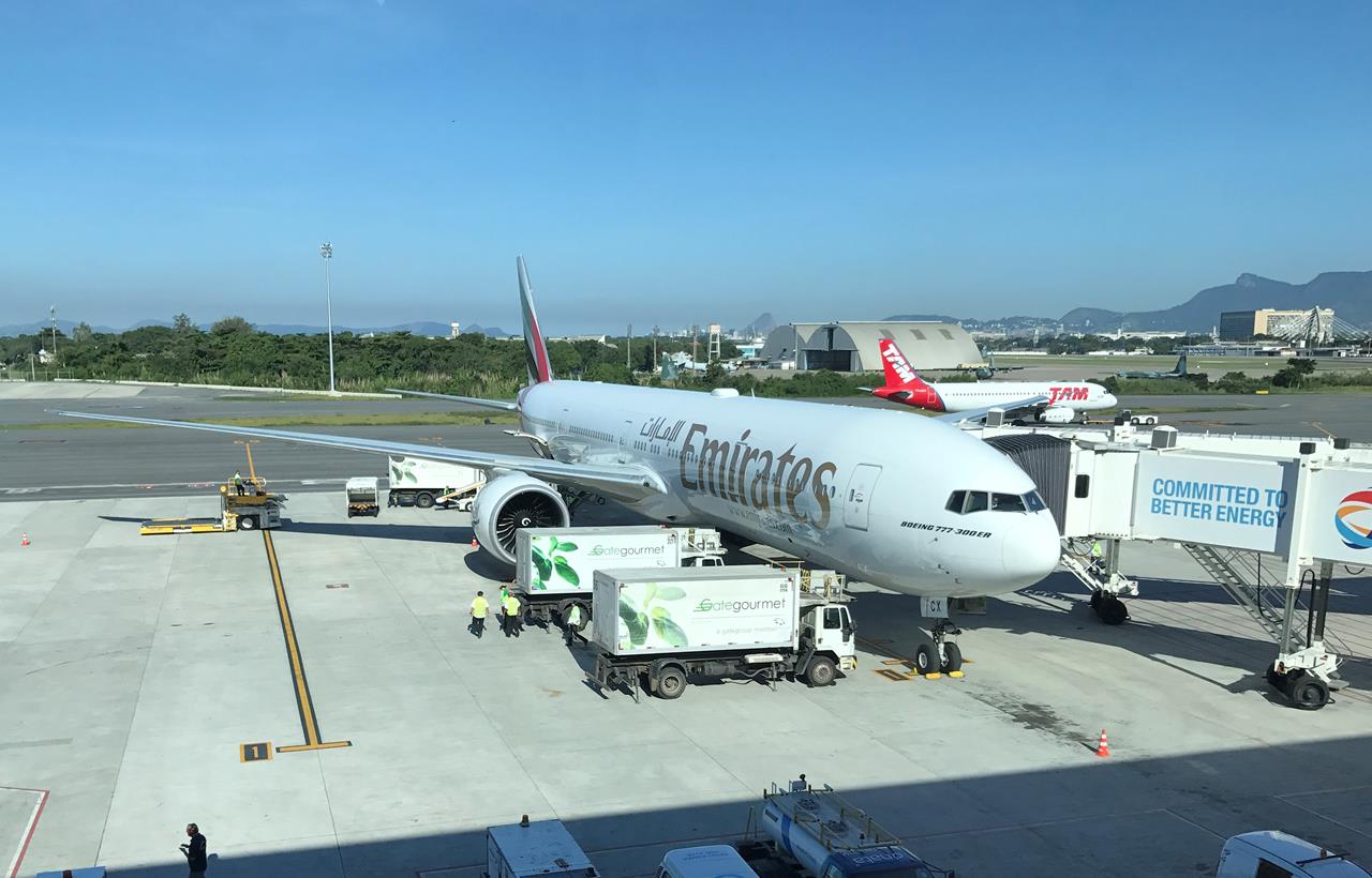 – aproveitei o dia céu claro e os vidros limpos do saguão para tirar fotos de alguns aviões no pátio do GIG: B747-8 da alemã Lufthansa, A330 da portuguesa TAP (que carrega o apelido “Pedro Alvares Cabral”), B737-800 da GOL, B777-300ER da angolana TAAG, além do B777-300ER da EMIRATES que me levaria a Buenos Aires