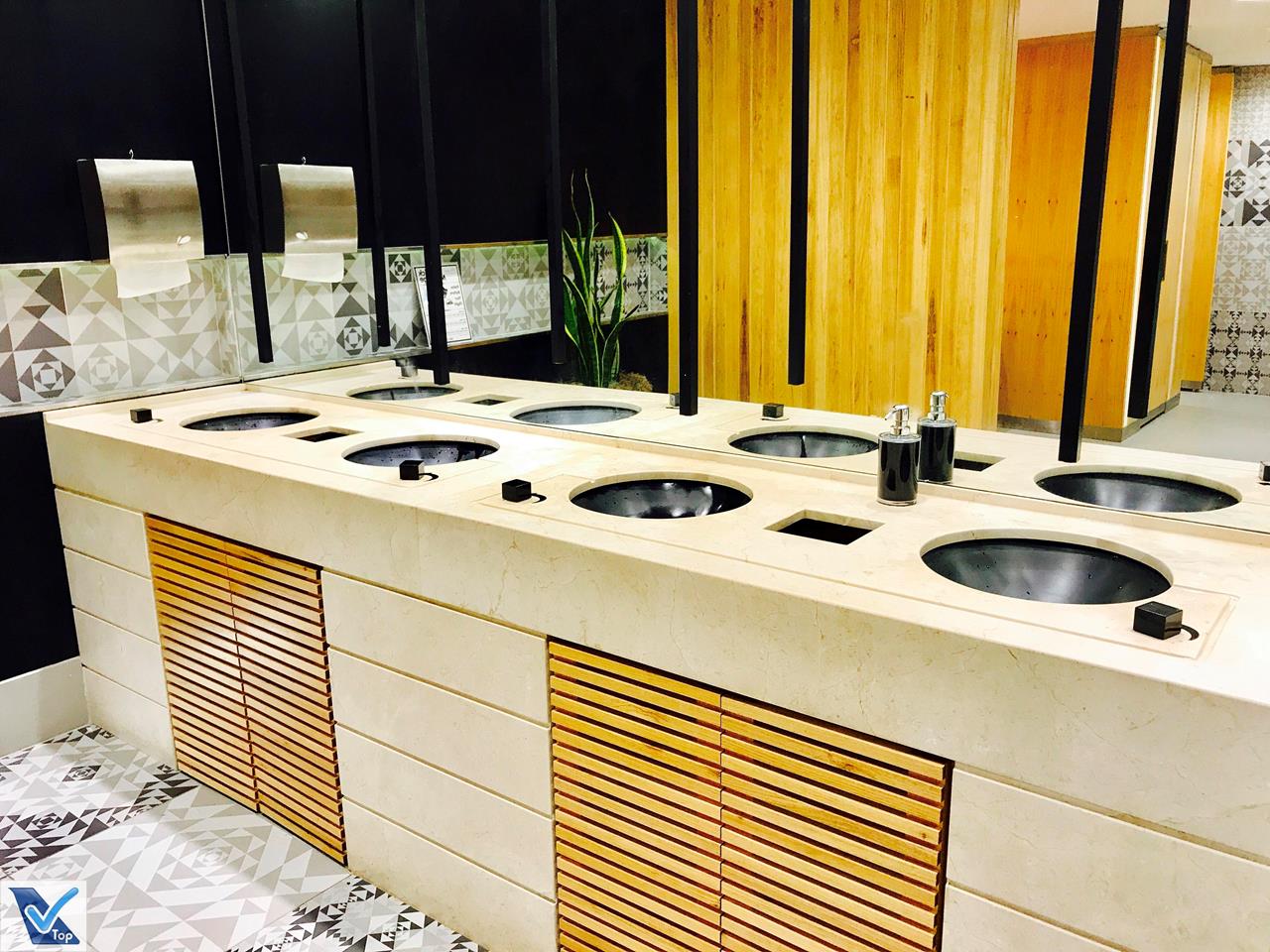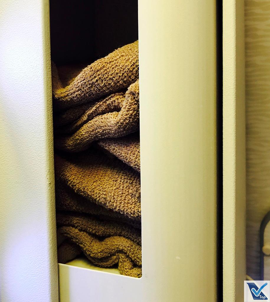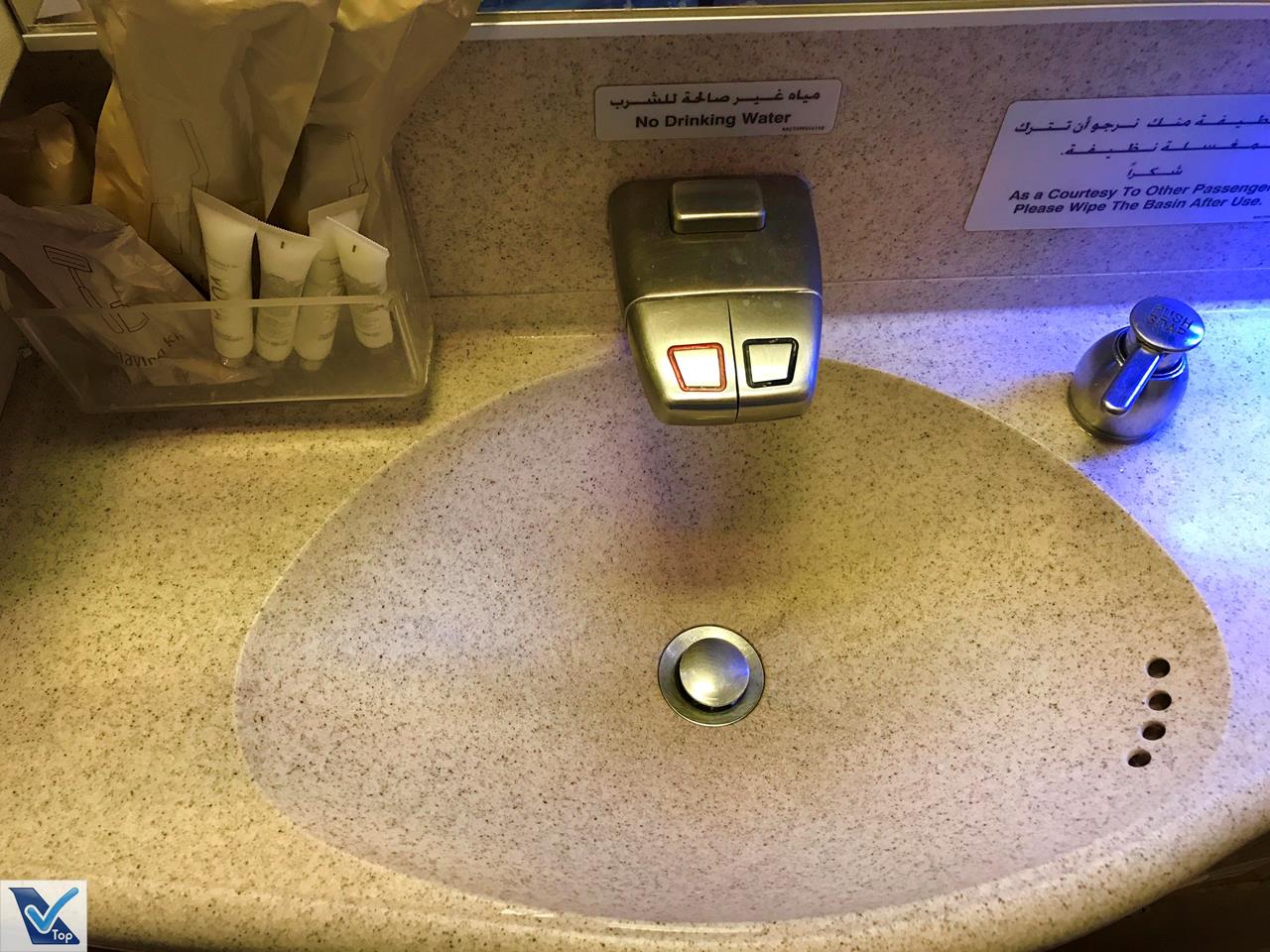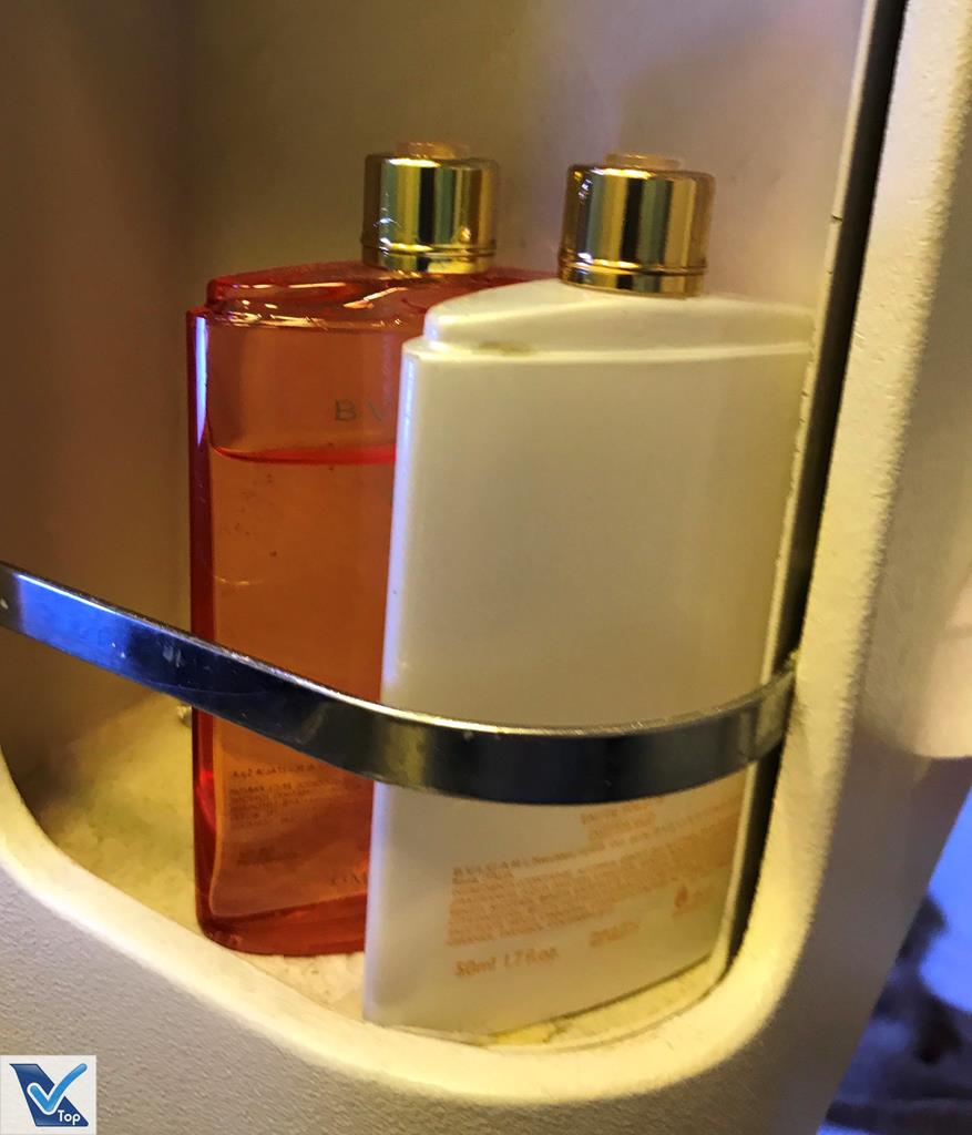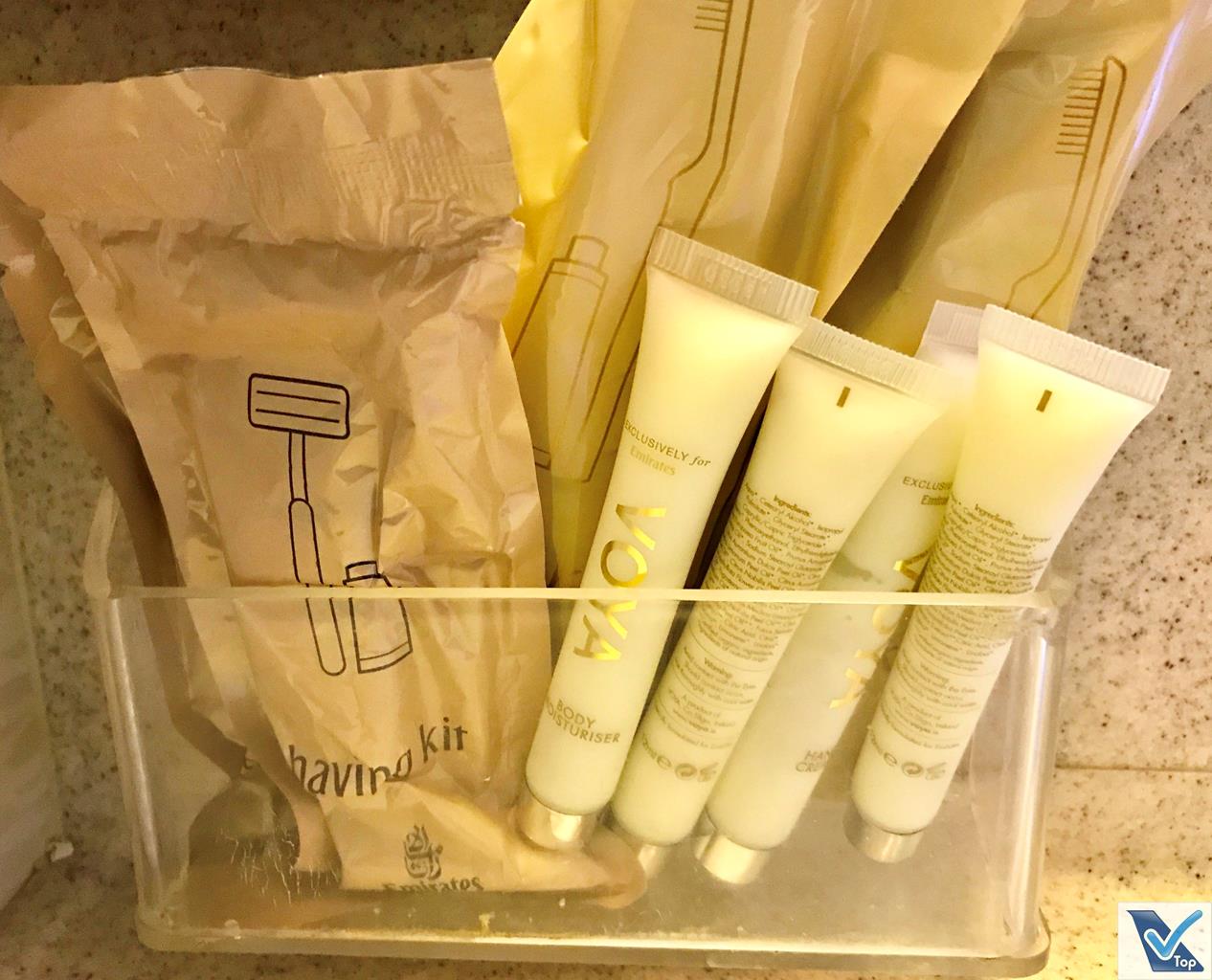 – em seguida, levantei e fui conhecer o banheiro localizado à frente da seção de cabine onde eu estava: era pequeno, mas não chegava a ser apertado; estão disponíveis ao lado da pia body lotion, kit de barbear e kit dental de boa qualidade; para enxugar as mãos, além de toalha de papel, toalhas de pano (marrom) também podem ser usadas