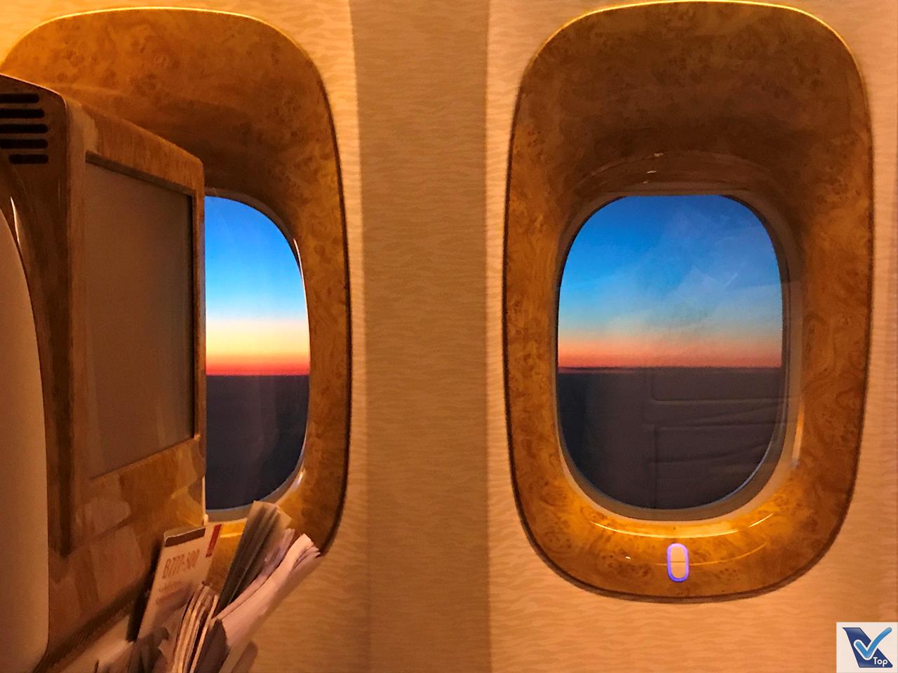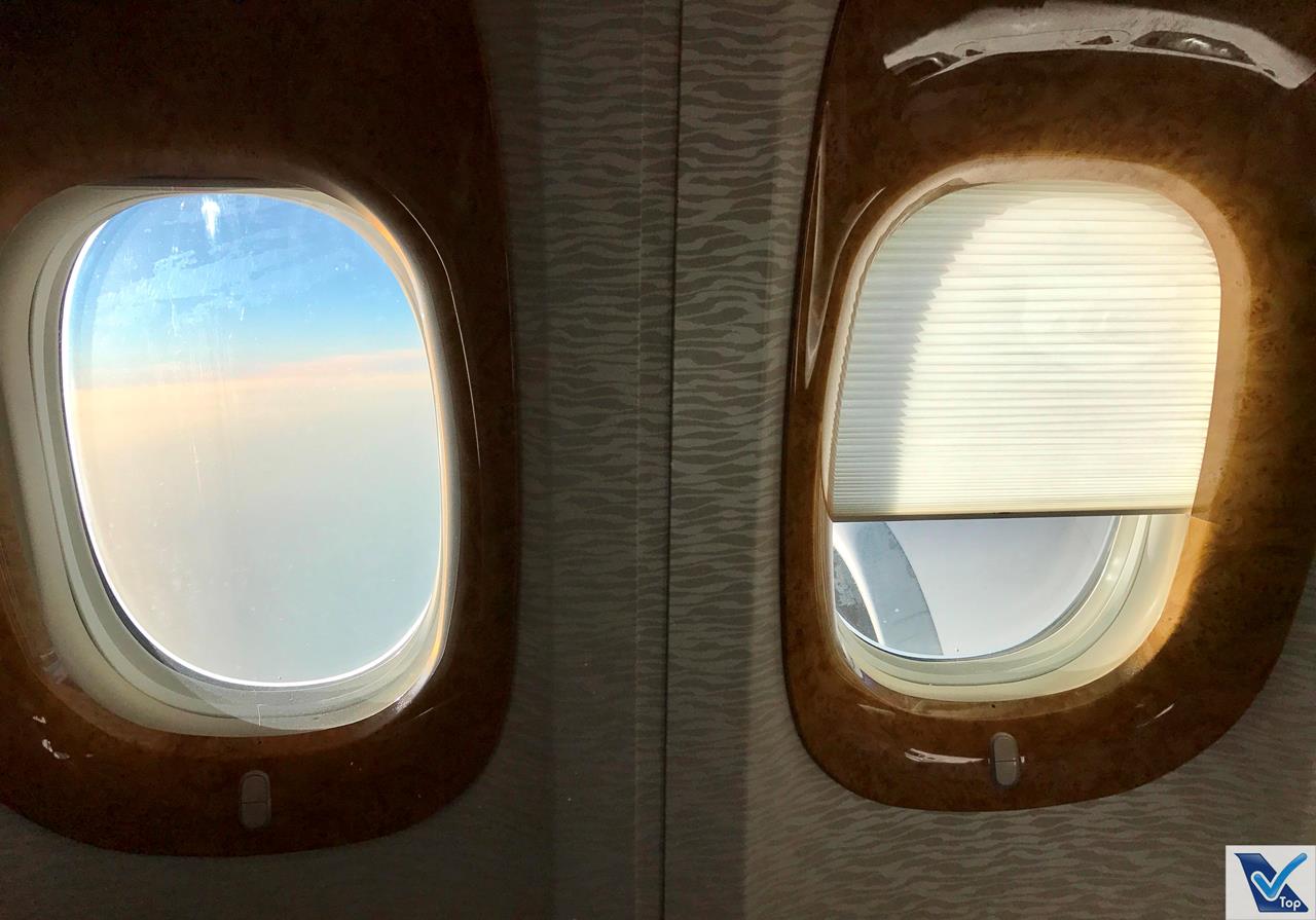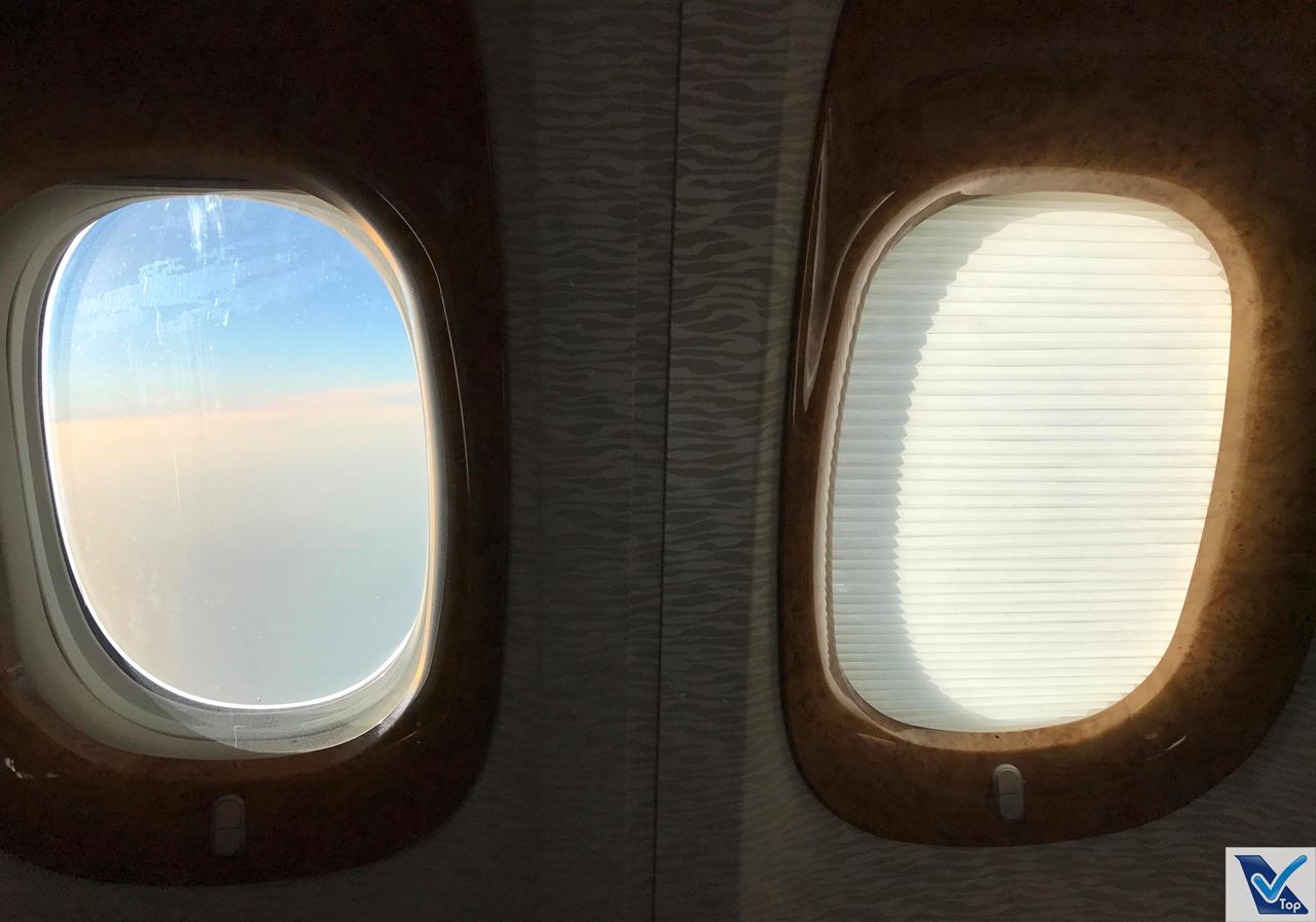 – outro detalhe do luxo oferecido pela EMIRATES é o sistema de cortina das janelas na cabine Executiva: um sistema eletrônico faz subir e descer uma charmosa cortininha sanfonada
