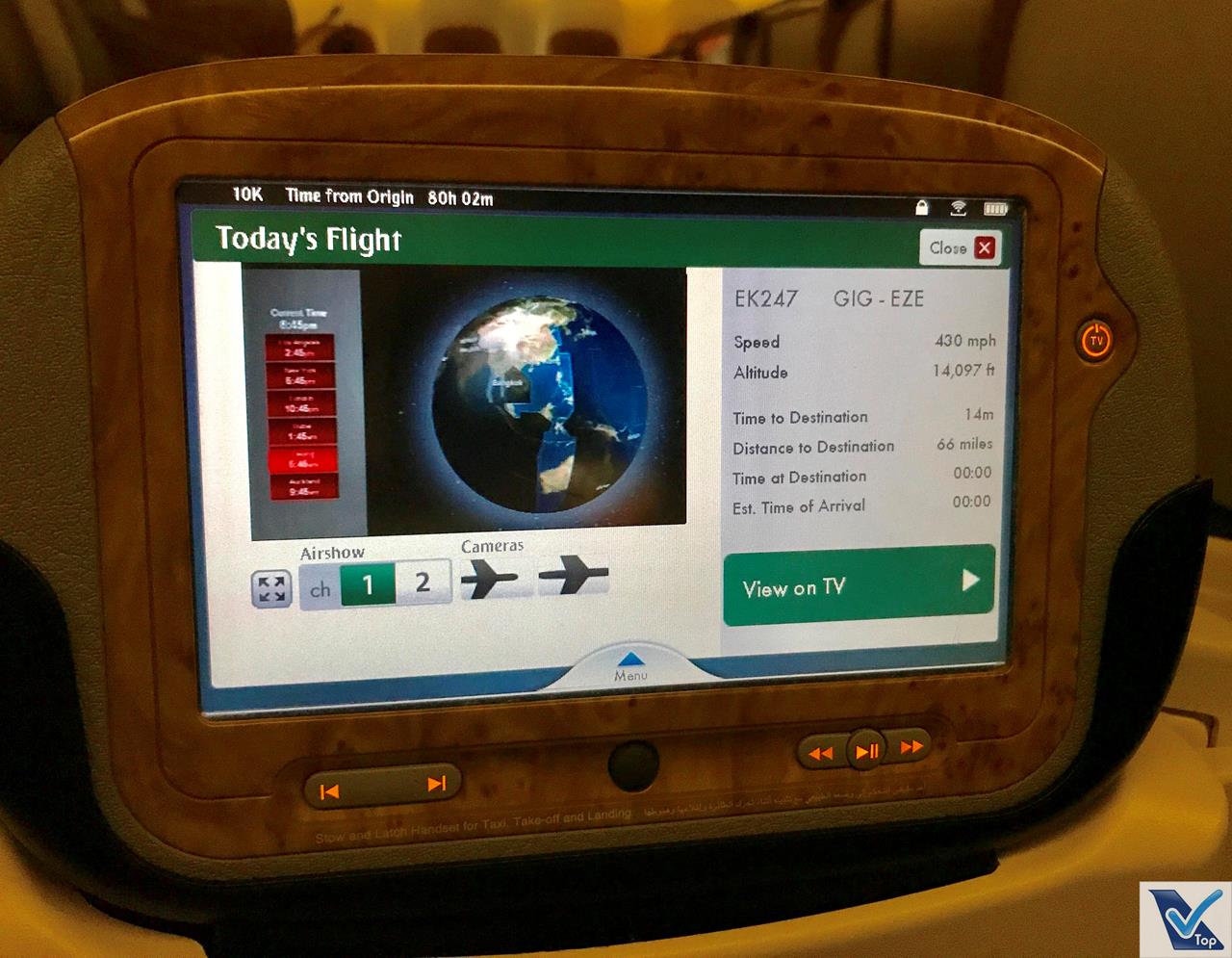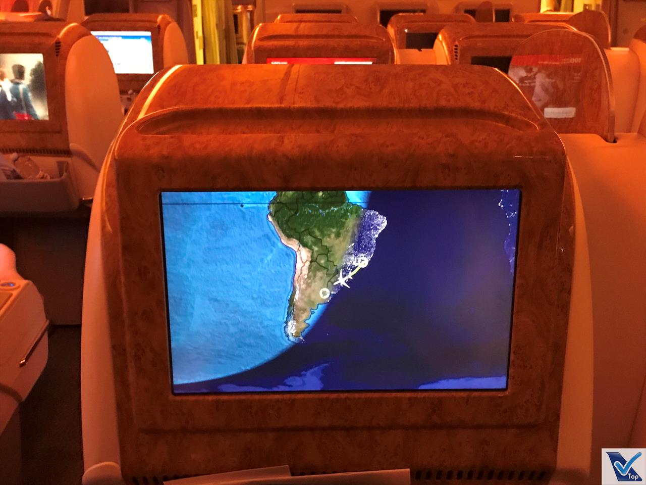 – o sistema de entretenimento é simplesmente excelente, em todos os sentidos: (i) o tamanho da tela (que tem a borda em madeira imponente) impressiona, (ii) a resolução da tela, (iii) a quantidade de conteúdo disponível, inclusive em português (não resisti e revi o último filma da saga Star Wars – Rogue One) e (iv) a qualidade do fone de ouvido distribuído, que realmente isola os sons exteriores; é possível também acompanhar o andamento do voo, com informações atualizadas sobre velocidade, altitude e localização