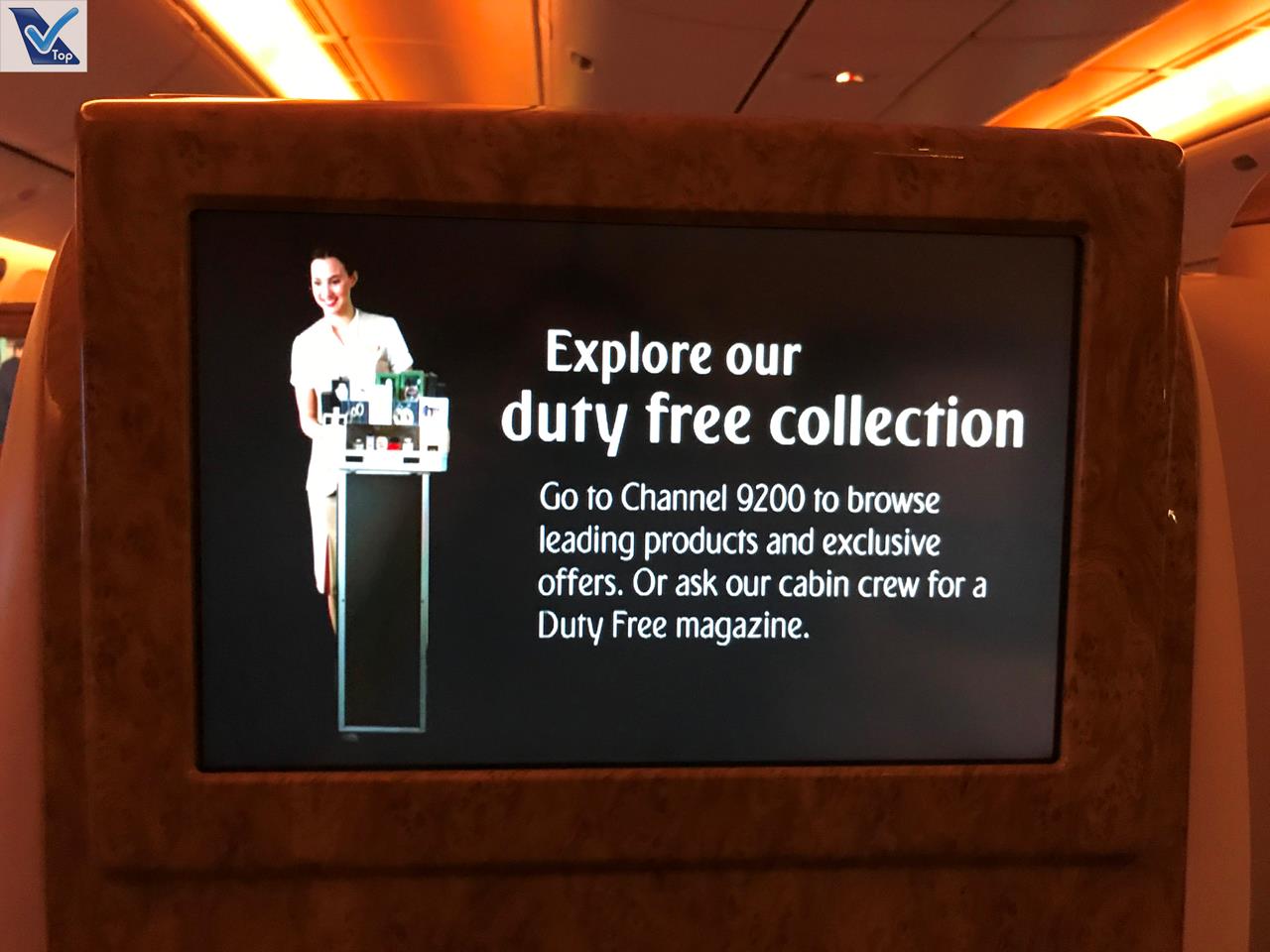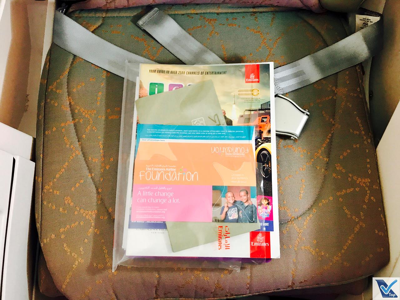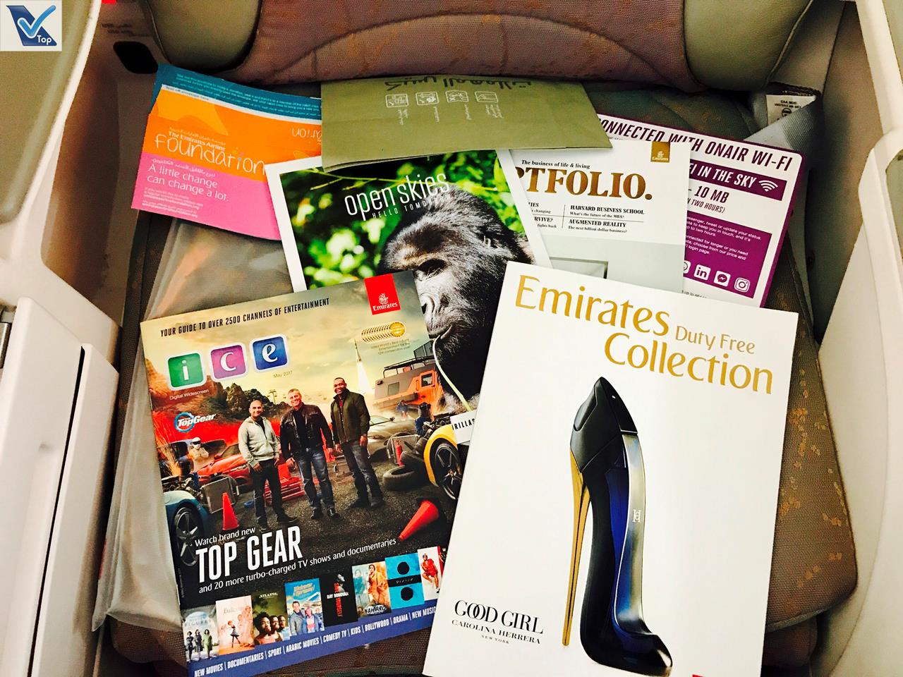 – no bolsão da poltrona à frente, uma pastinha de plástico traz: cartão com intruções de segurança, catálogo de venda a bordo (também disponível no sistema de vídeo), guia da tela de entretenimento, entre outros; me interessei pelo Duty Free: quis comprar um conjunto de miniaturas do aeroporto de Dubai, para levar para minha filha de 04 anos, que já gosta de aviões como o pai…