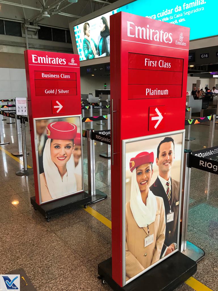 – cheguei às 13:20h na Asa G do aeroporto, onde estão os balcões de check-in da EMIRATES (são 05 no total, 03 dedicados para a Econômica, 01 para Business e Gold/Silver no Programa Skywards e 01 para Fisrt Class e Platinum – a companhia não disponibiliza totem de auto-atendimento), que ainda estavam fechados; cerca de 10 passageiros faziam uma pequena fila; os funcionários começaram a chegar perto de 13:30h e logo depois começaram o atendimento