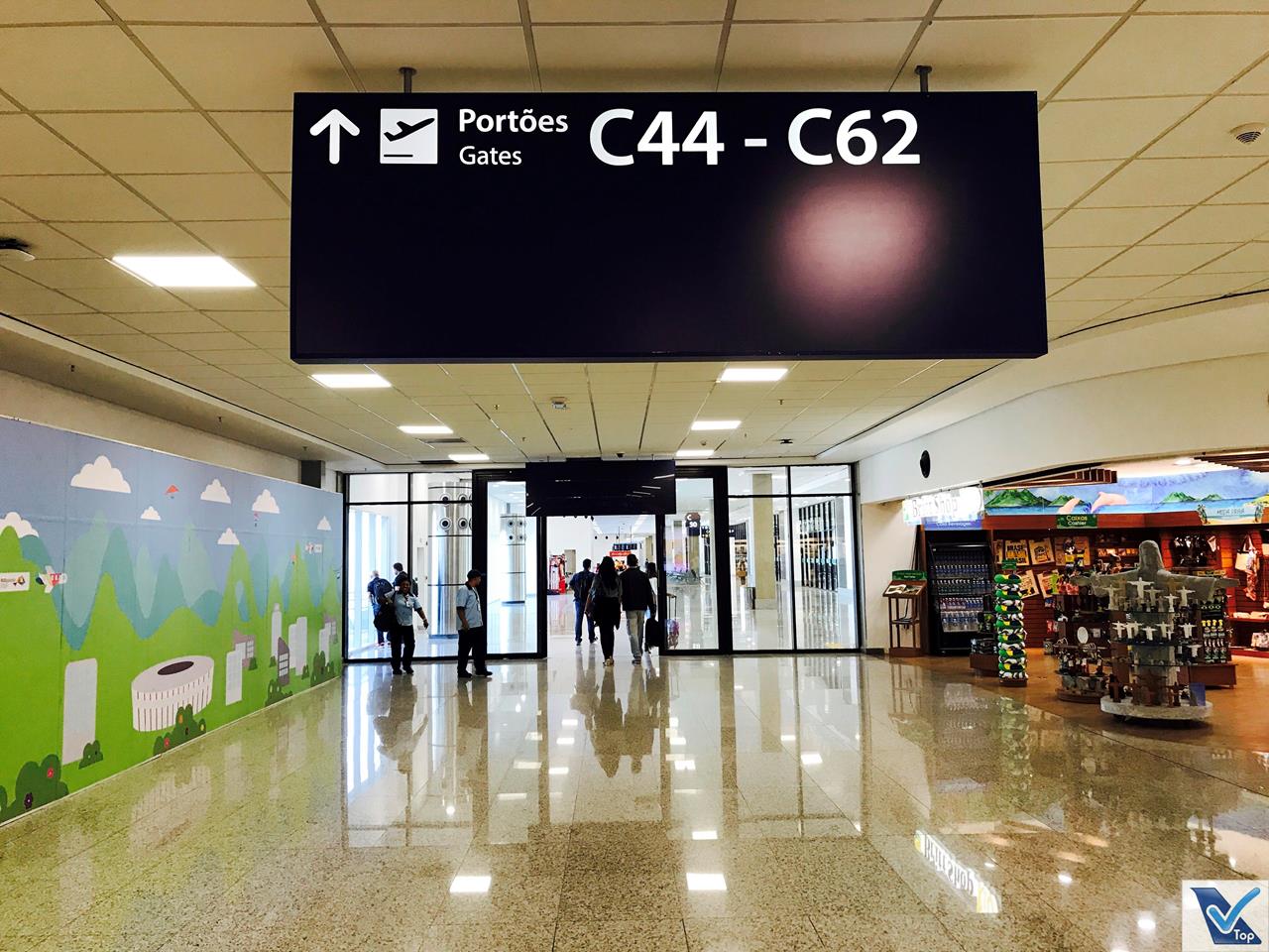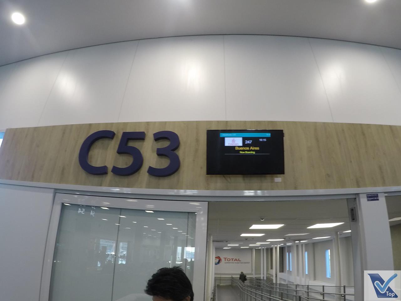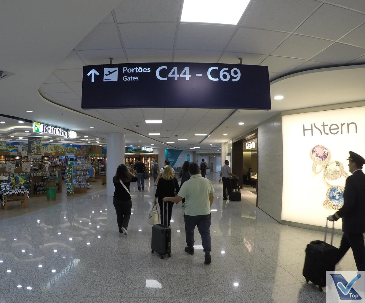 – no caminho até os portões de embarque, os passageiros são obrigados a passar por uma gigantesca loja de Free Shop e depois por uma pequena praça de alimentação; depois, é preciso subir uma escada rolante e passar por mais uma loja de Free Shop; os portões “B” ficam logo a direita (trata-se da antiga área internacional do Terminal 2 do GIG) e a esquerda tem um looooooongo corredor com esteiras rolantes que levam à área dos portões “C”; no total, o trajeto do check-in até o portão C53 levou um pouco mais de 20 minutos (a administração do aeroporto oferece um carrinho elétrico para pessoas com dificuldade de locomoção, somente entre 06h-10h e 18h-22h)