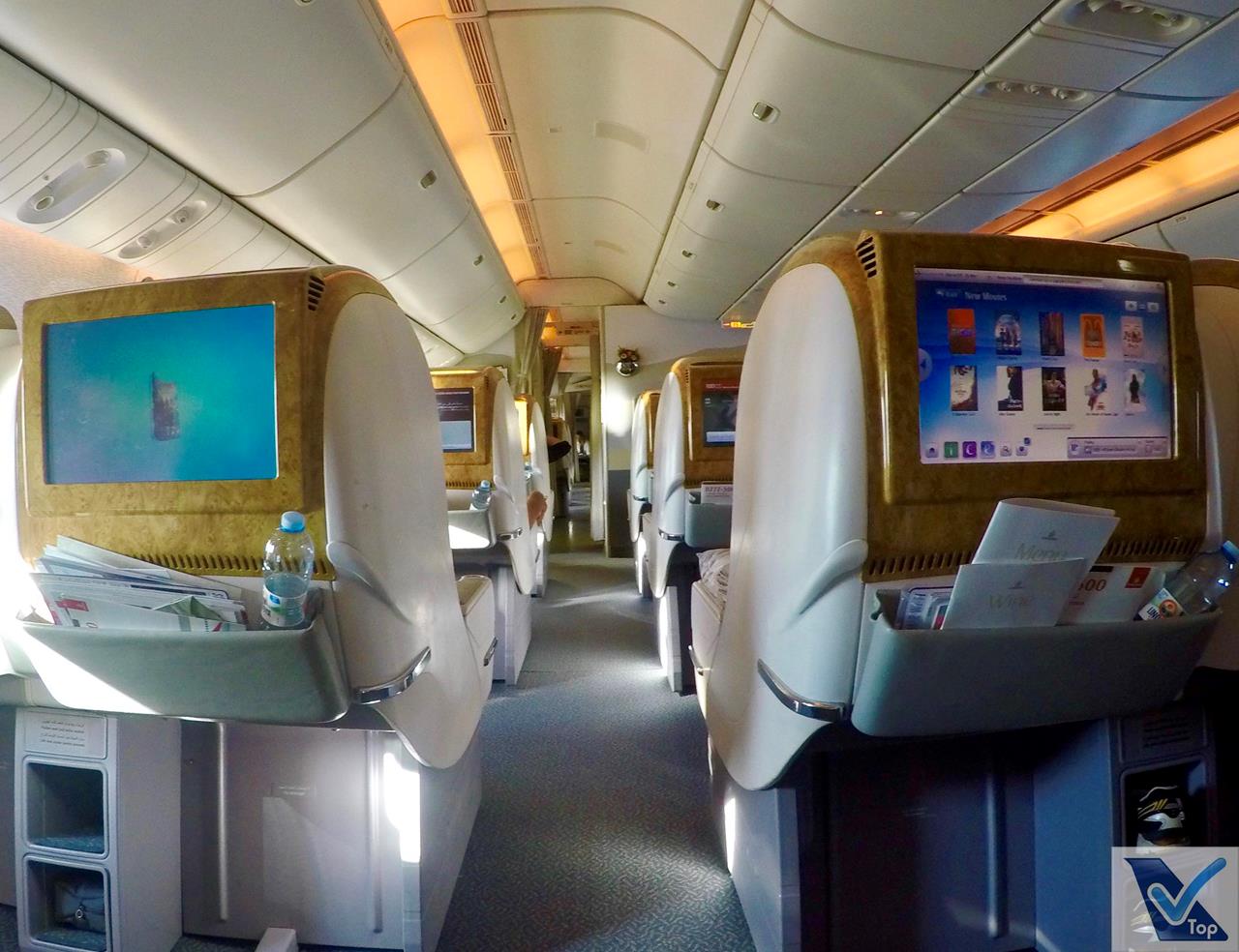 – a “máquina” escalada para este voo tinha o prefixo A6-ECX, entregue à EMIRATES em 25.11.2009 (que linda data! dia que fiz 35 anos…) e está muitíssimo bem conservado; lembrando: a classe Executiva pode acomodar até 42 “sortudos” (neste dia, somente 20 ocupavam) em 06 fileiras com 07 poltronas; na Econômica são até 304 passageiros e mais 08 na Primeira Classe; a configuração de cabine é 2 x 3 x 2, que é um ponto negativo: enquanto outras cabines de companhias “de luxo” permitem que todos os passageiros da Business Class tenham acesso direto ao corredor, isto não acontece com este Boeing da EMIRATES, na verdade, apenas 12 pessoas têm o “benefício”