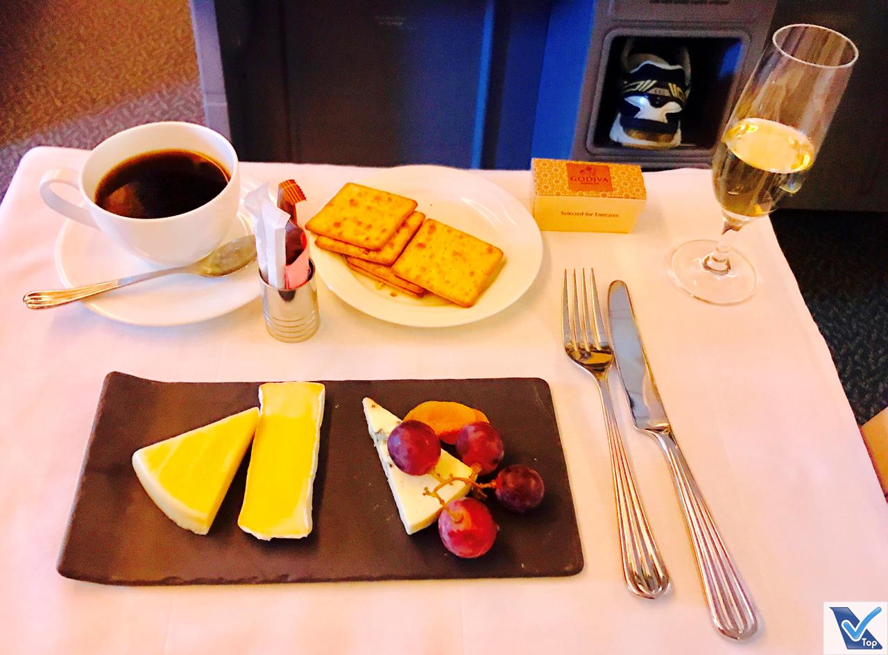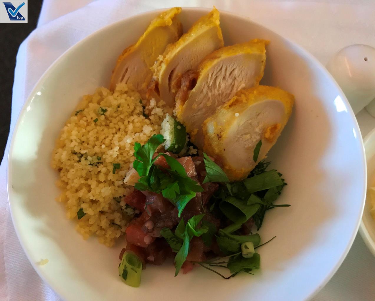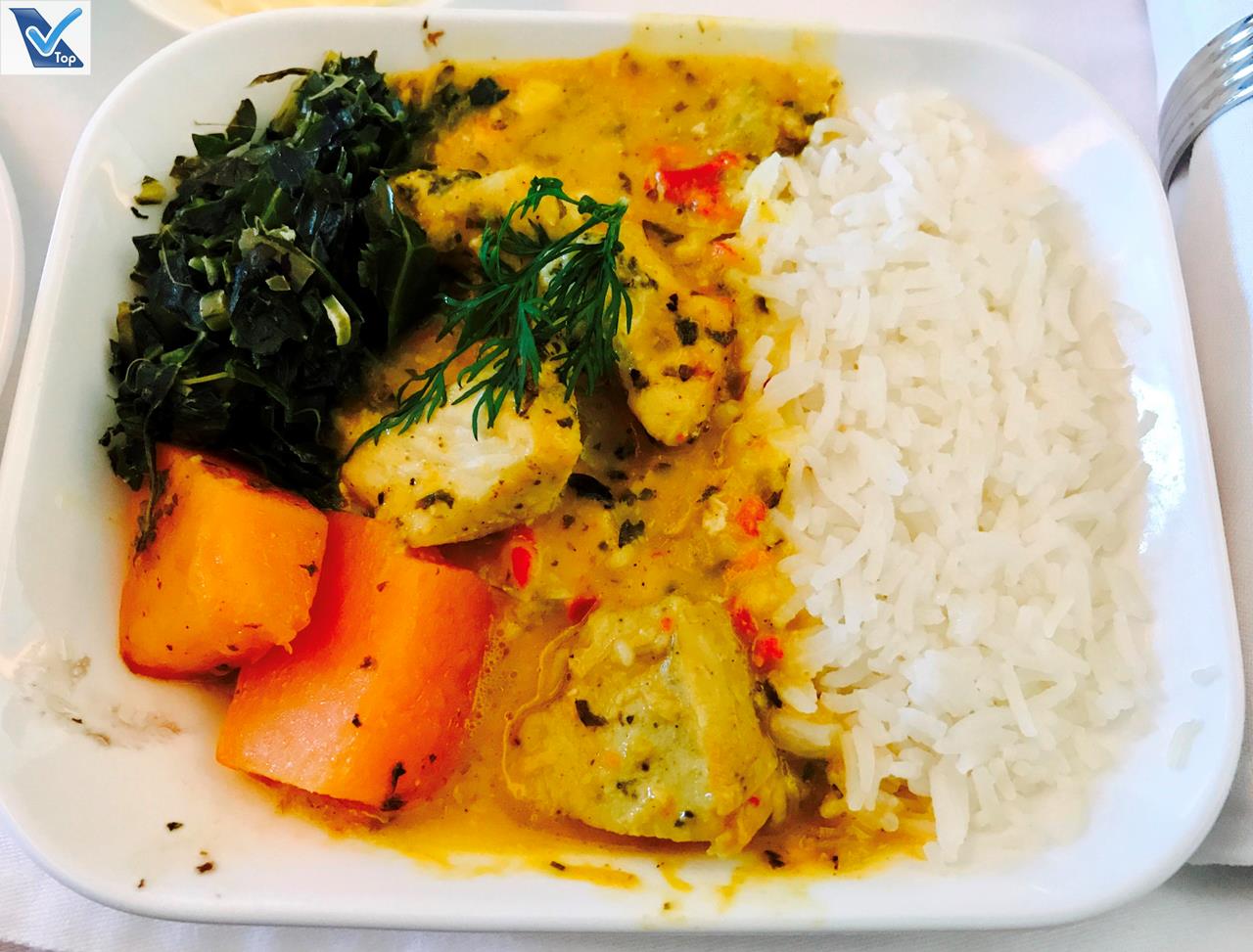 – finalmente, por volta de 17:30h, chegou a hora do jantar; eu optei pelo frango com coco, uma escolha sempre segura para mim, que estava acompanhado de arroz de jasmim e couve salteada com abóbora; a entrada era um frango com açafrão com salada de couscous e berinjela; tudo estava com ótimo sabor e apetitoso, uma excelente refeição; de sobremesa, pedi a seleção de queijos, todos frescos, com café preto para acompanhar; como toque final, uma caixinha com 02 bombons Godiva; não preciso nem dizer: o champagne foi renovado o tempo inteiro