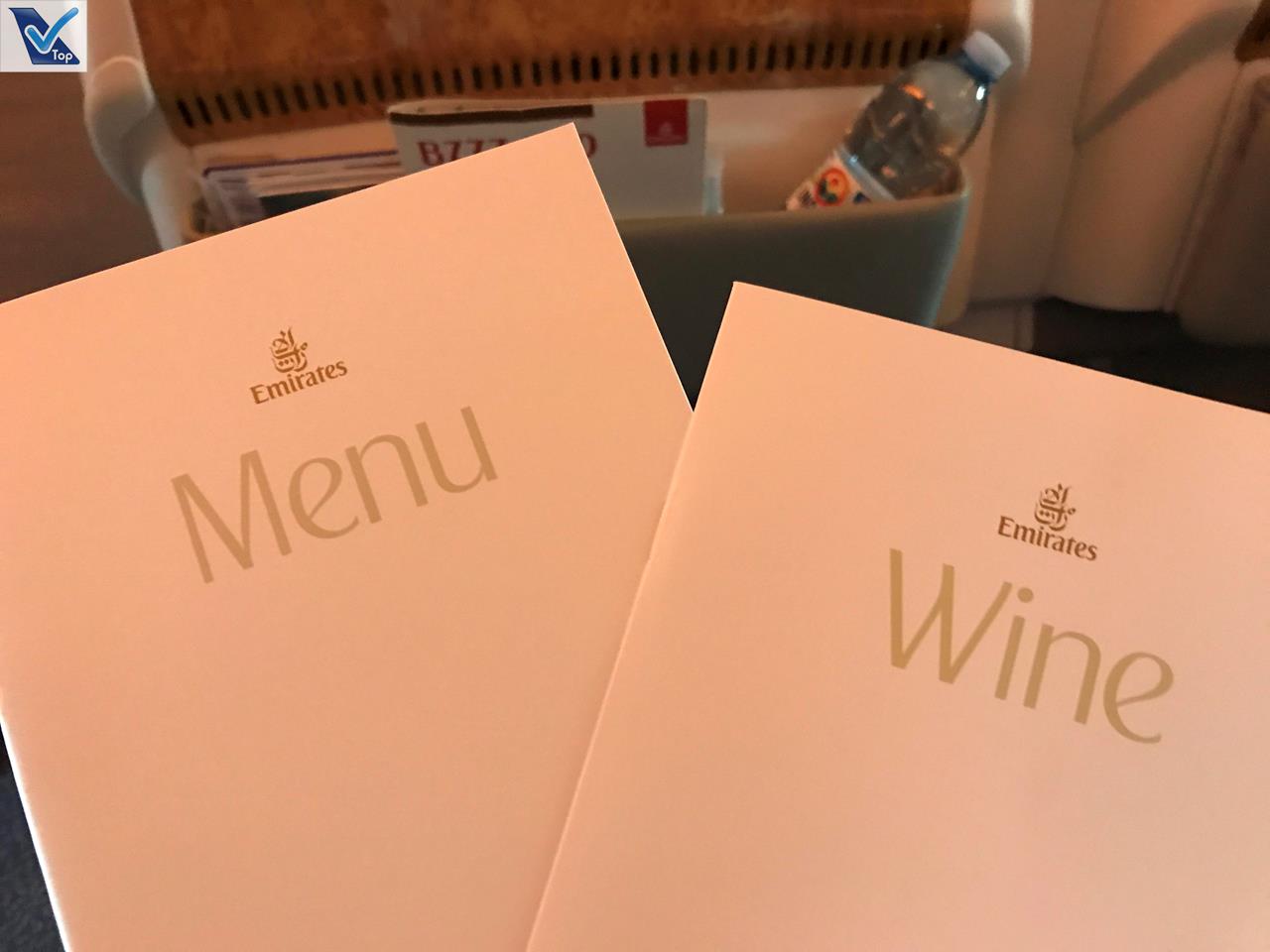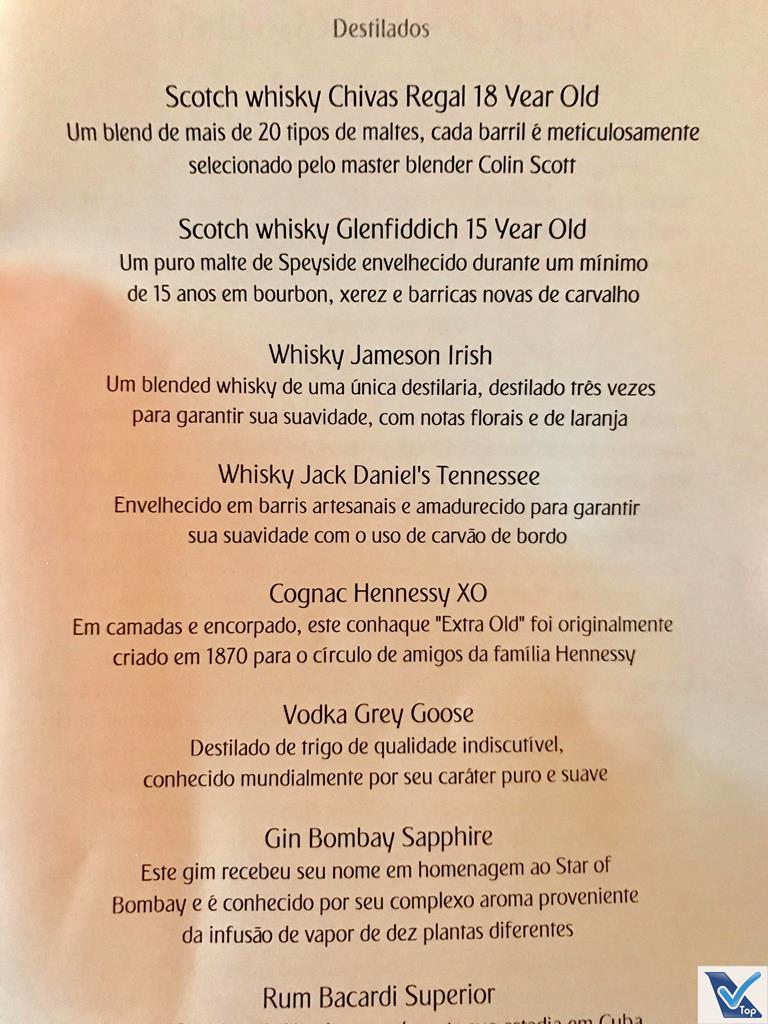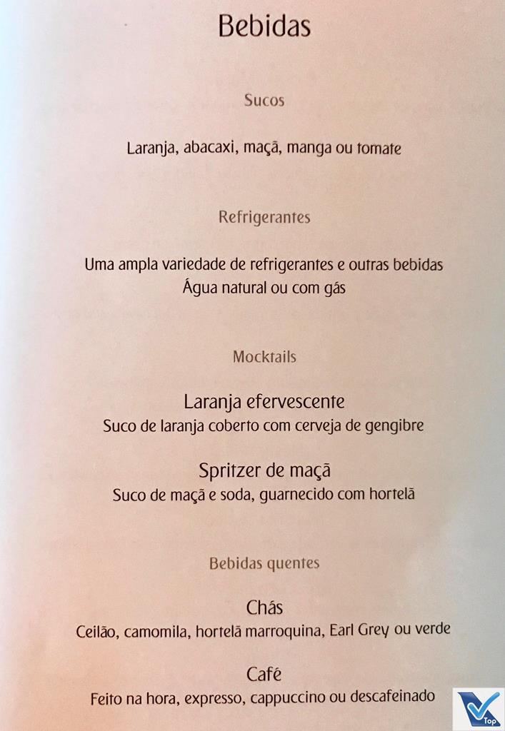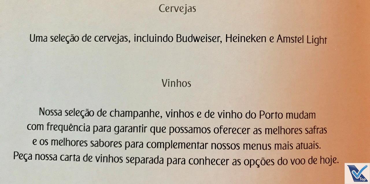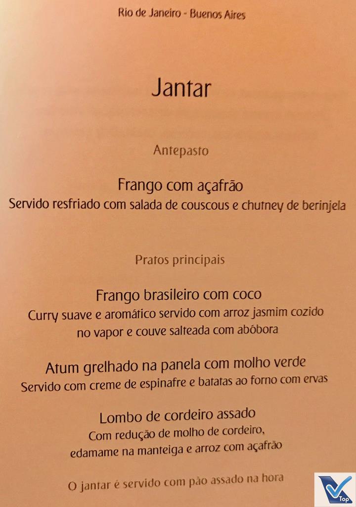 – logo depois que o sinal de apertar cintos foi apagado, Inês chegou para anotar o meu pedido para o jantar, me entregando o menu de refeição e a carta de vinhos; a varidade de opções é a 1ª coisa que chama a atenção: para comer, opções de frango, atum e cordeiro e 04 opções de sobremesa; para beber, 05 tipos de sucos, refrigerantes, 03 marcas de cerveja, opções de cocktails com álcool e destilados (vodka, whisky, conhaque, gim e rum)