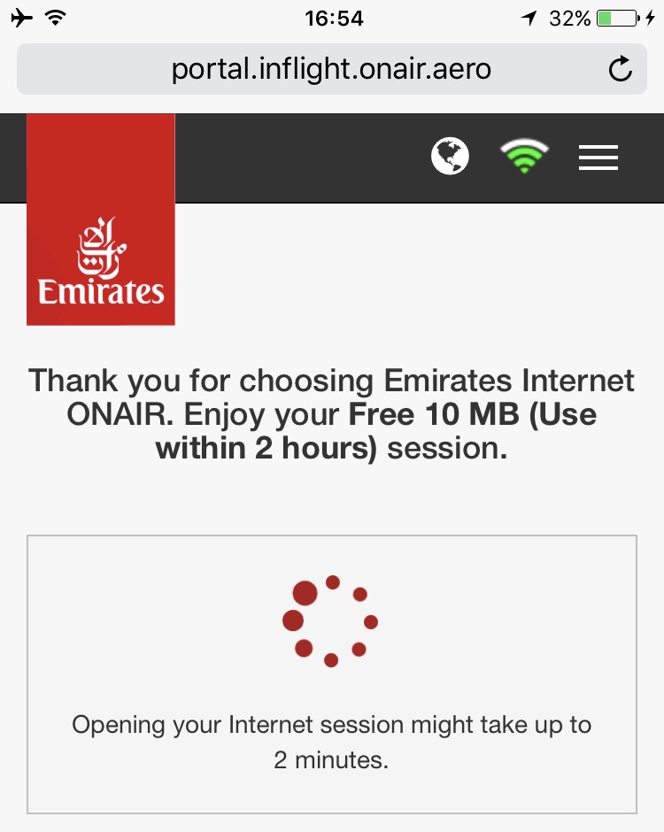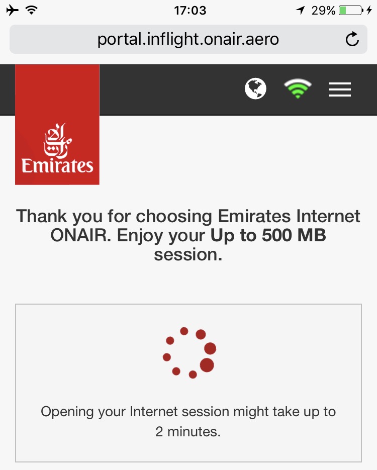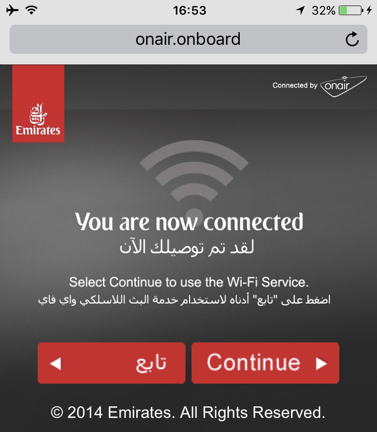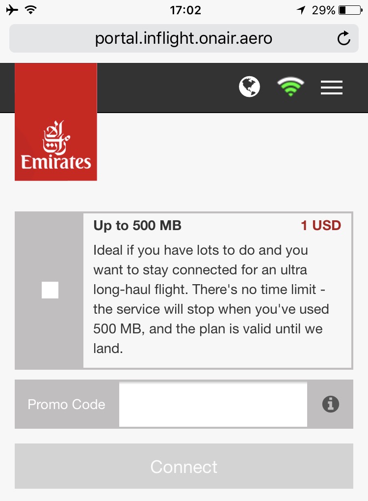 – a EMIRATES oferece conexão wi-fi a bordo para todos os passageiros: são 10Mb de franquia grátis, mas também é possível comprar 500mb por apenas 01 dólar; é muito fácil estabelecer a conexão e usar a franquia gratuita e também é simples comprar a capacidade adicional, basta fornecer os dados do cartão de crédito