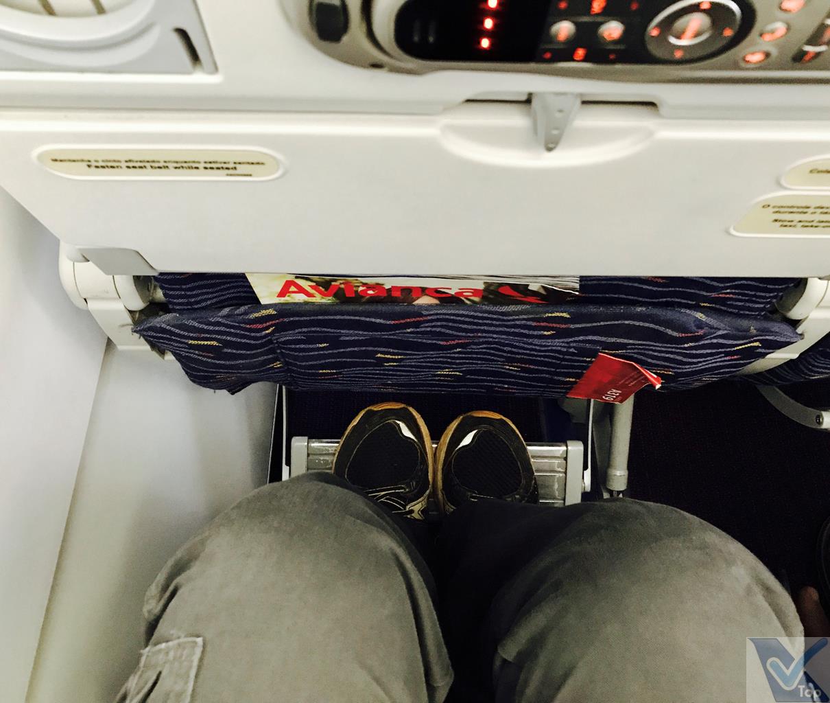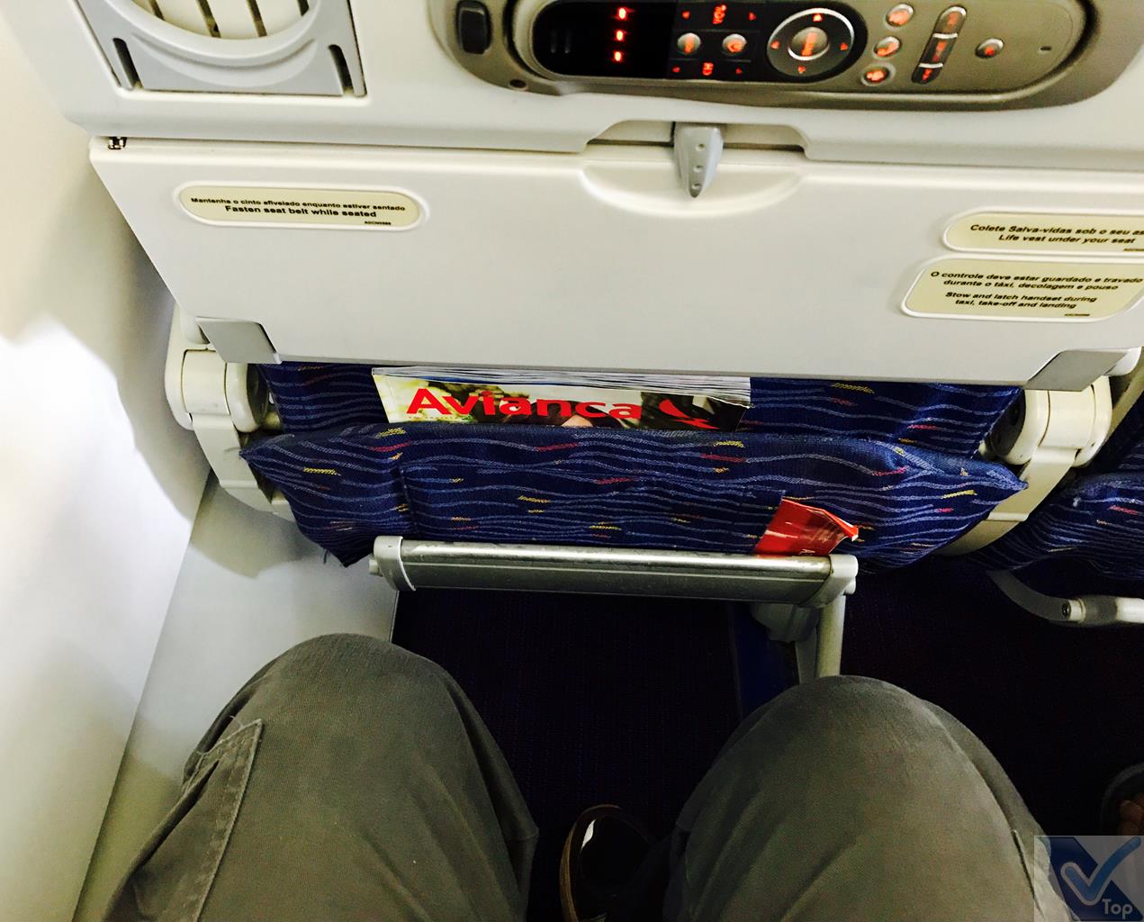 – as poltronas estão revestidas de tecido azul escuro; apoio para os pés é um diferencial nos Airbus da AVIANCA, mas o espaço é apertado para as pernas; além disso, o encosto de cabeça tem regulagem de altura, outra amenidade dos aviões da companhia