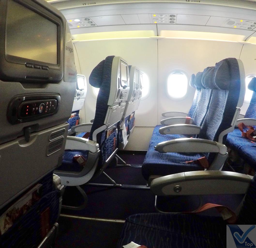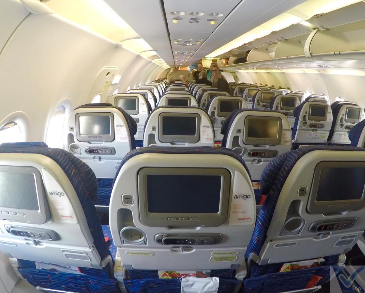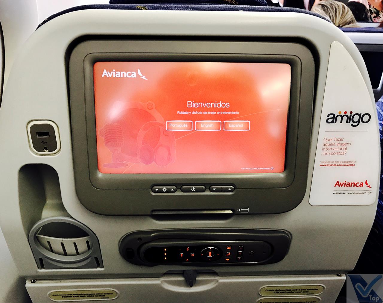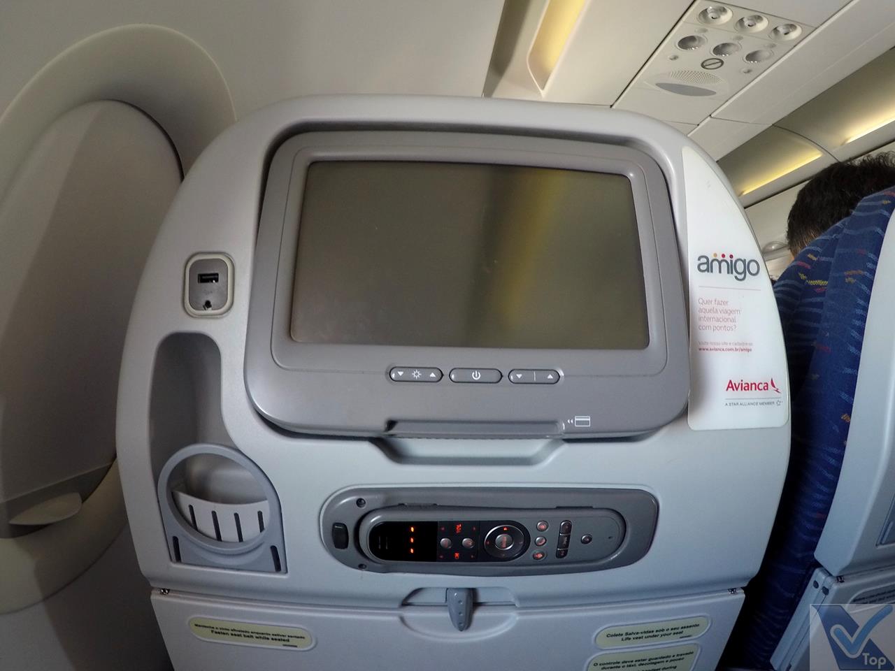 – o sistema de entretenimento tem tela individual de resolução apenas razoável; não foram distribuídos fones de ouvido na entrada da aeronave como é comum nos voos da AVIANCA, mais tarde descobri que o sistema não estava funcionando, ou seja, uma das atrações da companhia simplesmente não estava disponível; uma porta USB permite que os equipamentos eletrônicos portáteis sejam carregados durante o voo