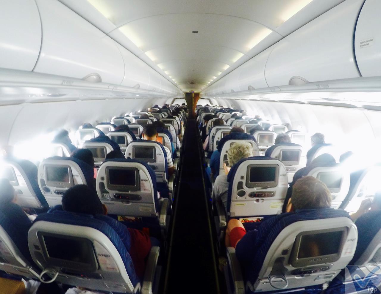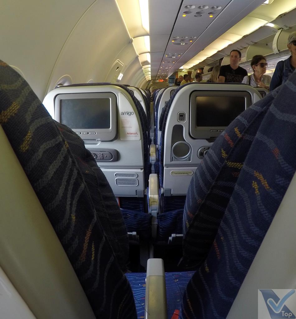 – a configuração de cabine no tradicional 3 x 3, com capacidade para até 132 passageiros; a minha poltrona era a 14A, uma janela do lado direito, bem em cima da asa do A319 (curiosidade: você sabia que a AVIANCA não tem poltrona “13” nas suas aeronaves?); o voo estava quase lotado, com ocupação acima de 95%