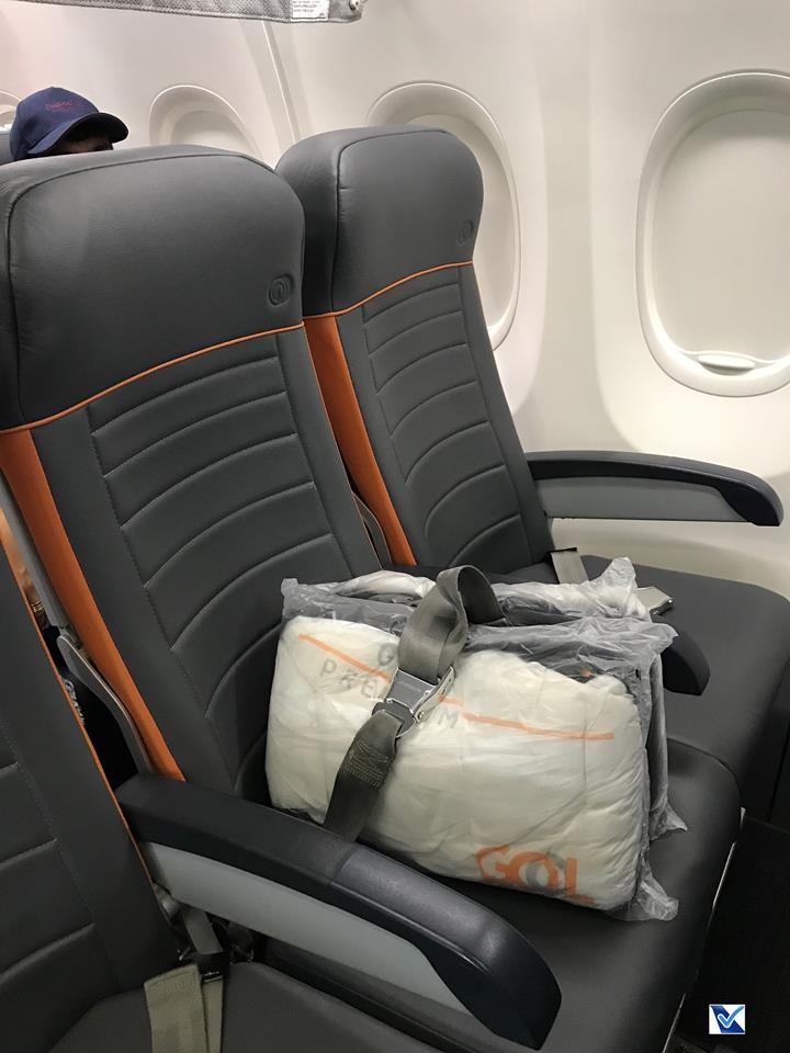 – nesta classe de serviço, o espaço para as pernas é maior do que o normal (os passageiros das fileiras 5 e 6 têm o mesmo “direito”) e permite que um homem cruze as pernas com relativo conforto; uma manta e um travesseiro (de tamanho apenas razoável) estavam presos pelo cinto no assento do meio; os bagageiros destas 04 primeiras fileiras estão identificados como sendo exclusivos para os passageiros da classe Premium; este B737 já carrega os novos bancos com revestimento de couro ecológico que a GOL lançou em dezembro de 2016