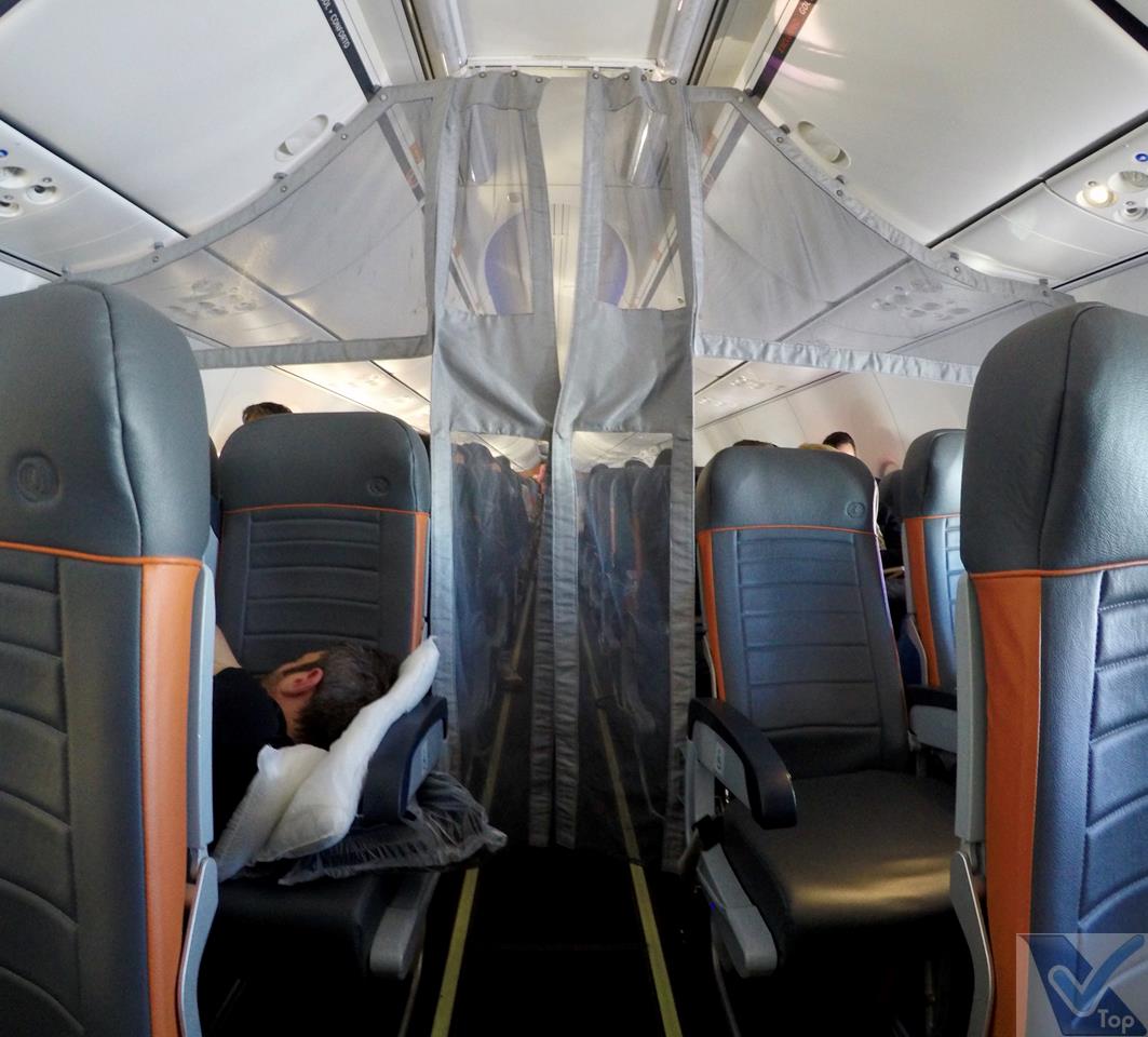 – dos 14 lugares disponíveis (são 06 do lado esquerdo – fileiras 2 a 4 – e 08 do lado direito – fileiras 1 a 4), apenas 05 passageiros ocupavam a classe Premium deste voo; já na classe Econômica a ocupação era bem maior, superior a 80%; a separação das cabines é feita por uma cortina tipo “rede”, que fica aberta durante as fases de pouso e decolagem