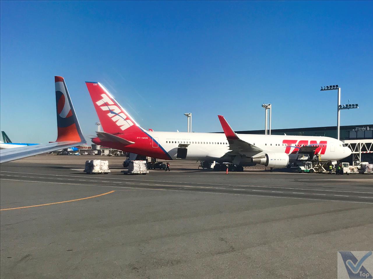 – a caminho do terminal, cruzamos com aviões de fuselagem larga da Alitalia (B777), Aerolineas Argentinas (A340), Iberia (A340) e LATAM (B767)