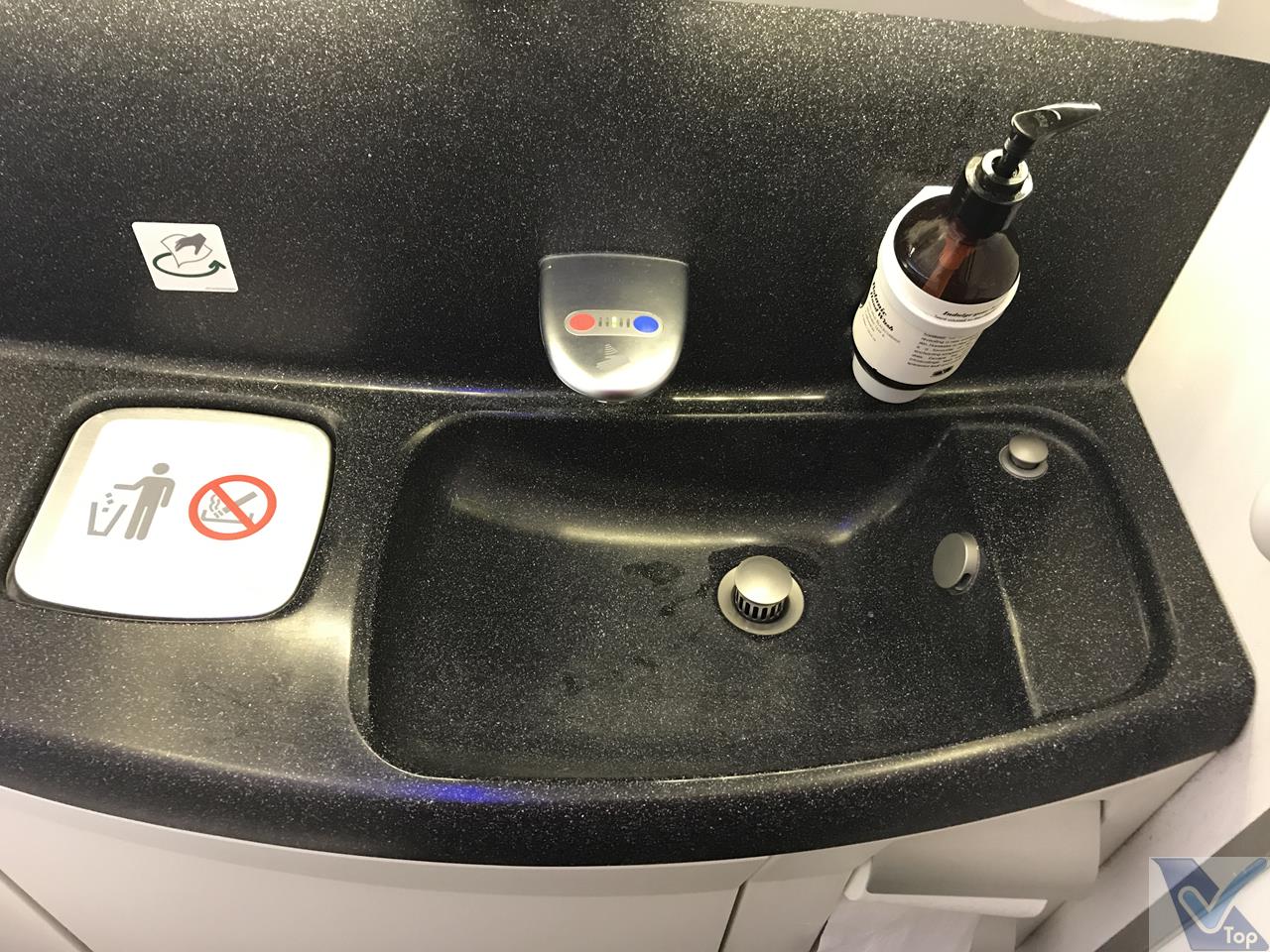 – depois de comer, voltei para a “minha cama” e deixei o computador carregando na outra poltrona; trabalhei na avaliação do voo da LATAM de SCL para AKL e acabei dormindo de novo, entre 14:00h e 16:00h; levantei e fui conferir como era o banheiro do B787 da Air New Zealand: de tamanho padrão, as toalinhas para enxugar as mãos são de pano e a parede era decorada com borboletas
