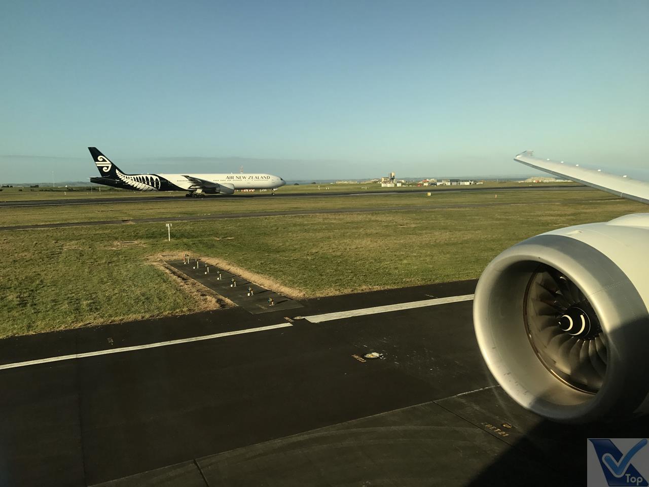 – o pushback foi iniciado às 08:55h, portanto, o voo estava começando rigorosamente no horário; o taxiamento não foi longo, porém extremamente lento; a pista em Auckland fica ao lado do mar, portanto, uma bela paisagem para a decolagem; cruzamos com alguns aviões de grande porte, iniciando seus voos
