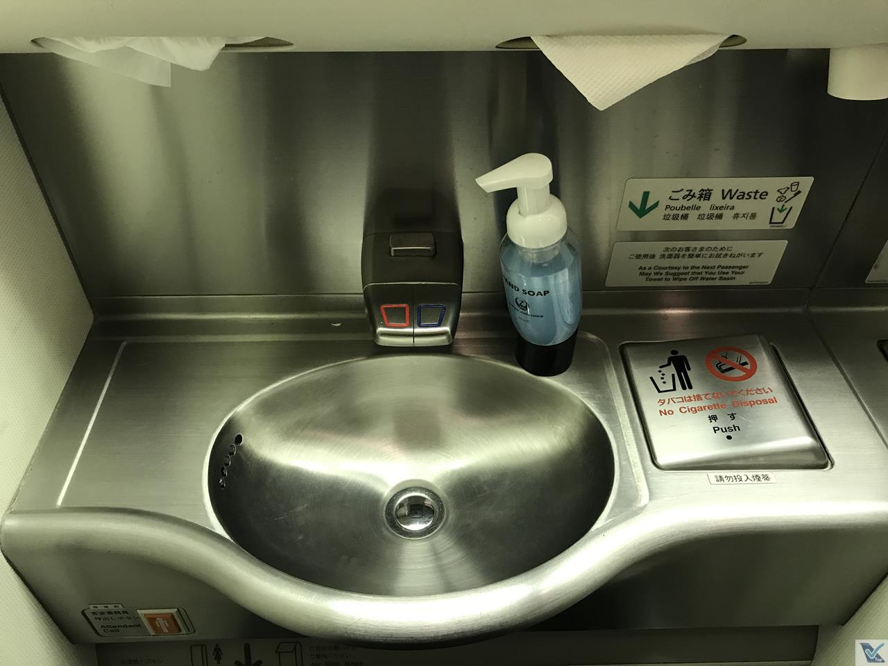– pedi licença à senhora sentada ao meu lado e fui lá na parte traseira do Boeing conferir um dos dois banheiros instalados; de tamanho apenas razoável, limpo e sem nenhuma amenidade oferecida aos passageiros; na volta, aproveitando que estava vazia, registrei a estrutura da “cozinha” do avião (reparem na limpeza e organização)