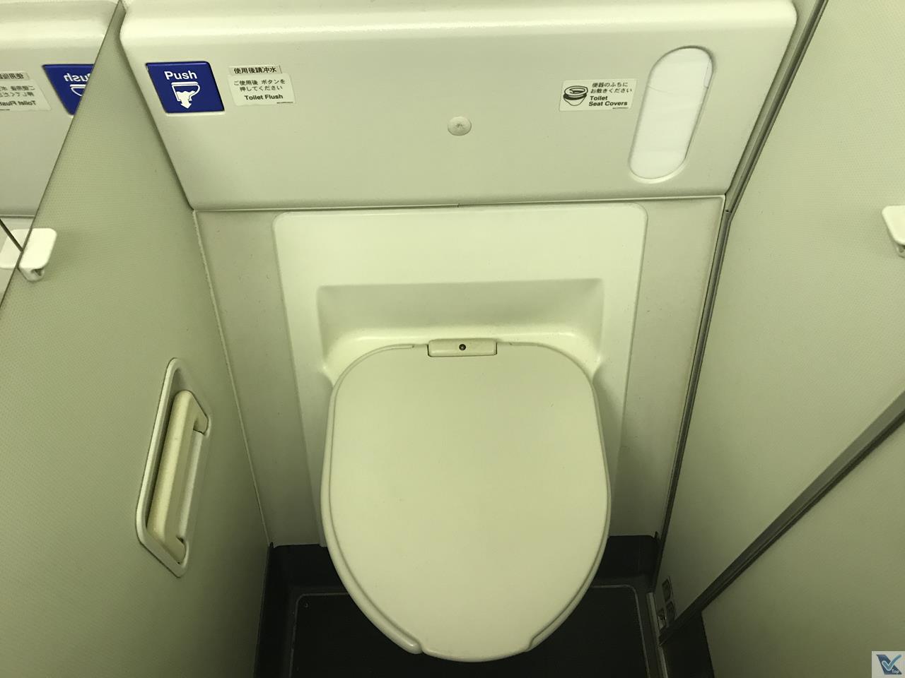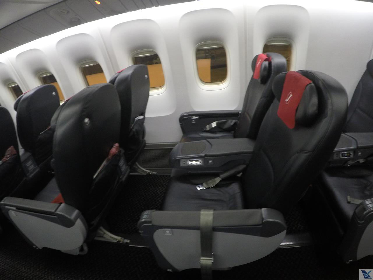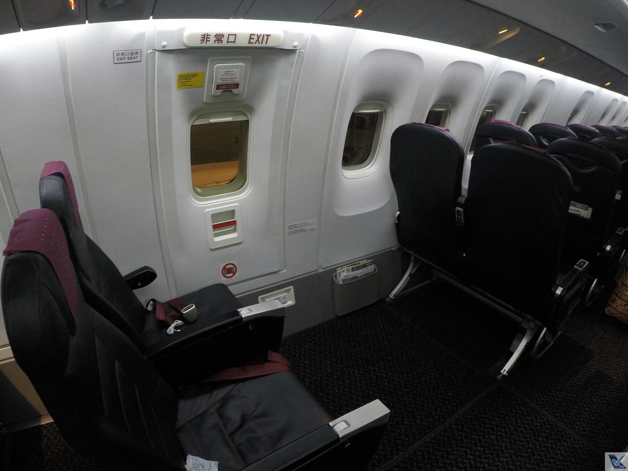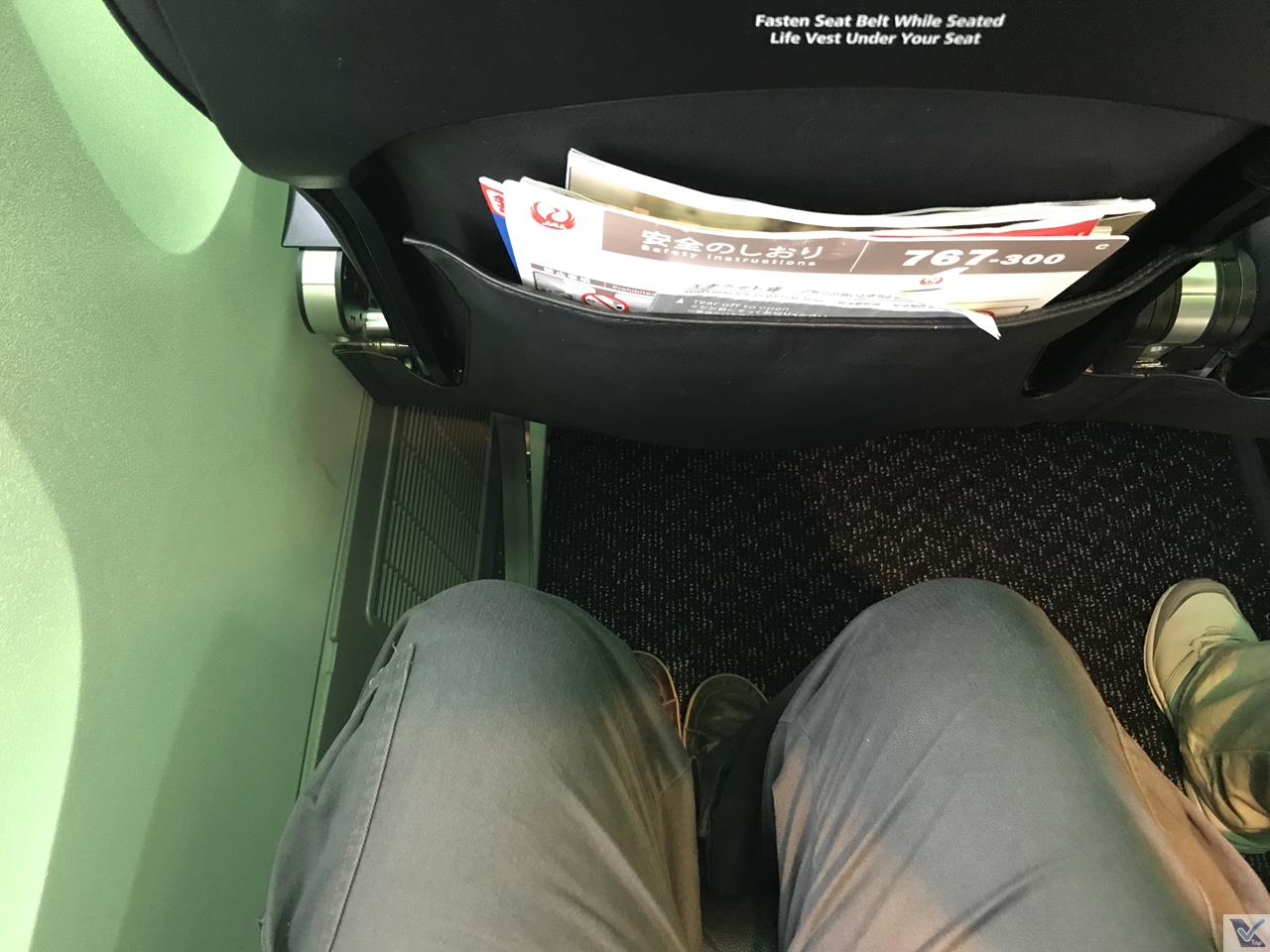 – o interior deste B767 me agradou muito, achei bem bonito, as poltronas eram de couro preto, com o encosto de cabeça na cor roxa, assim como os cintos de segurança; a configuração de cabine tradicional para este modelo: 2 x 3 x 2; no geral, a aeronave estava muito bem conservada pela JAL, “escondendo” um pouco que ela tinha mais de 15 anos de uso
