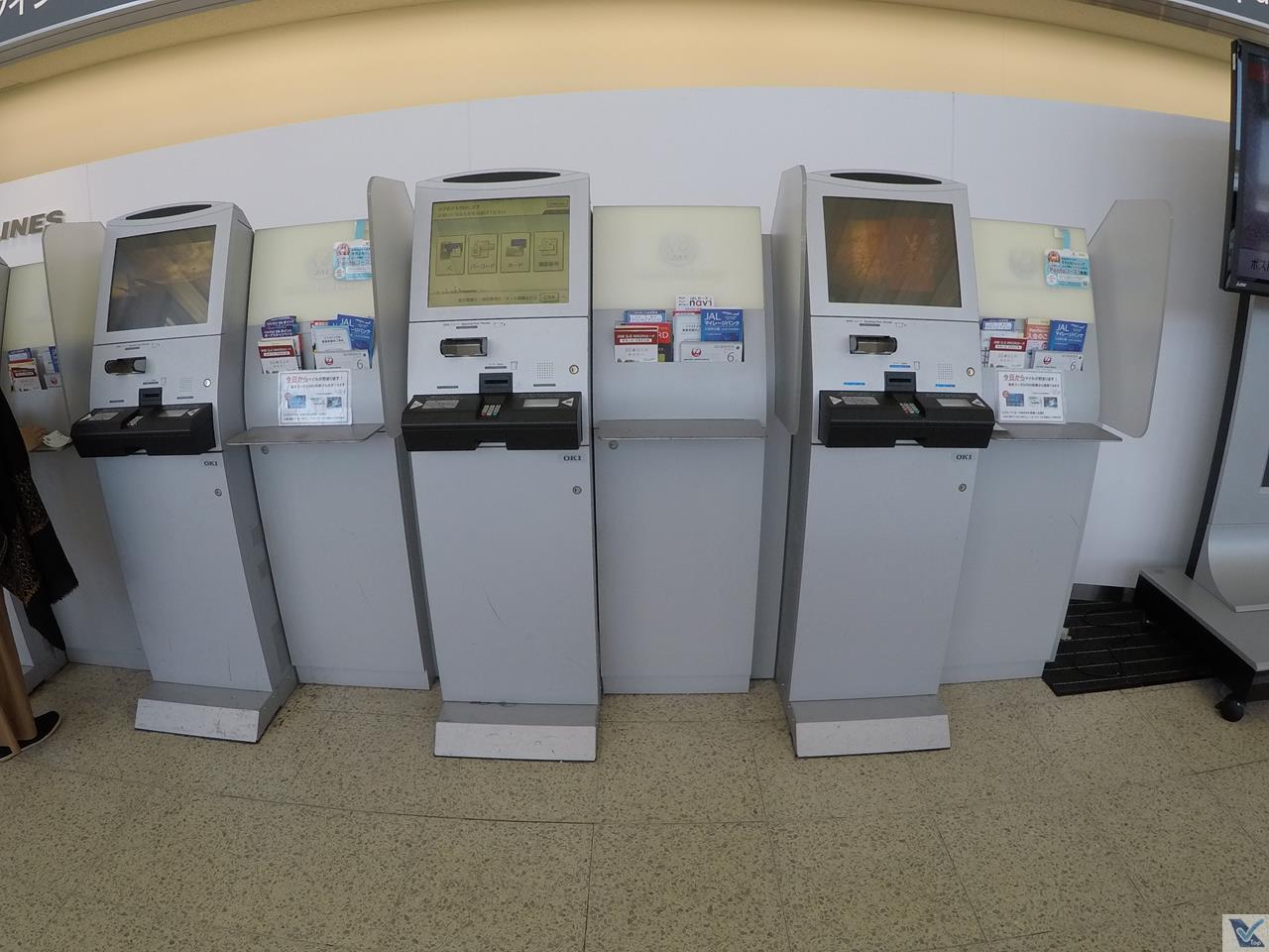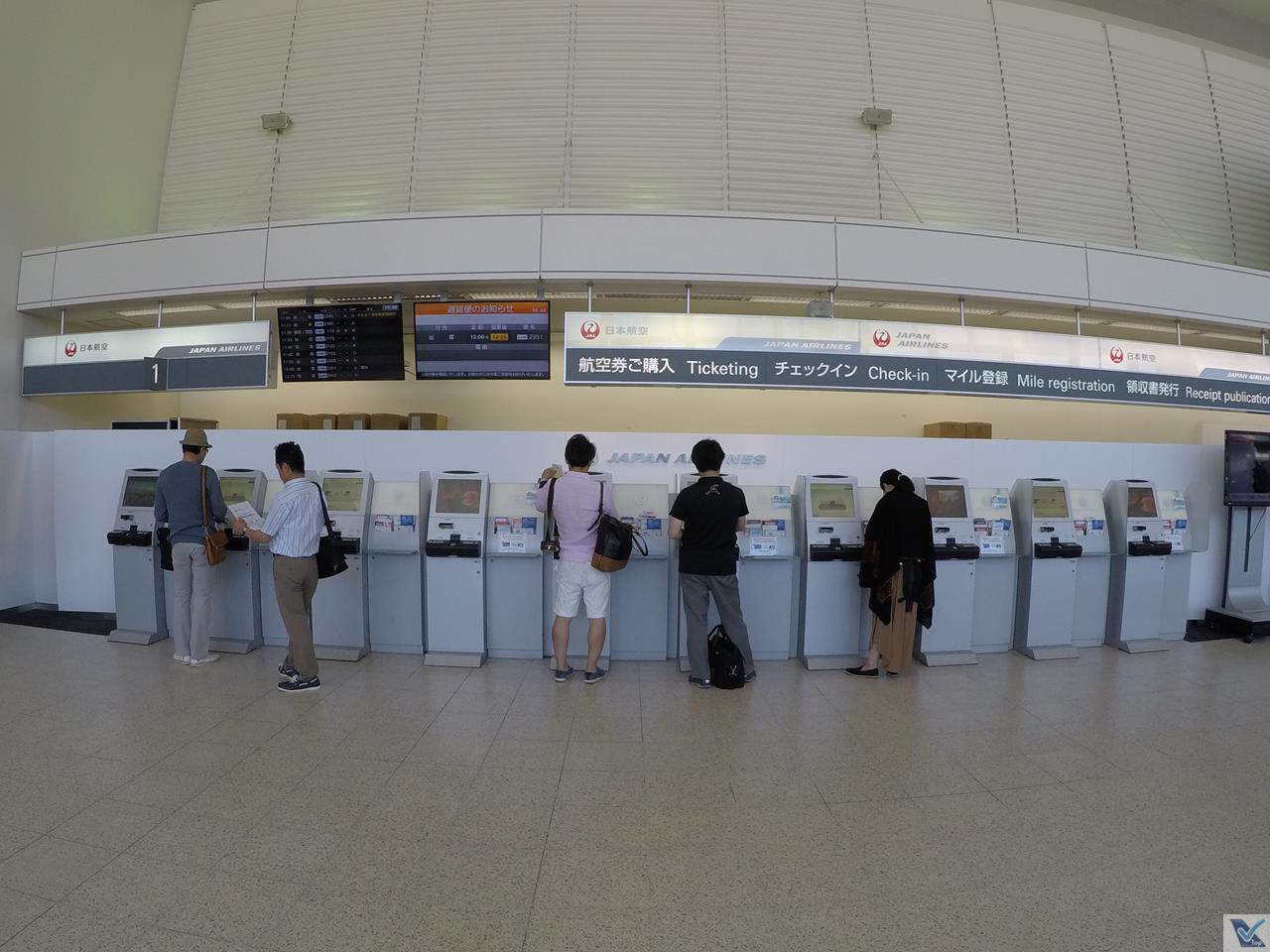 – como sempre, a lógica do processo de check-in é o auto-atendimento dos passageiros, em especial, para os aqueles sem bagabem de mão e que compraram o mesmo tipo de tarifa que eu; já para as pessoas que vão despachar malas, o atendimento da JAL é “a moda antiga“, com um funcionário da companhia no balcão etiquetando malas e as colocando na esteira; me chamou a atenção que um controle de raio-x é executado antes do atendimento no balcão