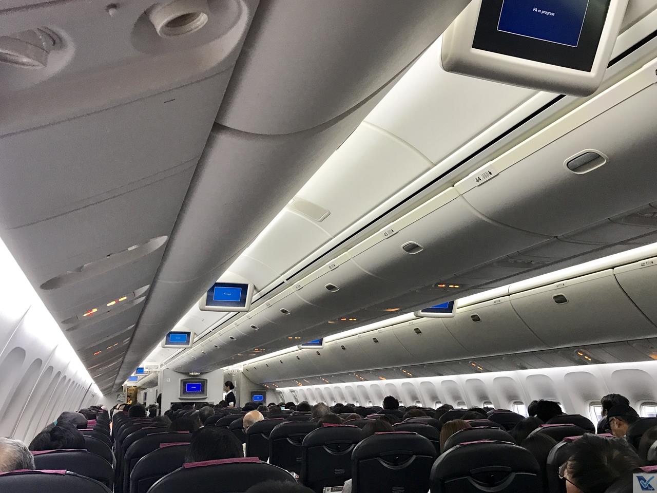 – o sistema de vídeo era coletivo, as pequenas telas com baixa resolução instaladas no teto do corredor da classe Econômica indicavam que era um avião mais antigo; na parede que divide as cabines do B767 uma tela maior estava instalada; o fone de ouvido era bem básico e estava em cima de cada poltrona; o controle remoto está instalado na parte de cima no braço da cadeira