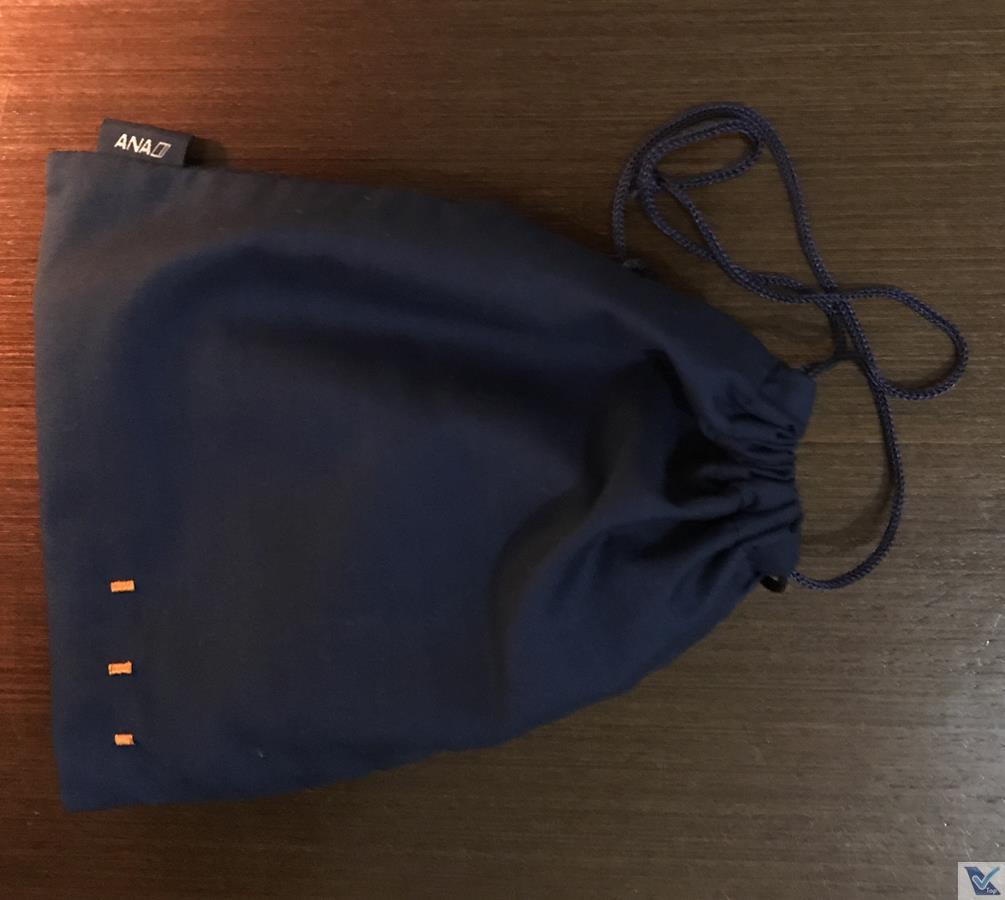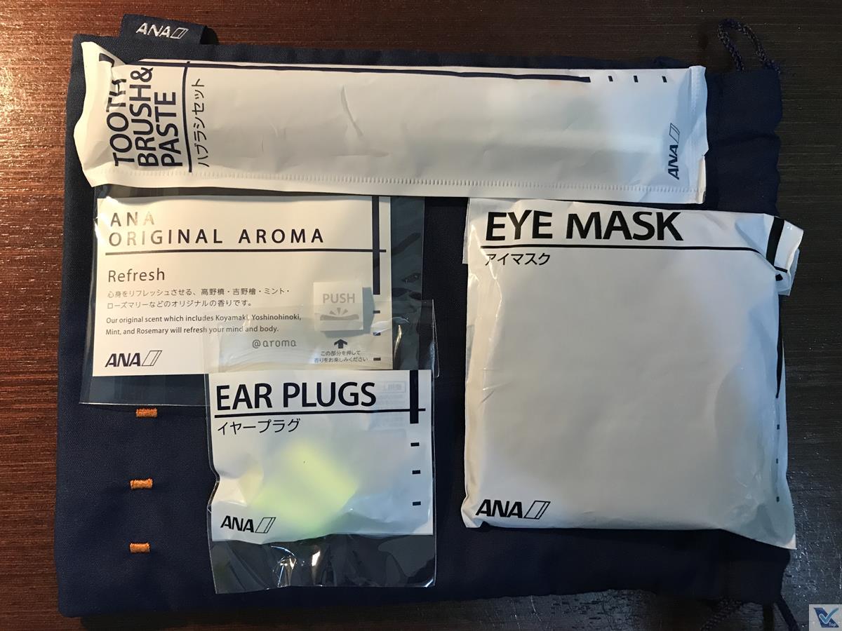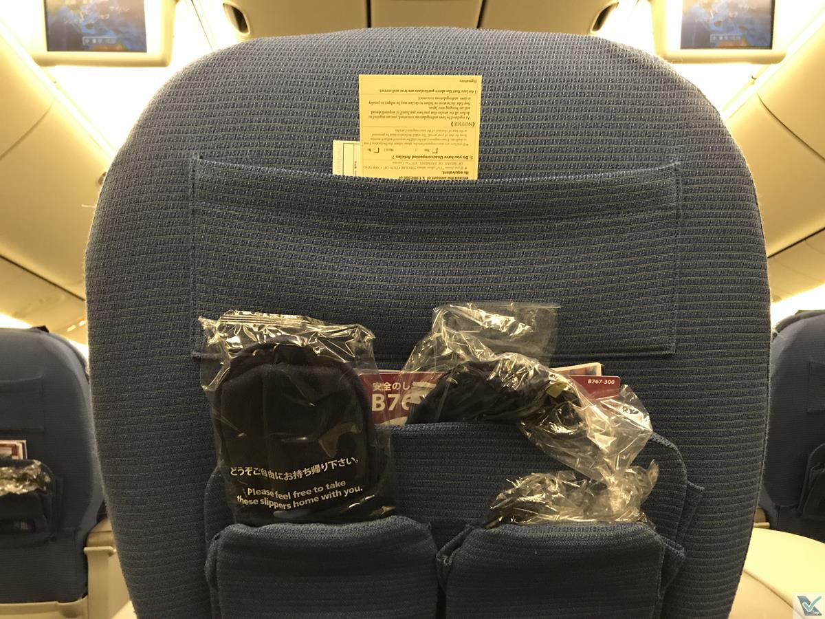 – em cima de cada assento tinha um cobertor e um travesseiro; na parte de trás da poltrona da frente, a ANA oferece um par de “pantufas”, o fone de ouvido (bem simples, com a logo marca da companhia) e uma “tentativa” de necessaire (era um saquinho de tecido azul bem básico contendo um par de meias, kit de pasta/escova de dentes, protetor auricular e lencinho)