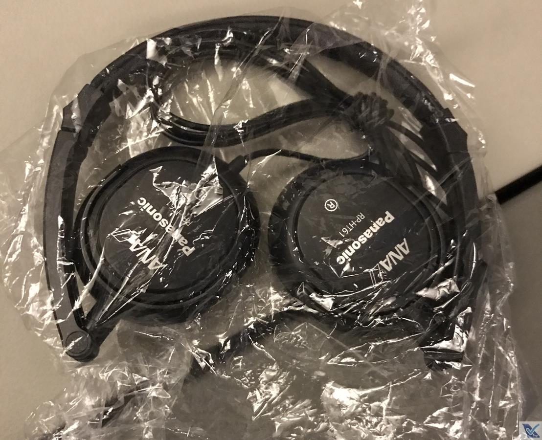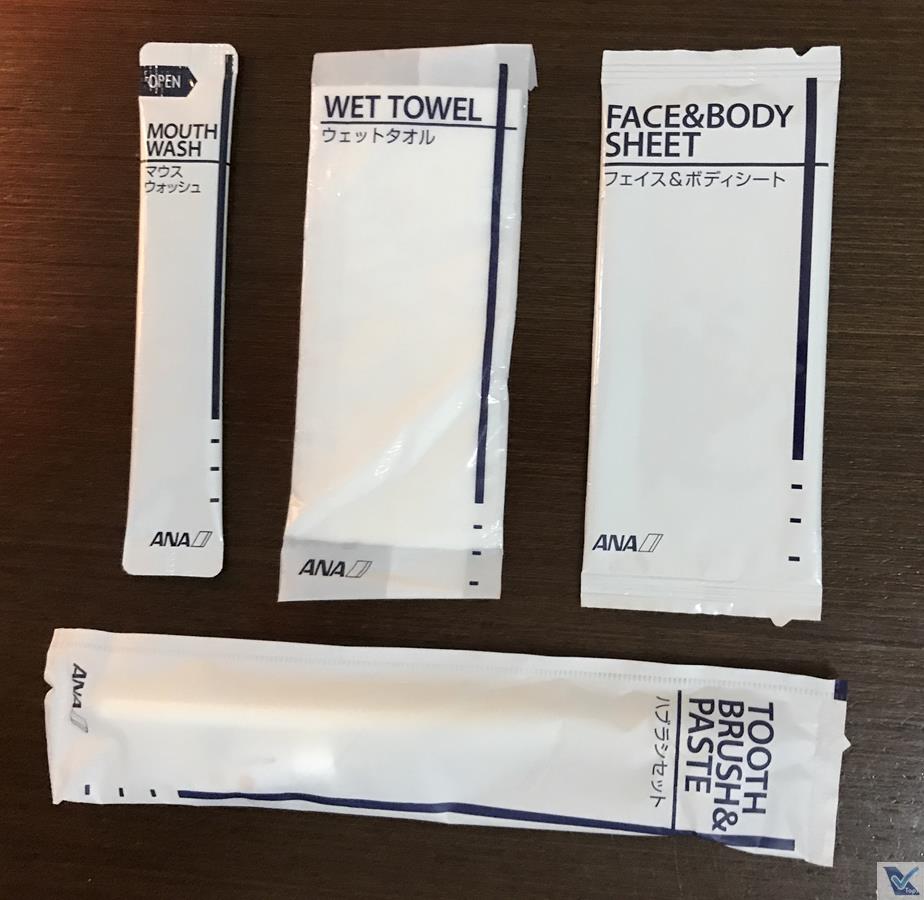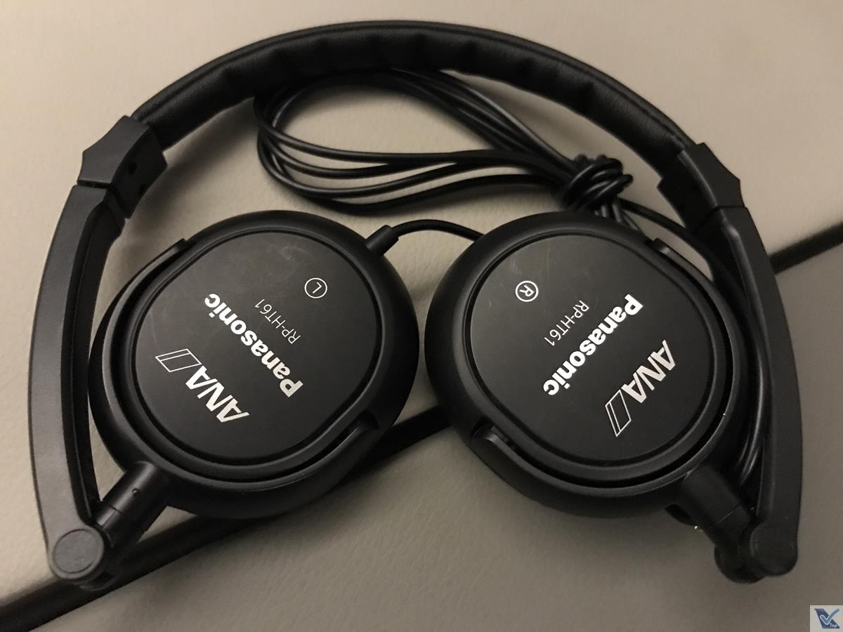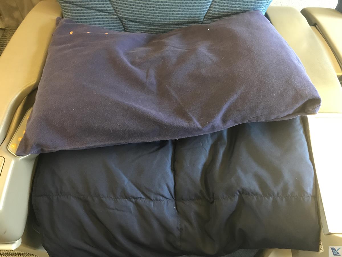 – em cima de cada assento tinha um cobertor e um travesseiro; na parte de trás da poltrona da frente, a ANA oferece um par de “pantufas”, o fone de ouvido (bem simples, com a logo marca da companhia) e uma “tentativa” de necessaire (era um saquinho de tecido azul bem básico contendo um par de meias, kit de pasta/escova de dentes, protetor auricular e lencinho)