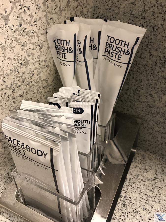 – levantei às 01:20h para ir e conhecer o banheiro instalado na parte frontal do Boeing: de bom tamanho e com algumas amenidades disponíveis aos passageiros da Business Class: kit de pasta/escova de dente, refrescante bucal e lenços umedecidos